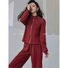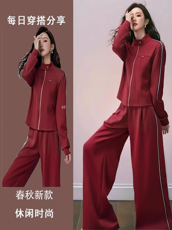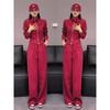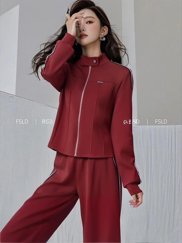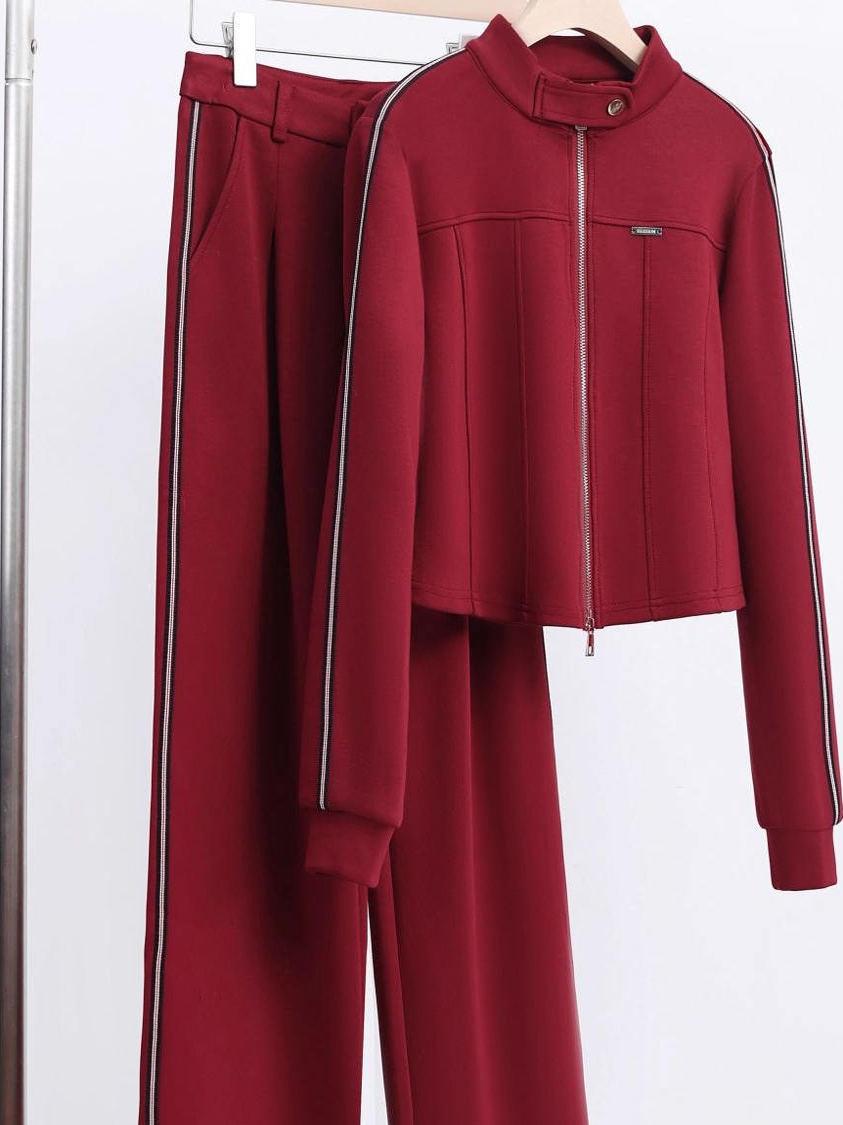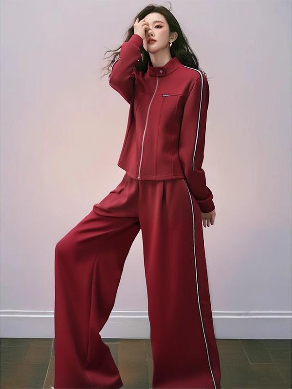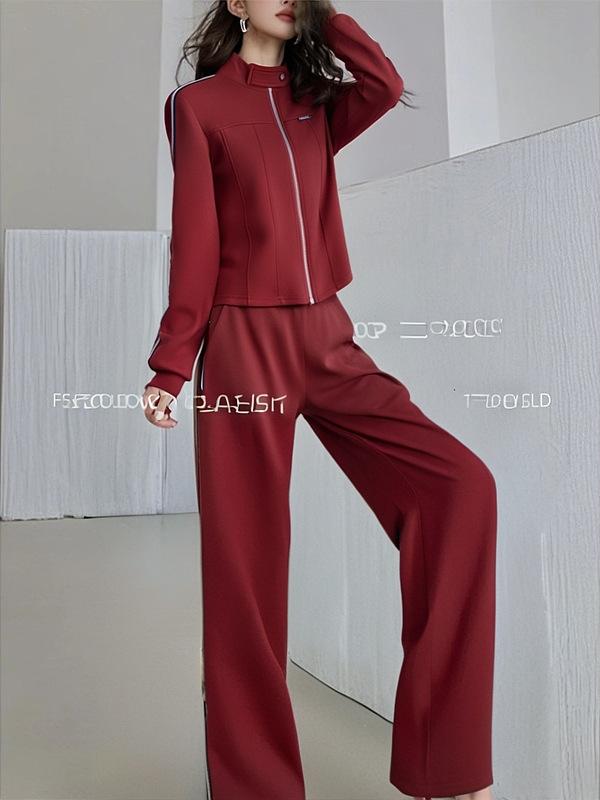 2025 Primavera Nueva Moda Rojo Chaqueta Corta con Cremallera Cuello Alto Casual Pantalón Deportivo Conjunto de Dos Piezas