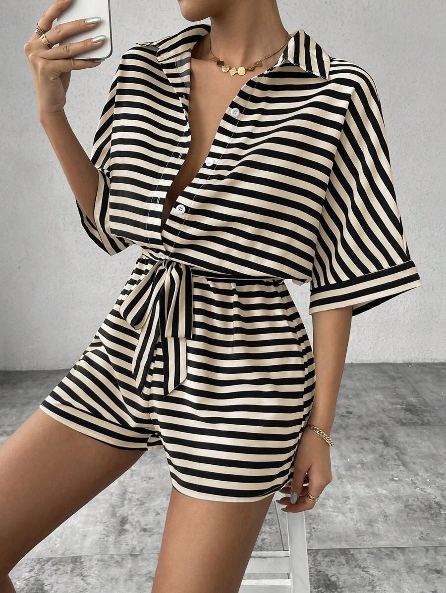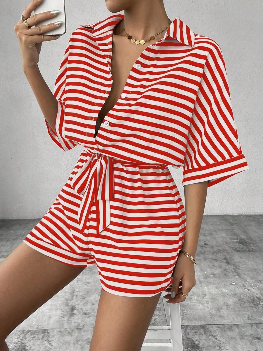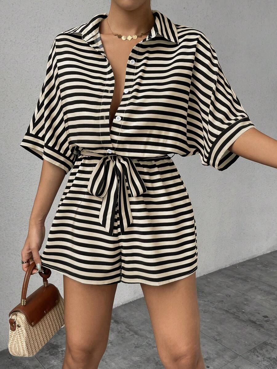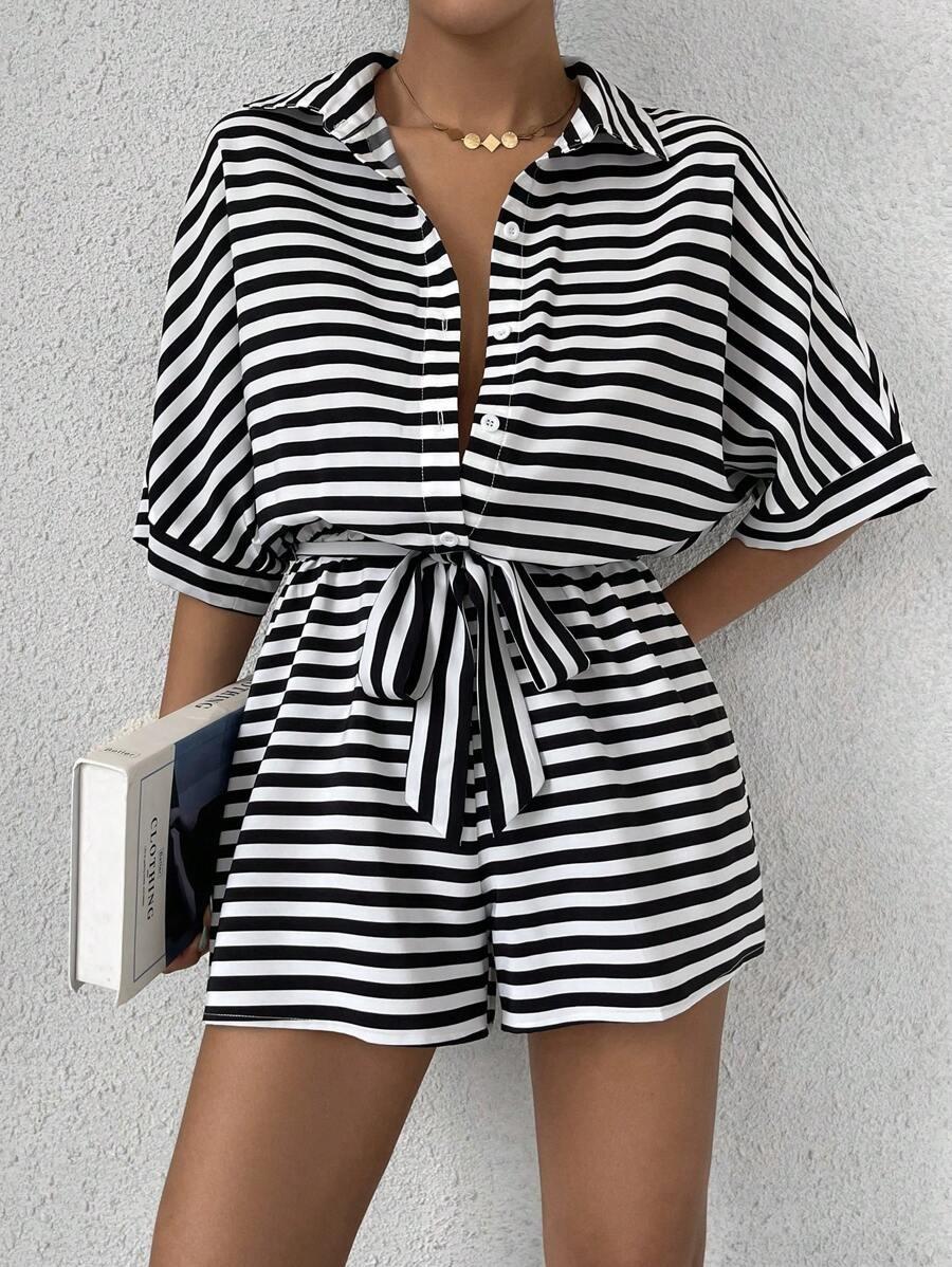 Traje de una pieza nuevo para mujer con cordones de encaje a rayas europeo y americano transfronterizo, camisa, shorts, moda casual holgada, Amazon Mujer