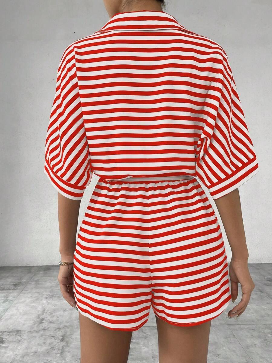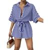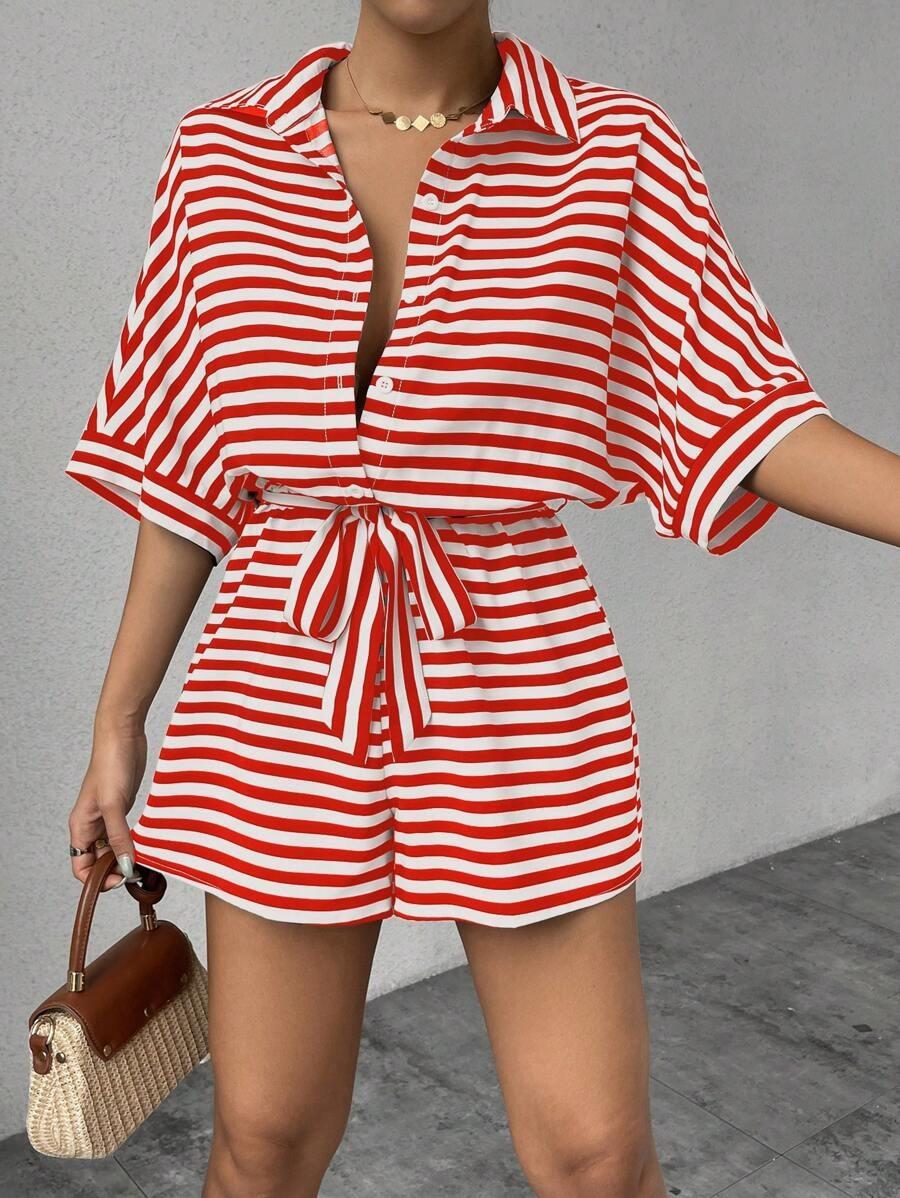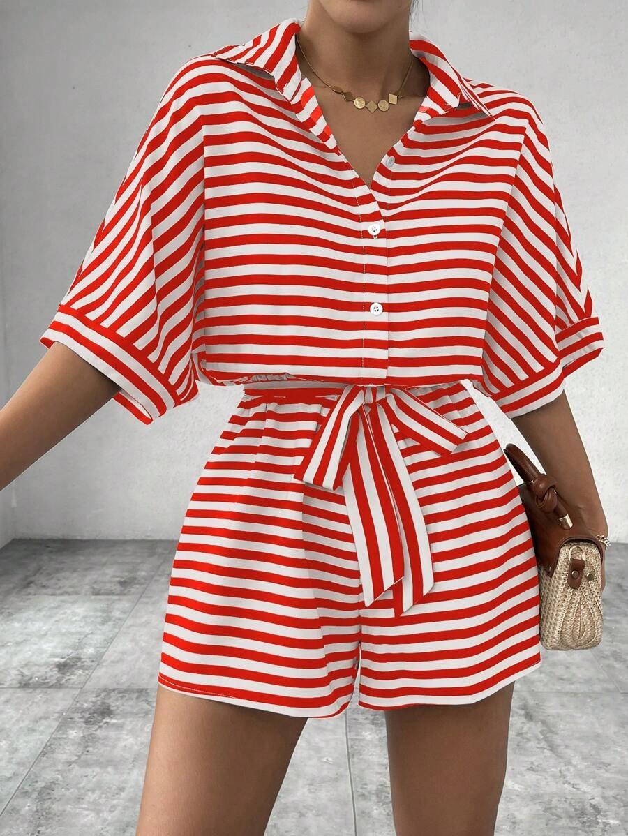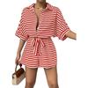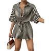 Traje de una pieza nuevo para mujer con cordones de encaje a rayas europeo y americano transfronterizo, camisa, shorts, moda casual holgada, Amazon Mujer