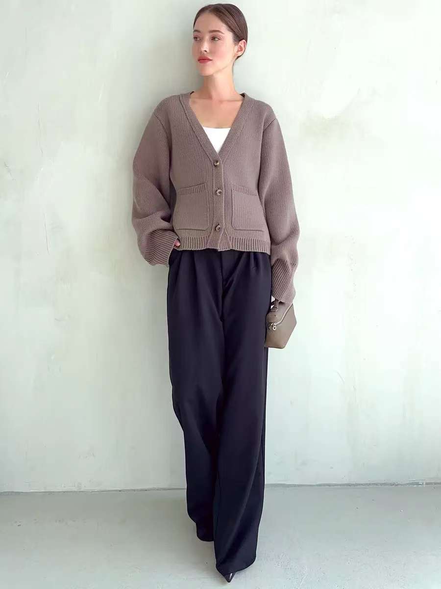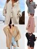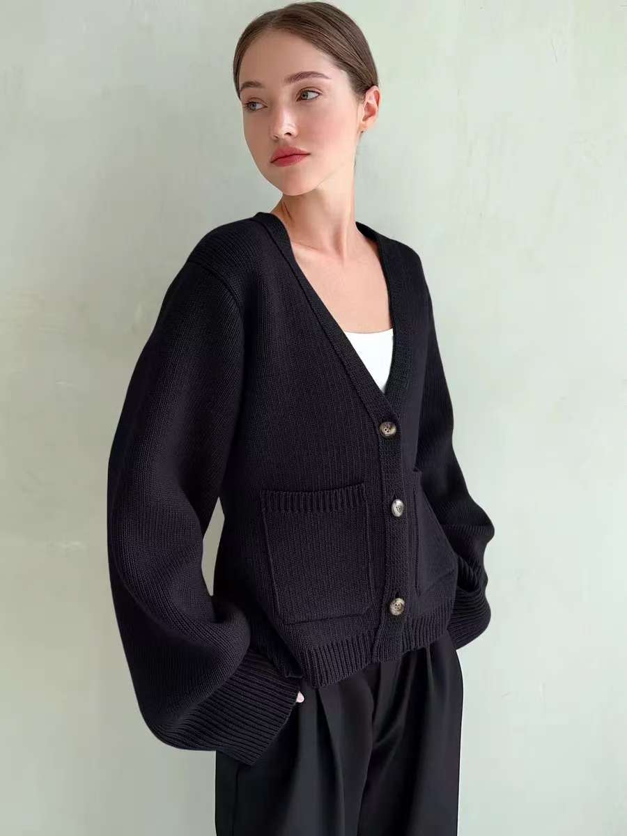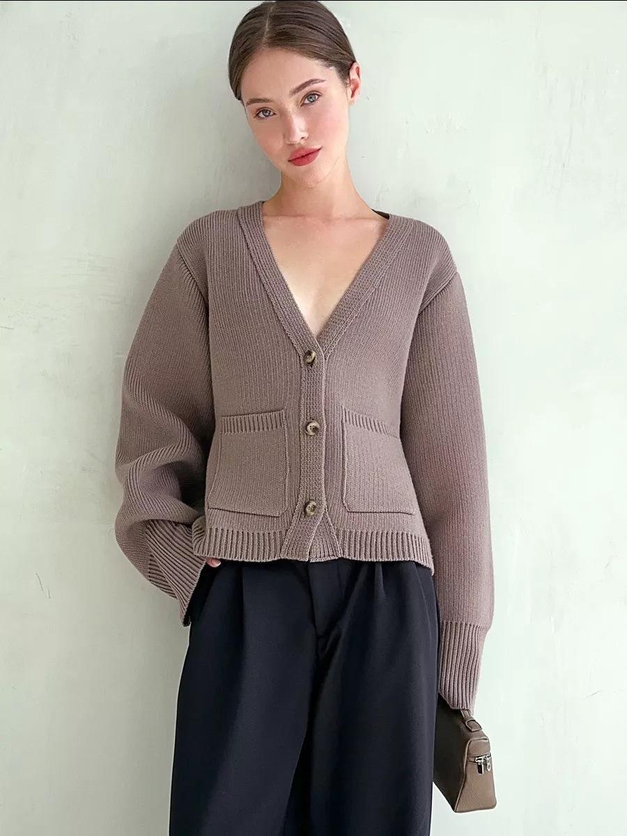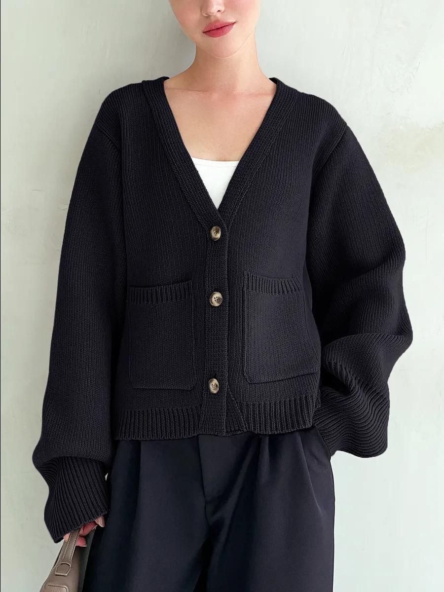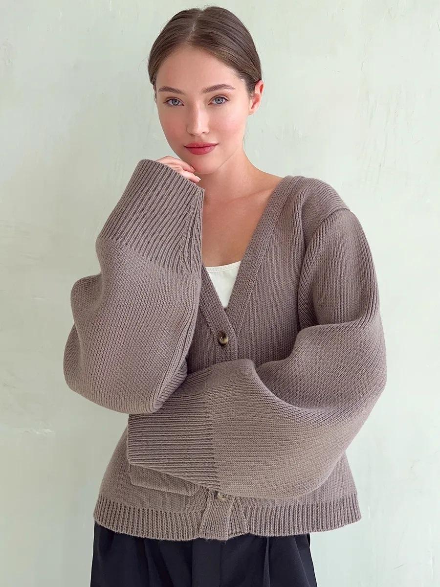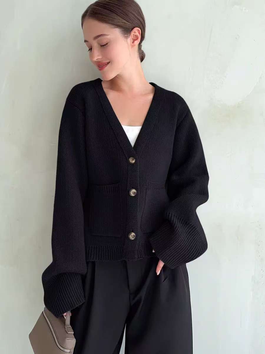 Cárdigan de punto de bolsillo con cuello en V cruzado europeo y americano 2025 Otoño e Invierno Nuevo Suéter de exportación de manga larga holgado de moda para mujer