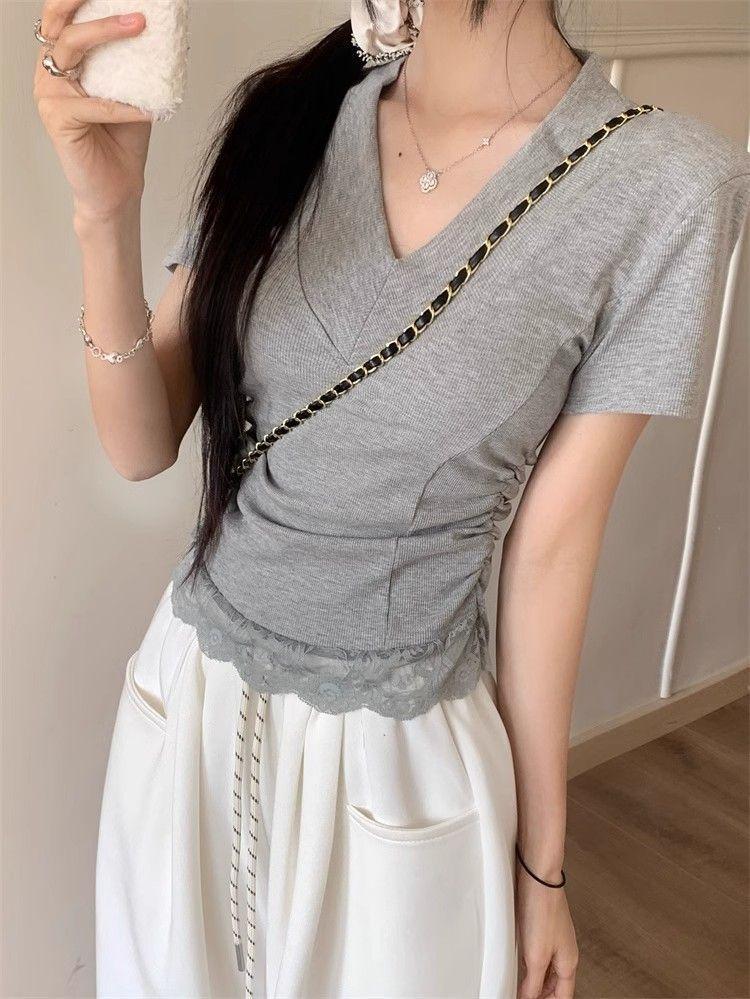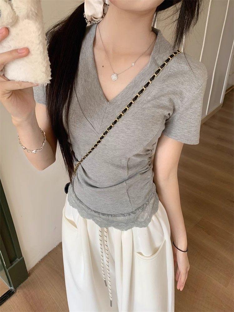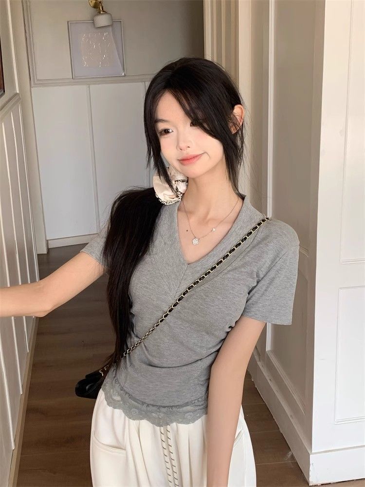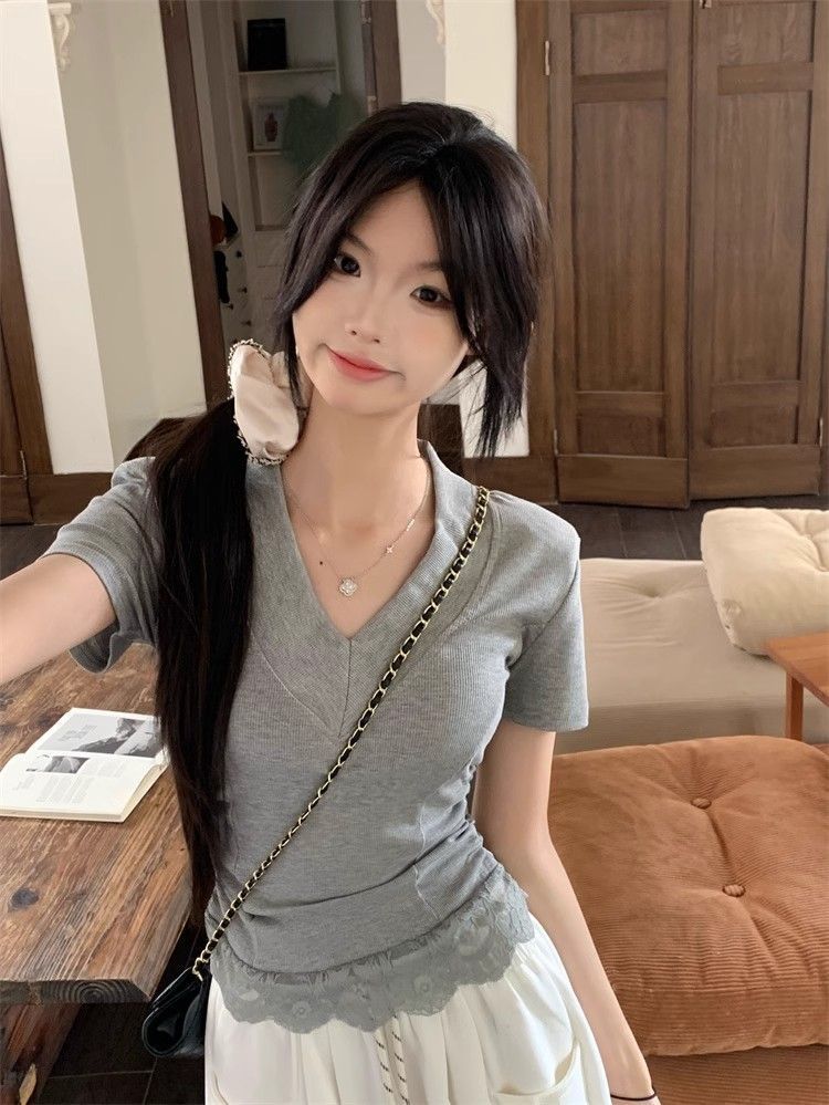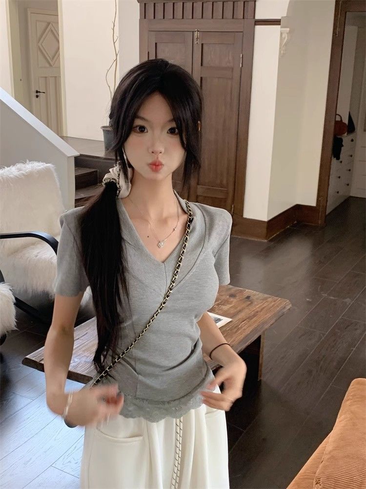 Deseo Puro Sexy Estilo Chica Caliente Cuello en V Encaje Patchwork Manga Corta Camiseta de Verano para Mujer Nueva Ajustada Camiseta Base Top