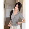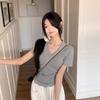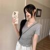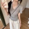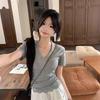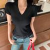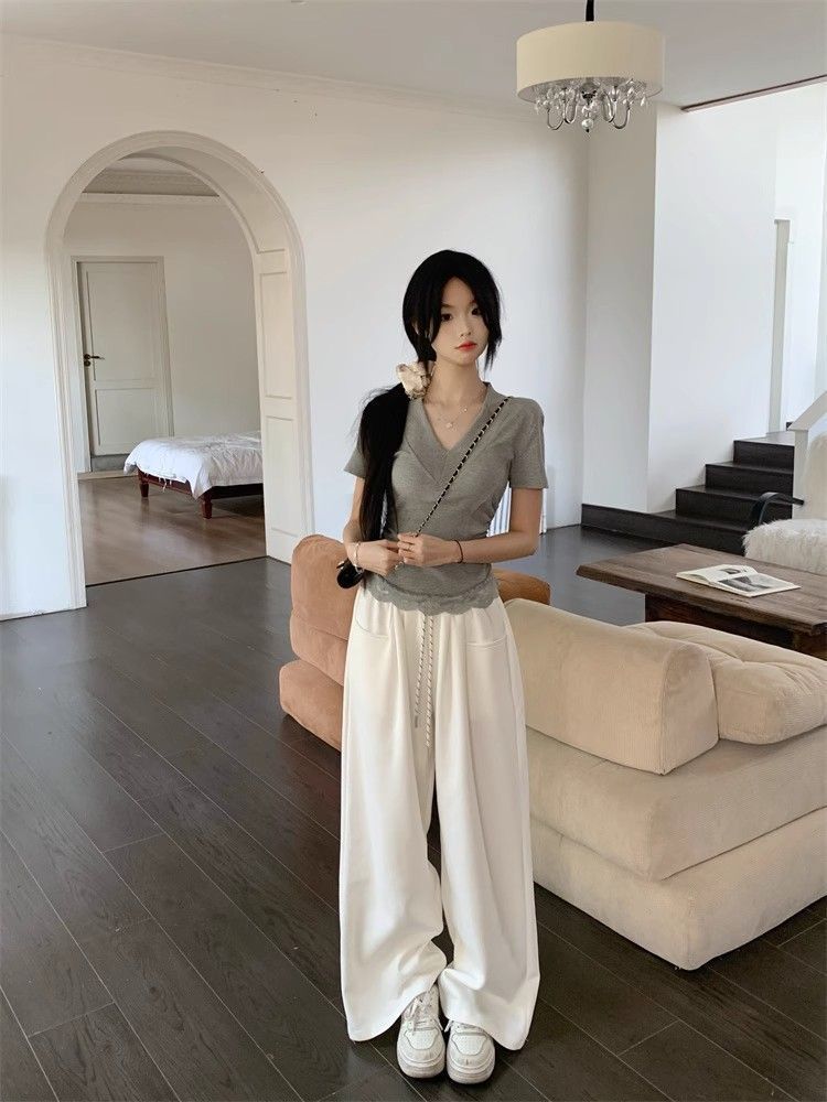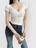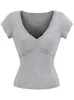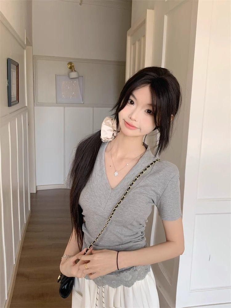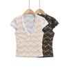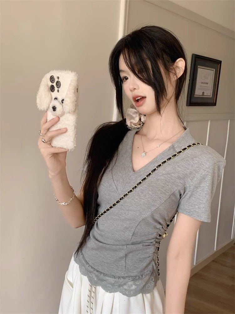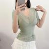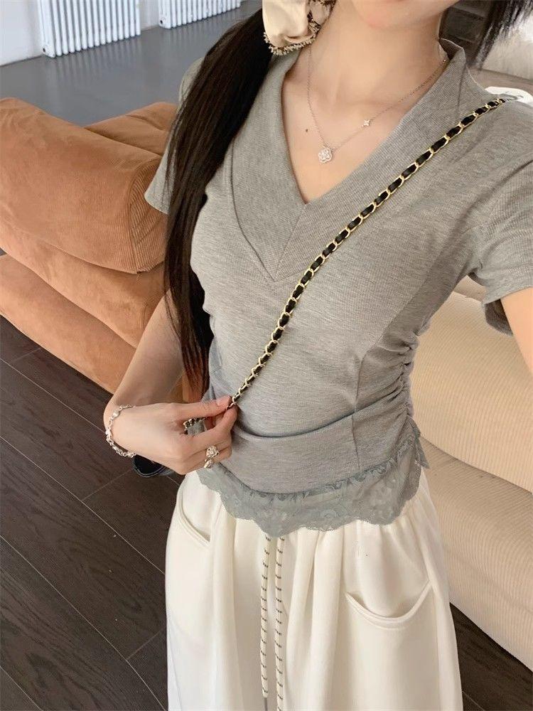 Deseo Puro Sexy Estilo Chica Caliente Cuello en V Encaje Patchwork Manga Corta Camiseta de Verano para Mujer Nueva Ajustada Camiseta Base Top