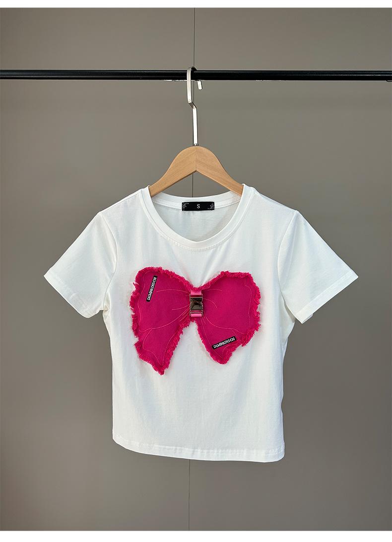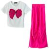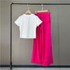 White t-shirt and rose red trousers