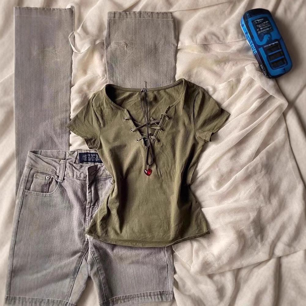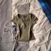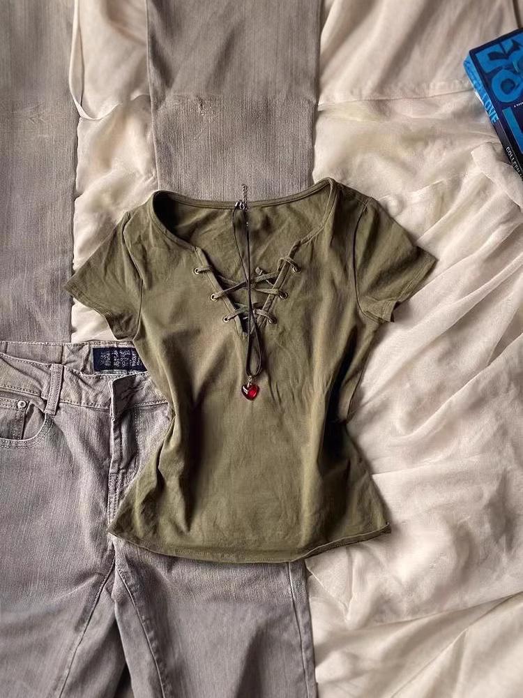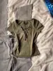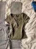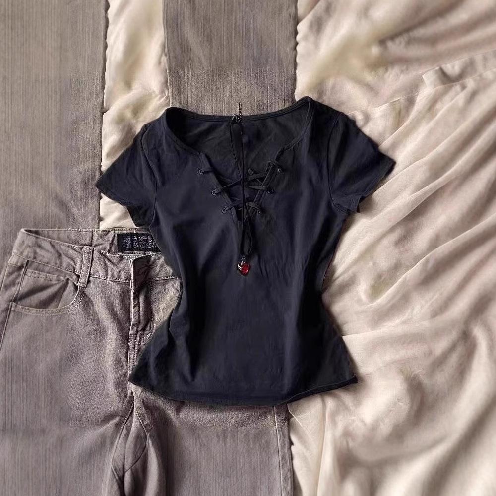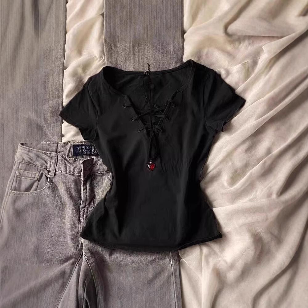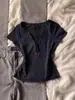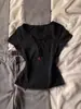 Playera Retro Americana Negra con Cuello en V y Tirantes de Manga Corta para Mujer Verano Nuevo Cintura Ajustada Sexy Top Corto de Cintura Alta
