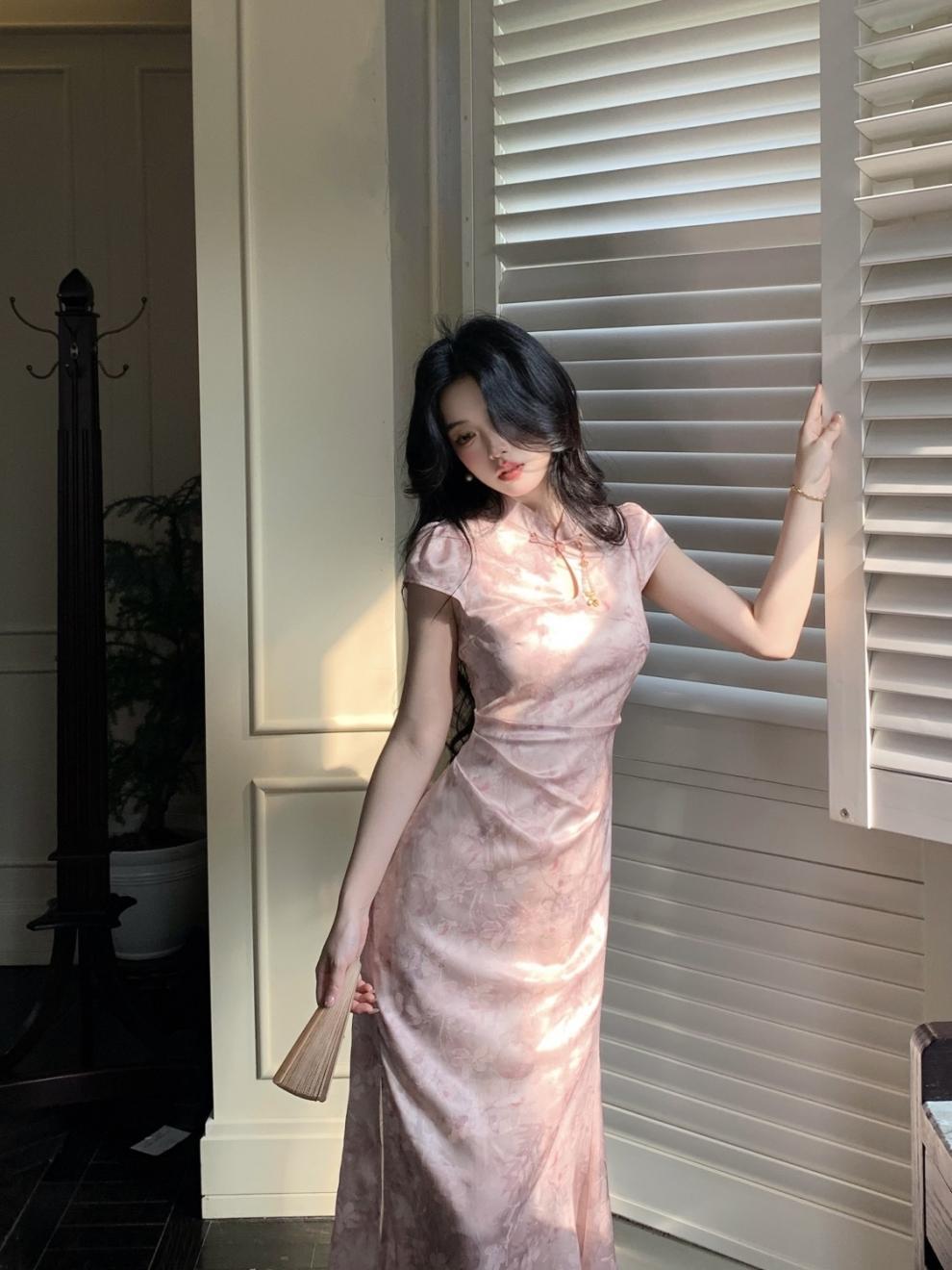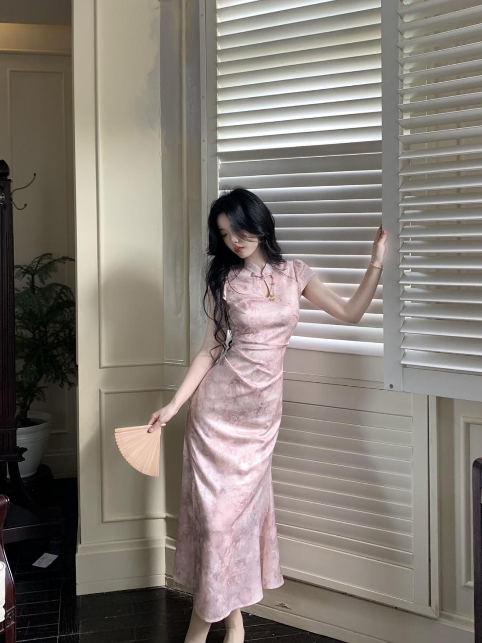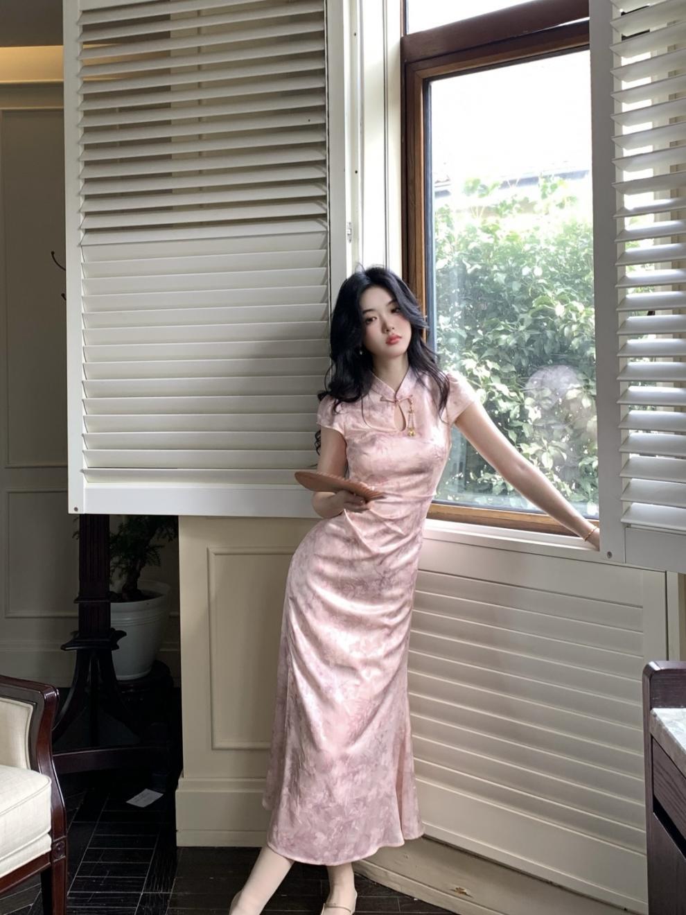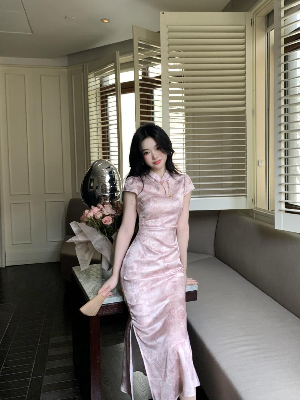 Vestido Cheongsam de Manga Corta Mejorado Estilo Chino Nuevo con Cuello Pequeño Jacquard Sueño de Bambú Rosa Superficie Forjada Hombro en Ángulo Recto