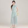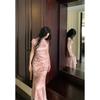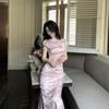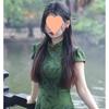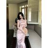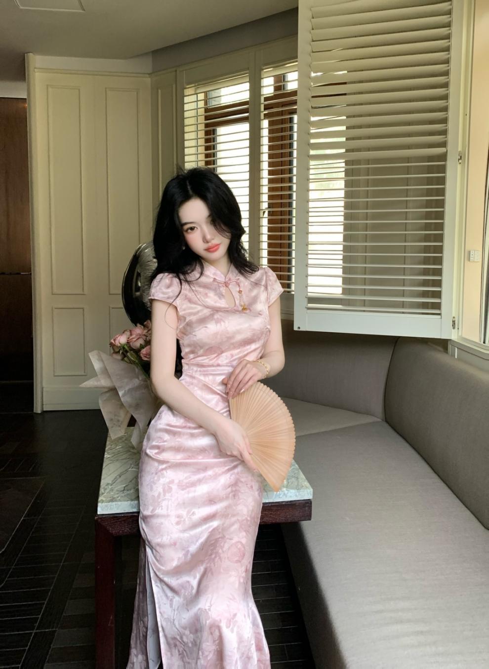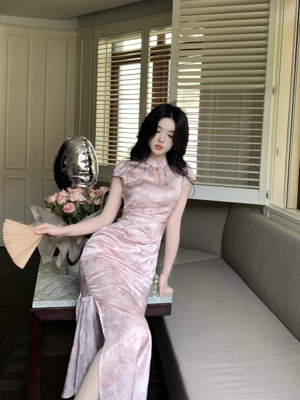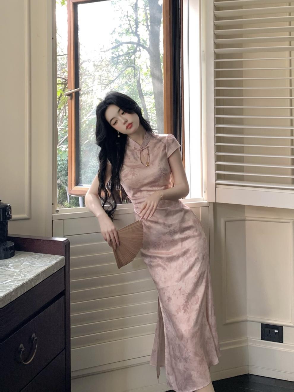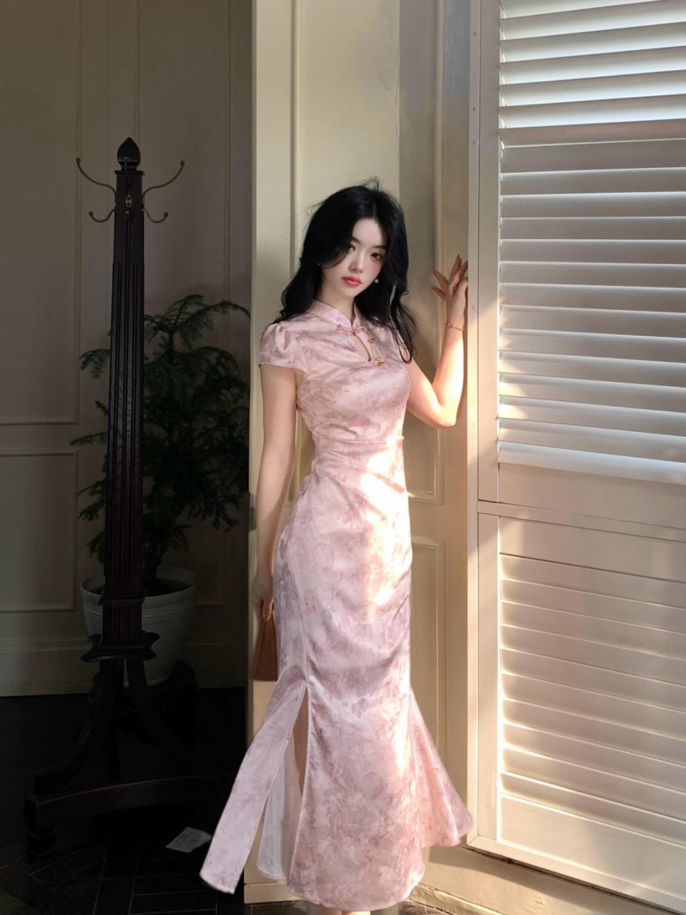 Vestido Cheongsam de Manga Corta Mejorado Estilo Chino Nuevo con Cuello Pequeño Jacquard Sueño de Bambú Rosa Superficie Forjada Hombro en Ángulo Recto
