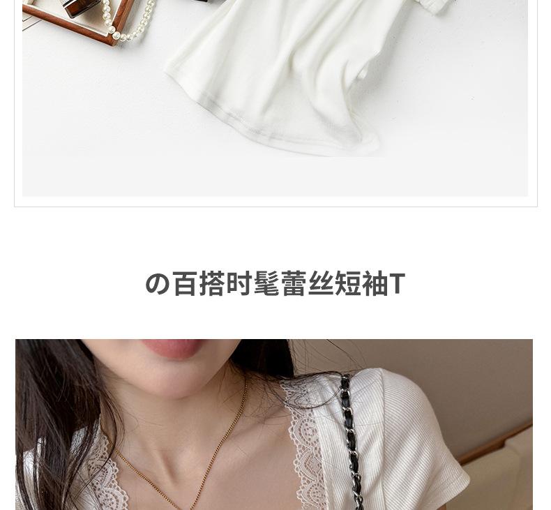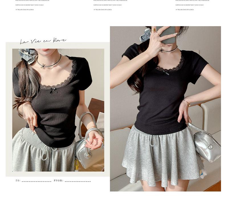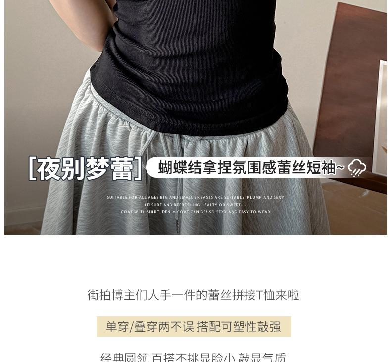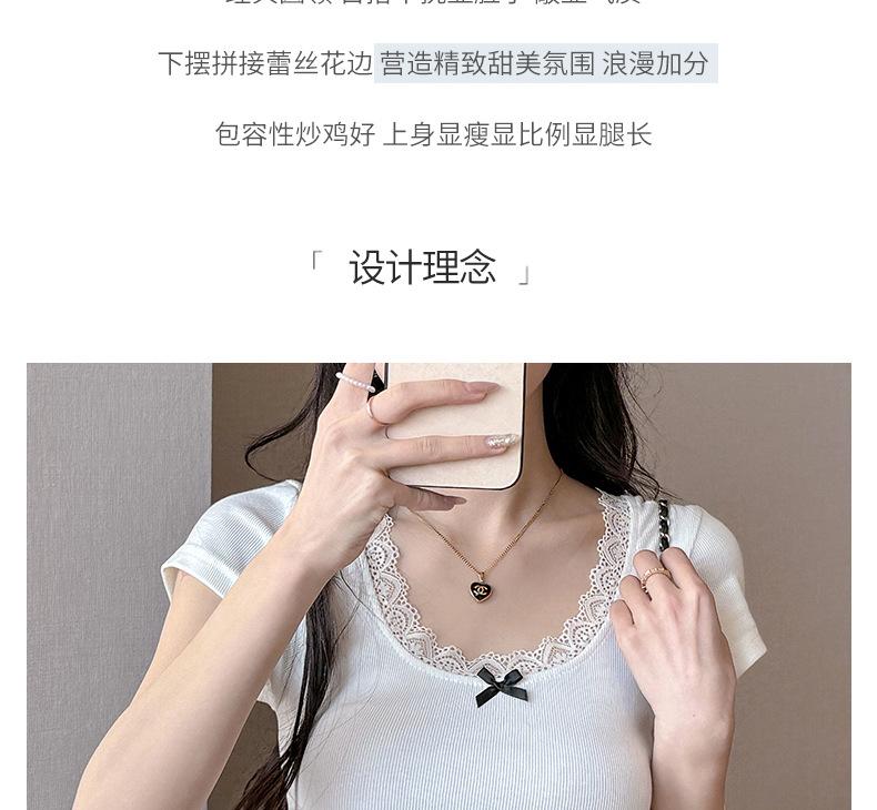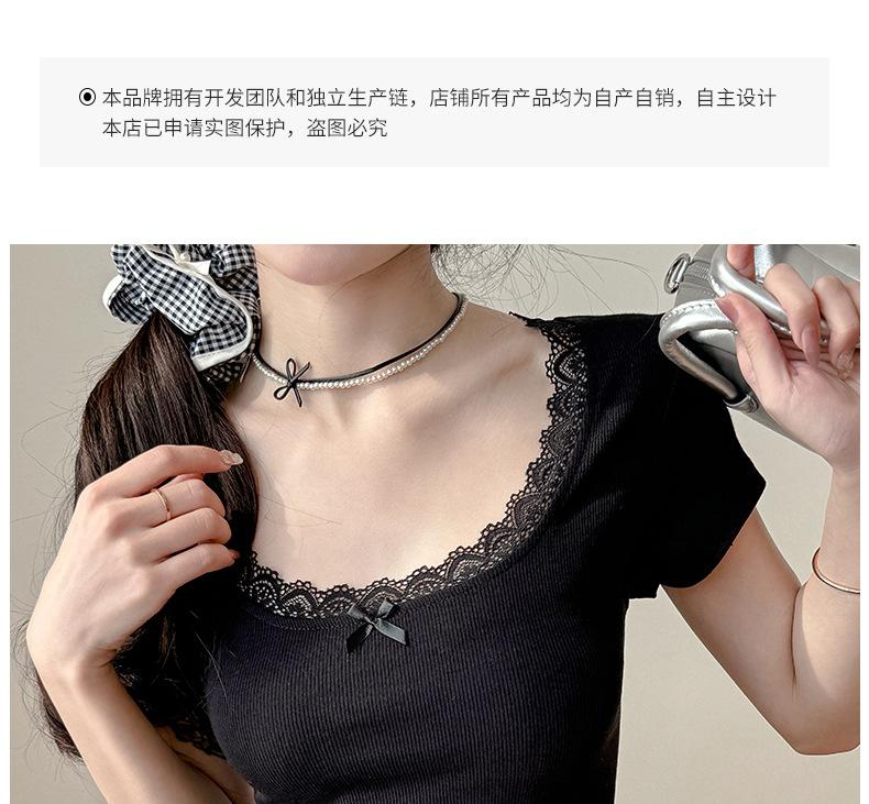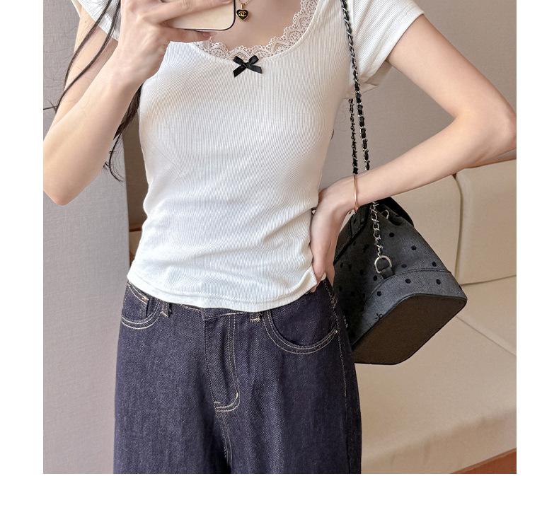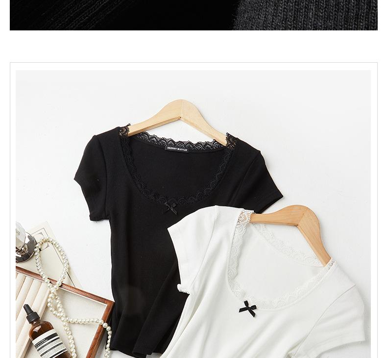 Camiseta de Manga Corta con Lazo de Encaje Blanco Seleccionado Estrictamente para Mujer, Verano, Cuello Redondo, Combinación con Todo, Transpirable, Camiseta Base