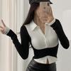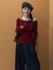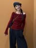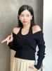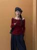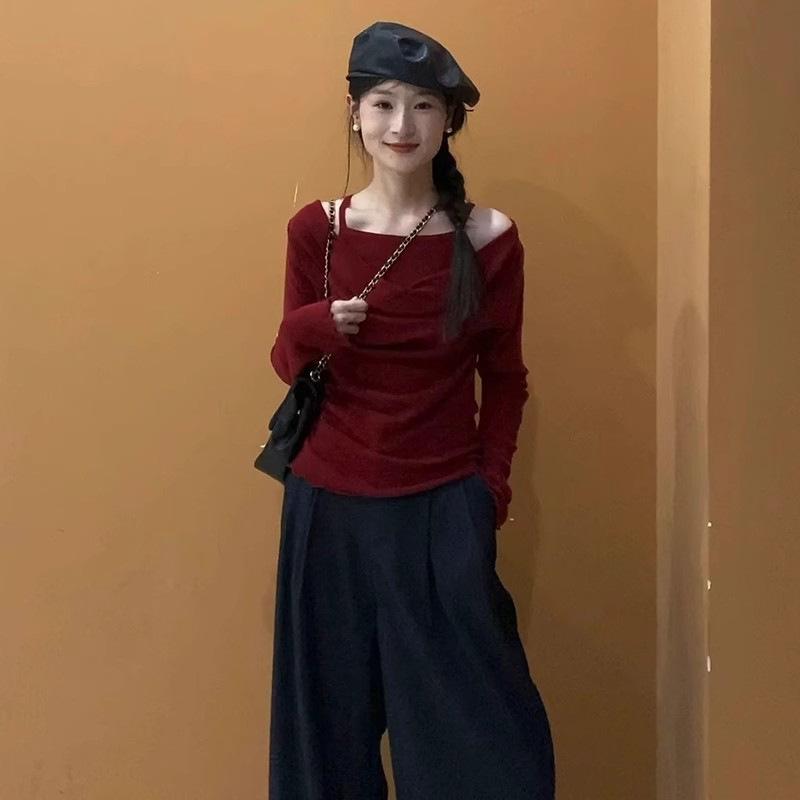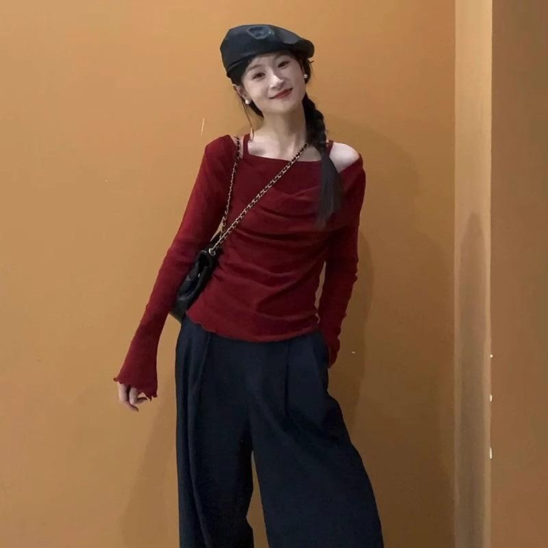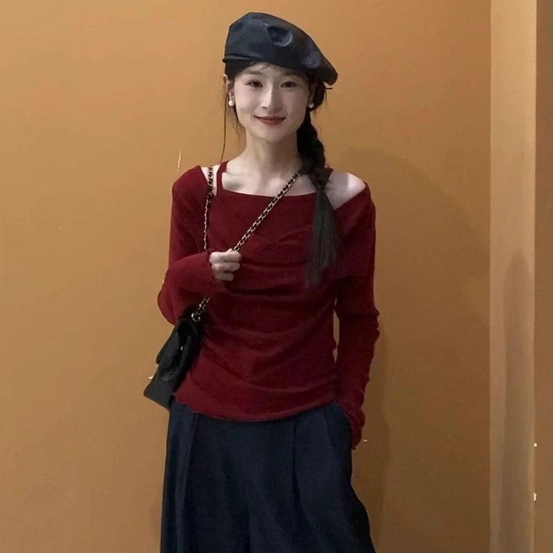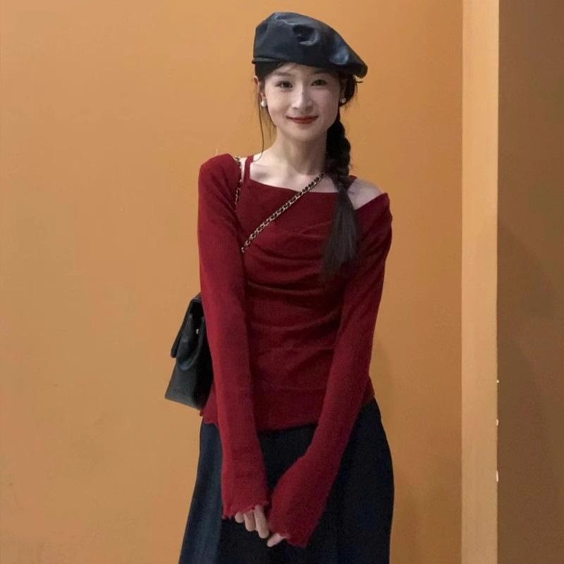 Sexy Spice Girl Rojo Falso Dos Piezas Hombro Descubierto Camiseta de Punto para Mujer Primavera y Otoño Ajuste Delgado Diseño Adelgazante Sentido de la Moda Top Combinable