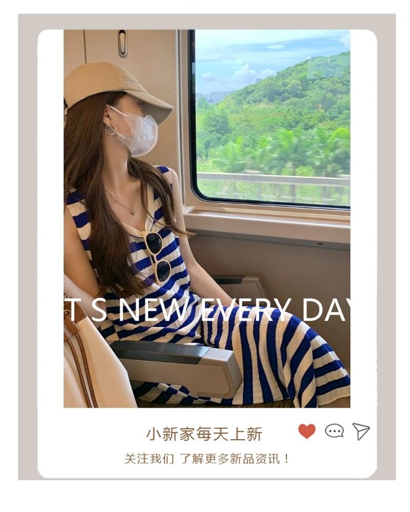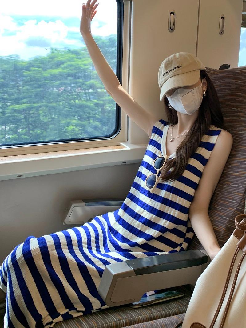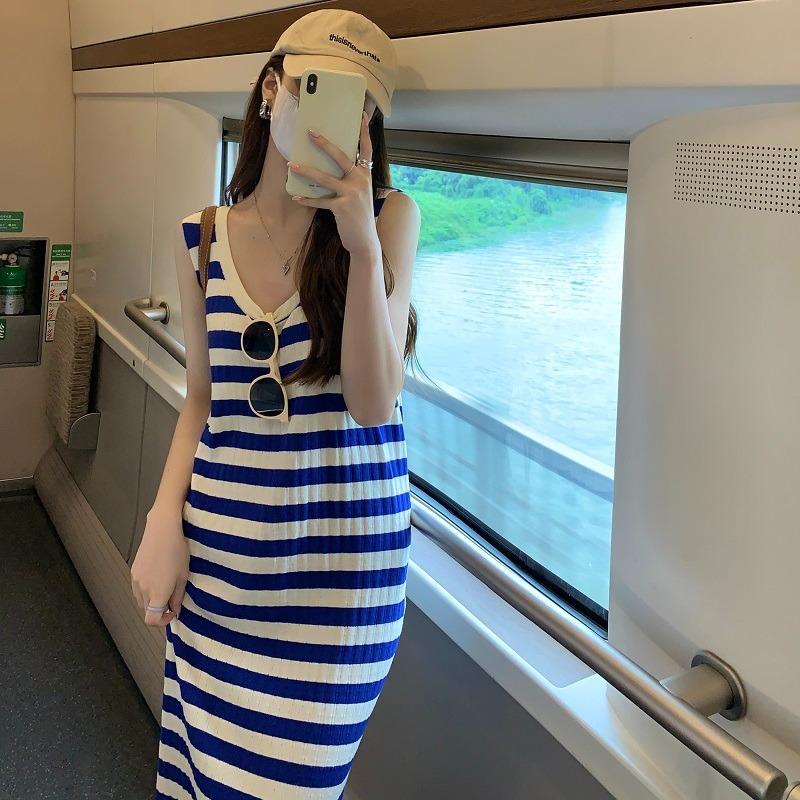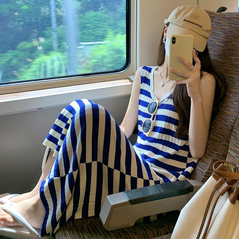 Vestido de Tirantes Rayado Vestido Largo de Verano para Mujer Ropa de Viaje Sanya Vestido de Playa para Vacaciones Junto al Mar Vestido Pequeño