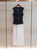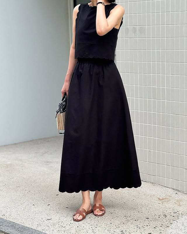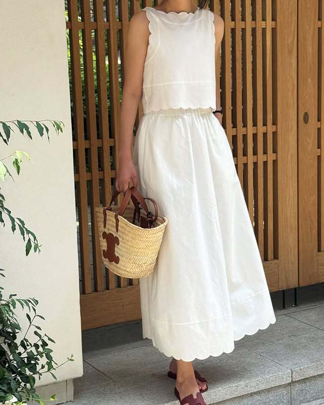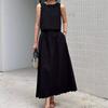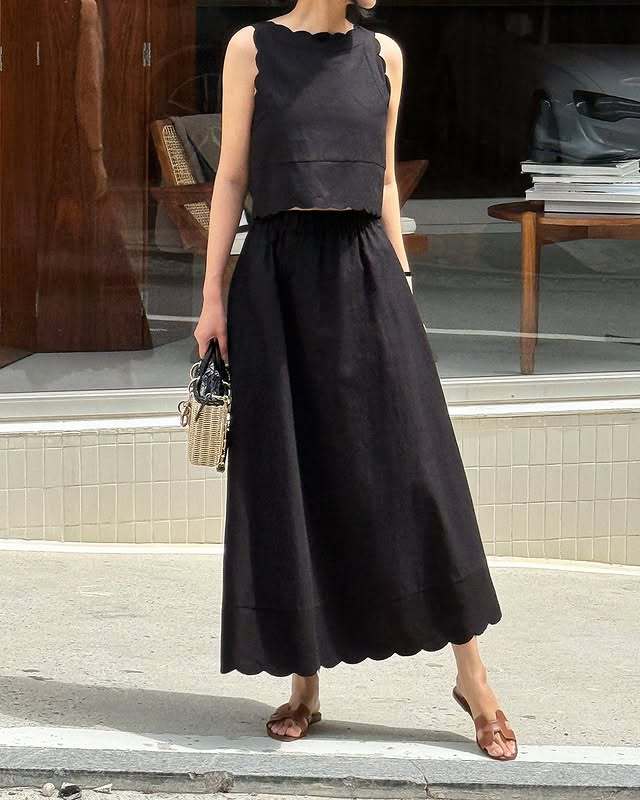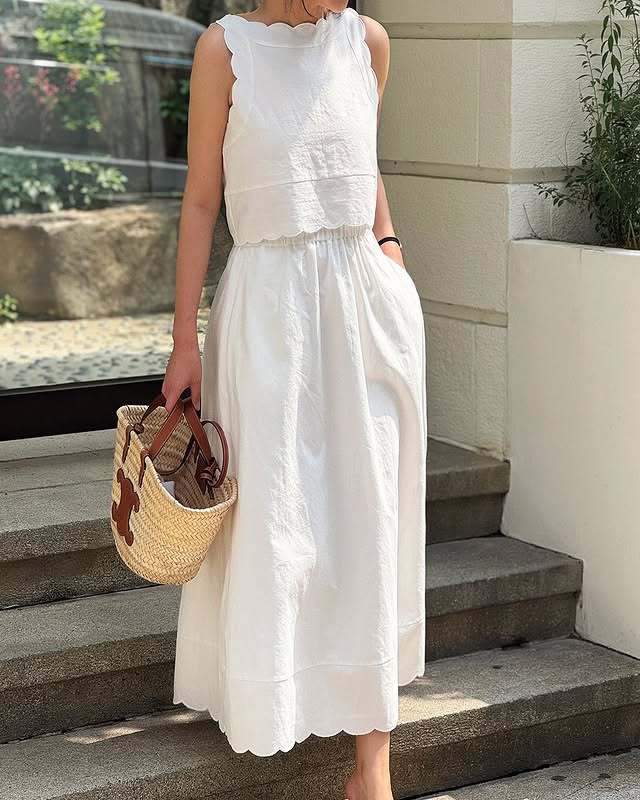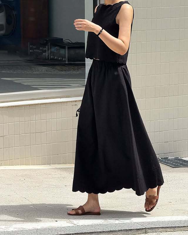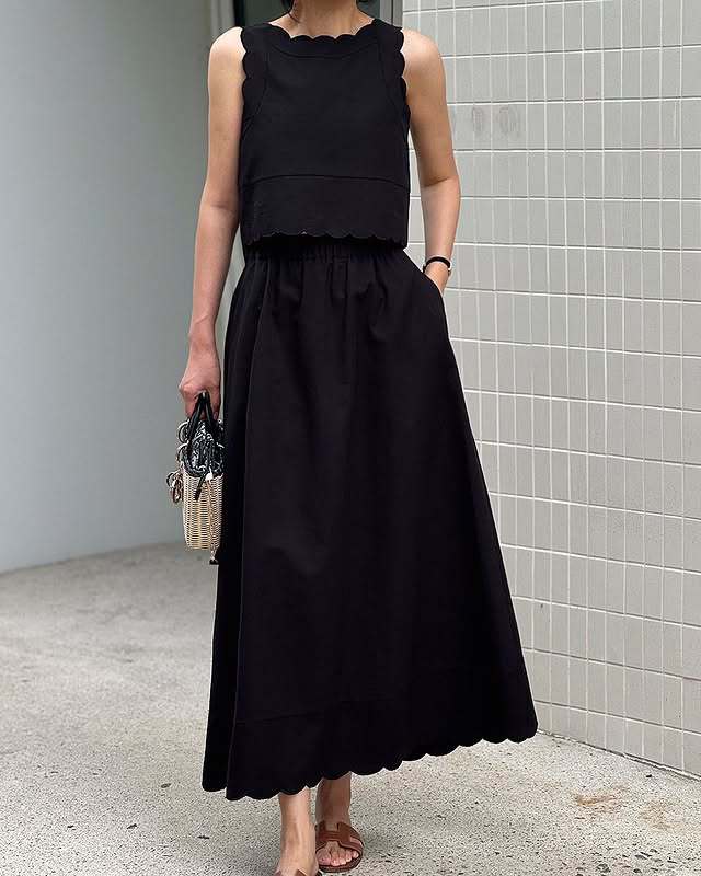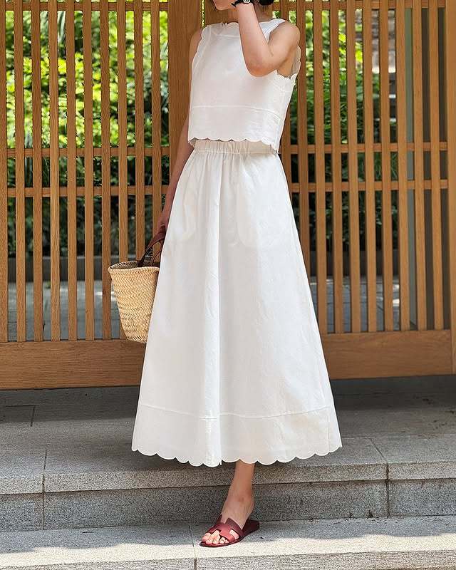 Chic Coreano Verano Estilo Francés Versátil Top Chaleco Borde Ondulado + Falda Línea A Cintura Alta Traje de Moda