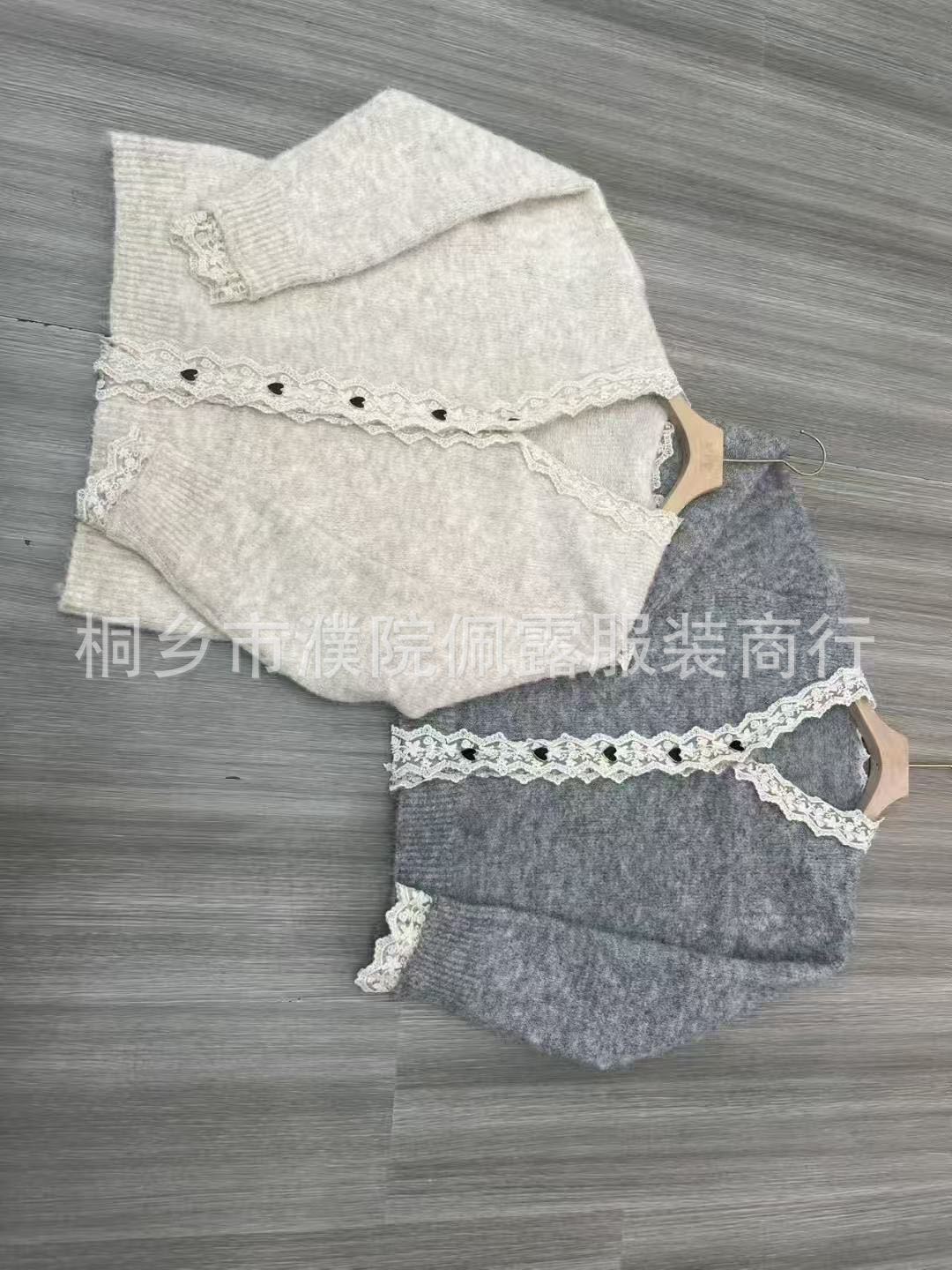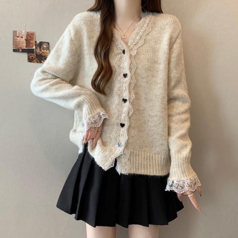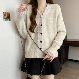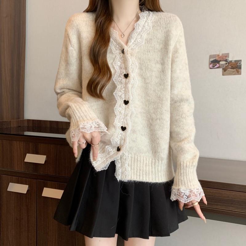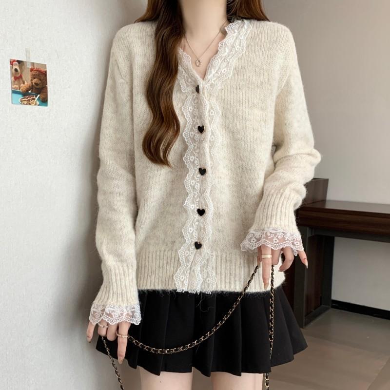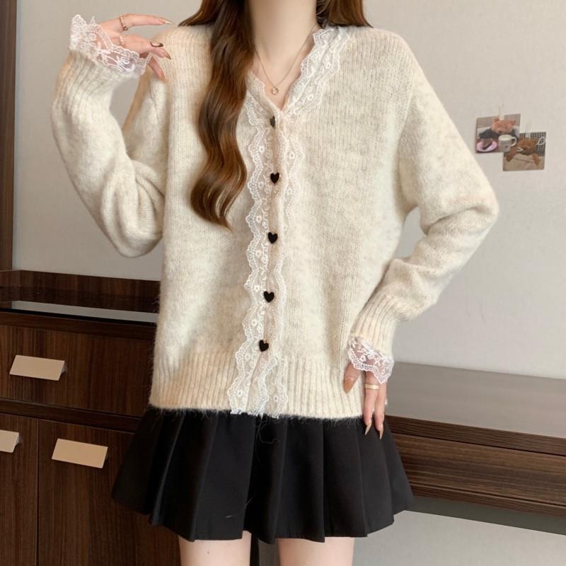 Cárdigan de Punto con Borde de Encaje Francés, Cuello en V, Manga Larga, Talla Grande para Mujer, Primavera, Otoño, Invierno, Nuevo Abrigo, Suéter, Top