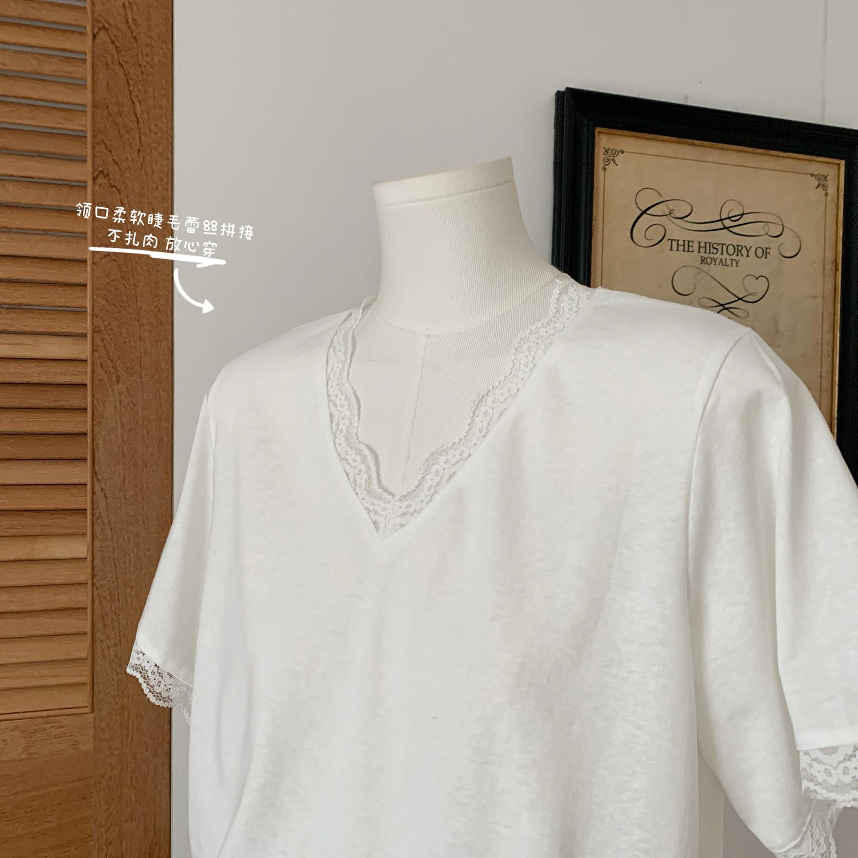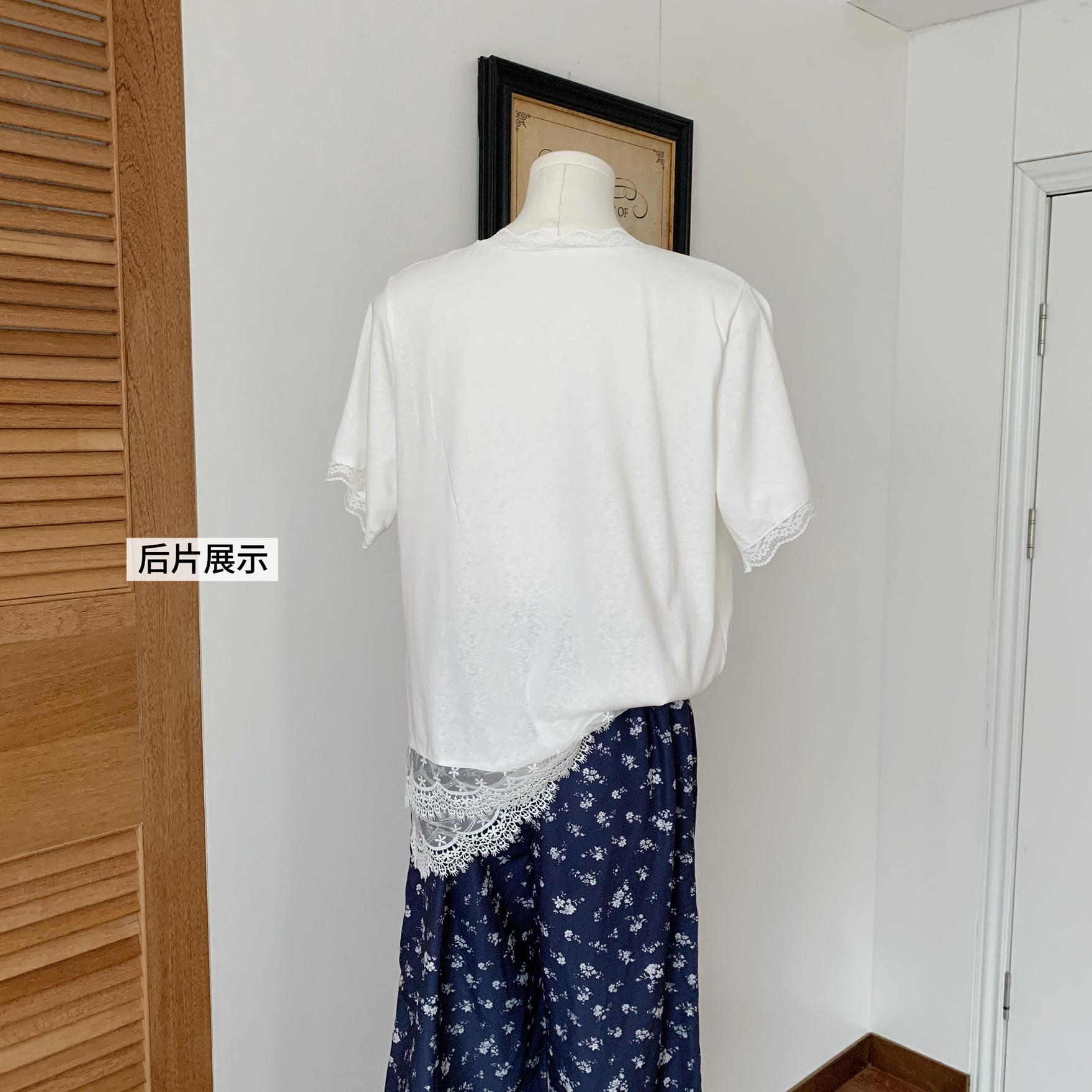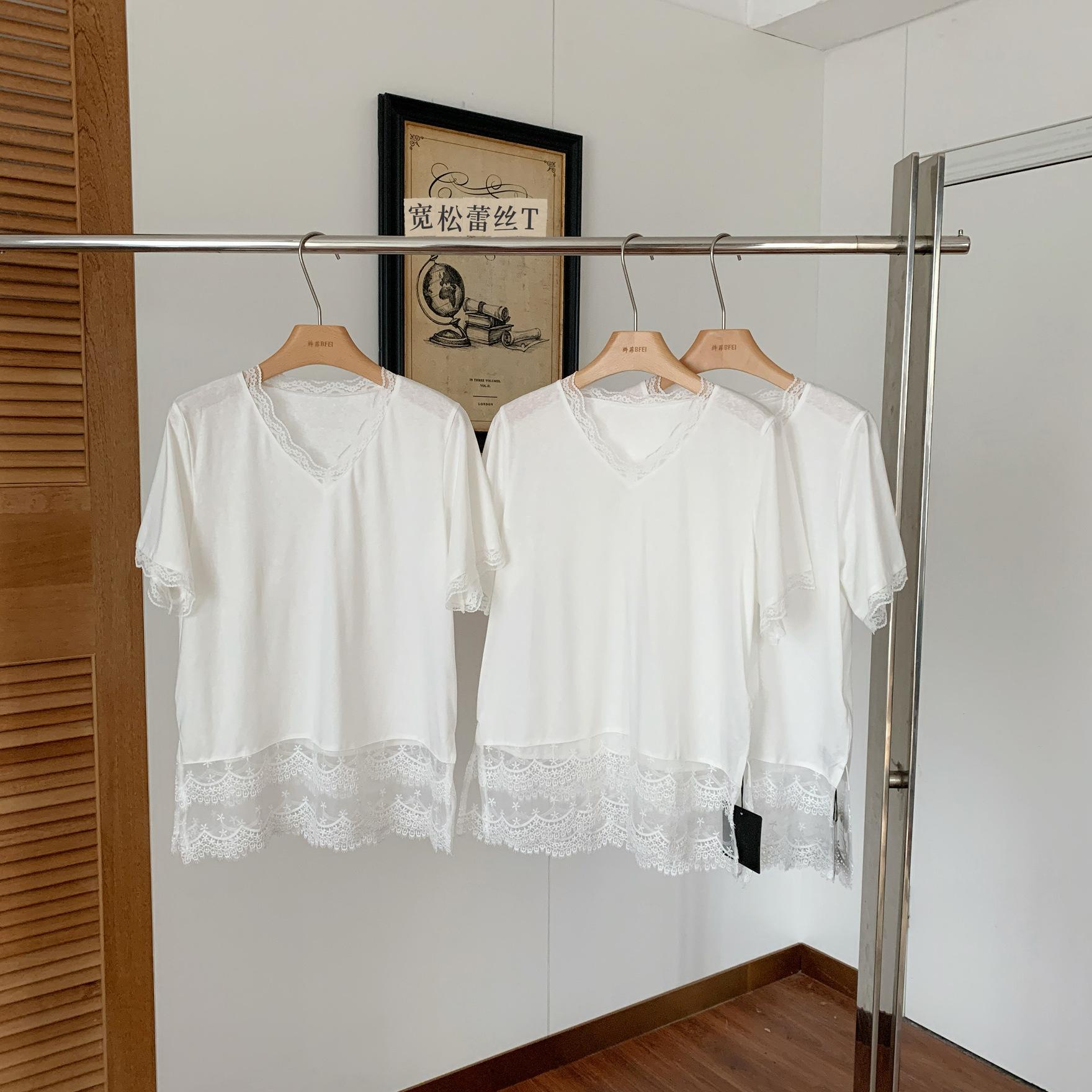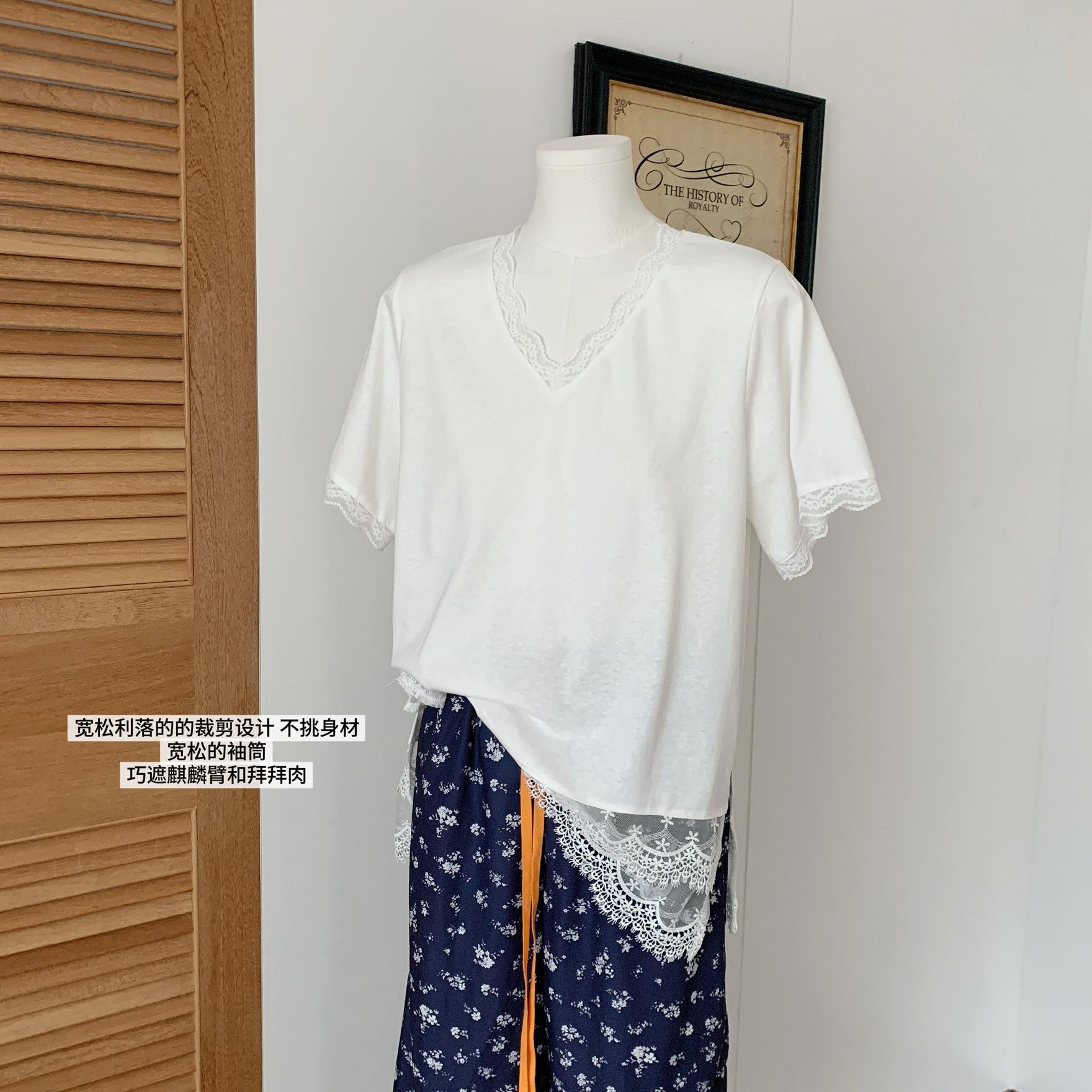 Diseño Sensación Nicho Camiseta Blanca con Costuras de Encaje para Mujer Verano Holgada Adelgazante Manga Corta Cuello en V Top