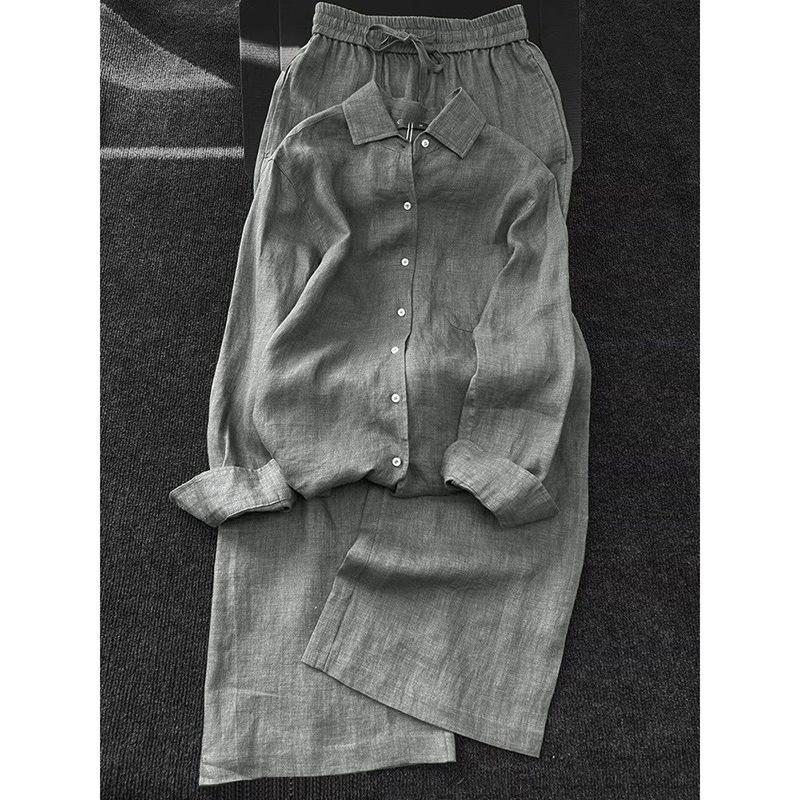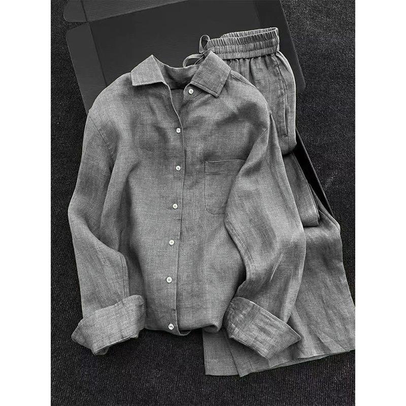 Conjunto de dos piezas de camisa de manga larga gris estilo verano 2025 Old Money relajado holgado adelgazante tipo lino y pantalones
