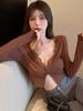 Camiseta de Manga Larga Entallada Estilo Deseo Puro Adelgazante Cárdigan de Otoño Sexy Costuras de Encaje Cuello en V Abertura Top Nicho Ins