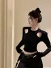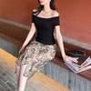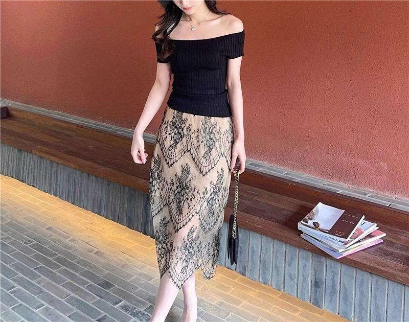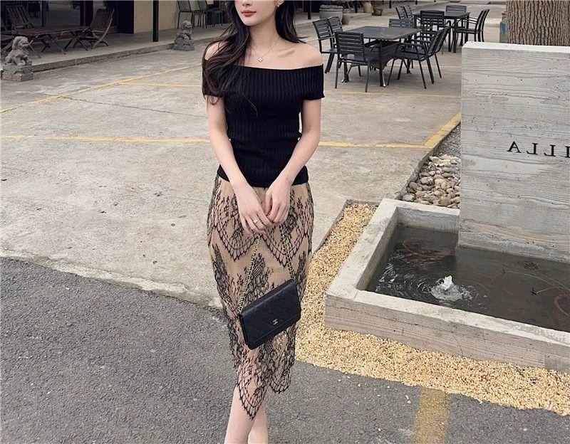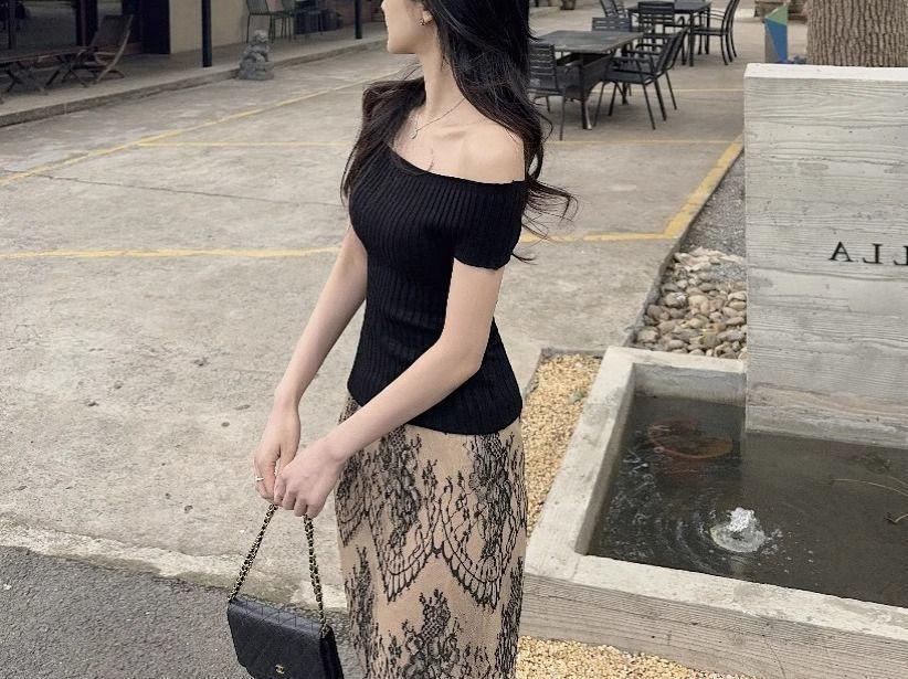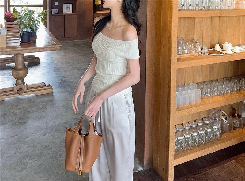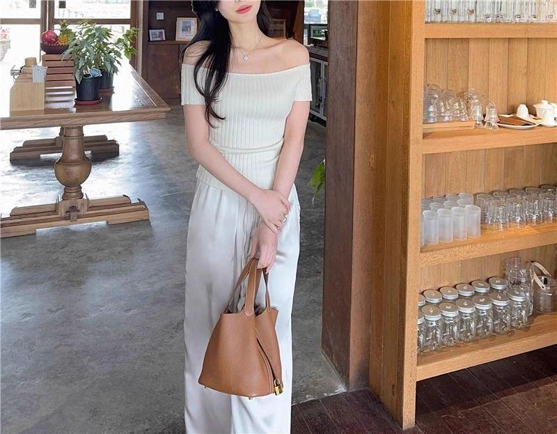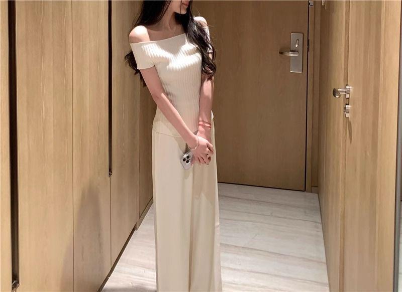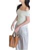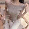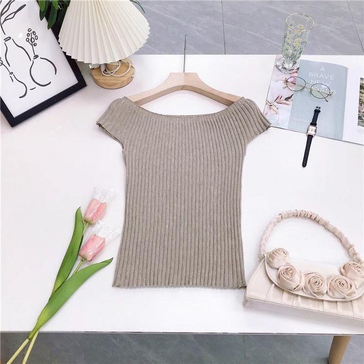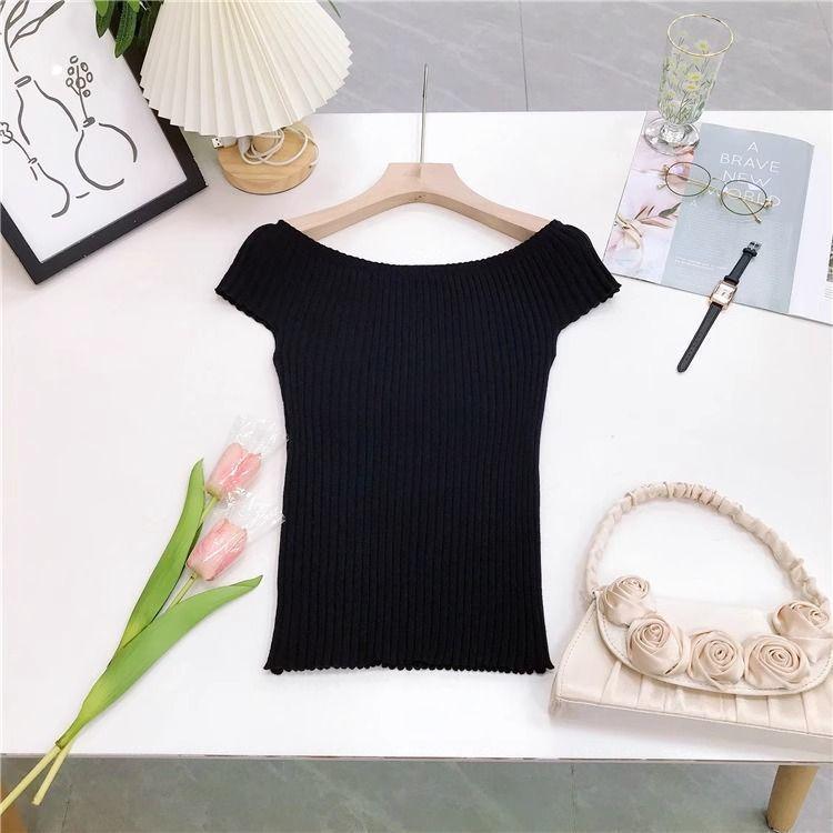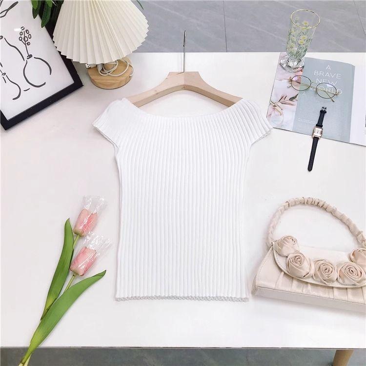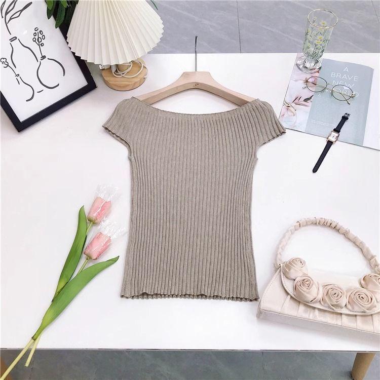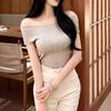 Top de Punto de Manga Corta con Hombros Descubiertos Sexy de Moda de Color Sólido Verano Nuevo Versátil Top Ajustado para Chicas Hot
