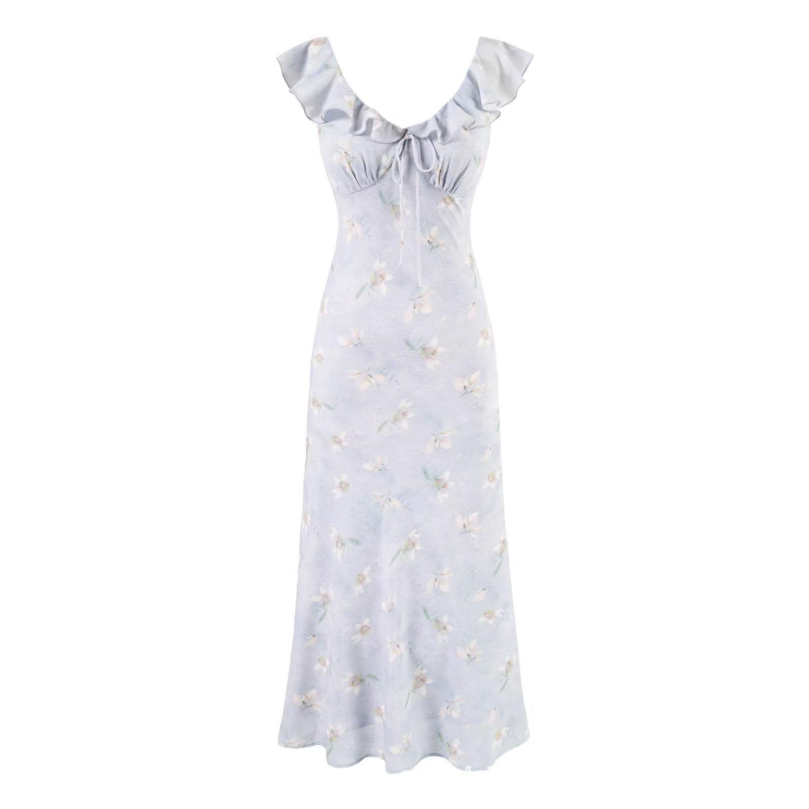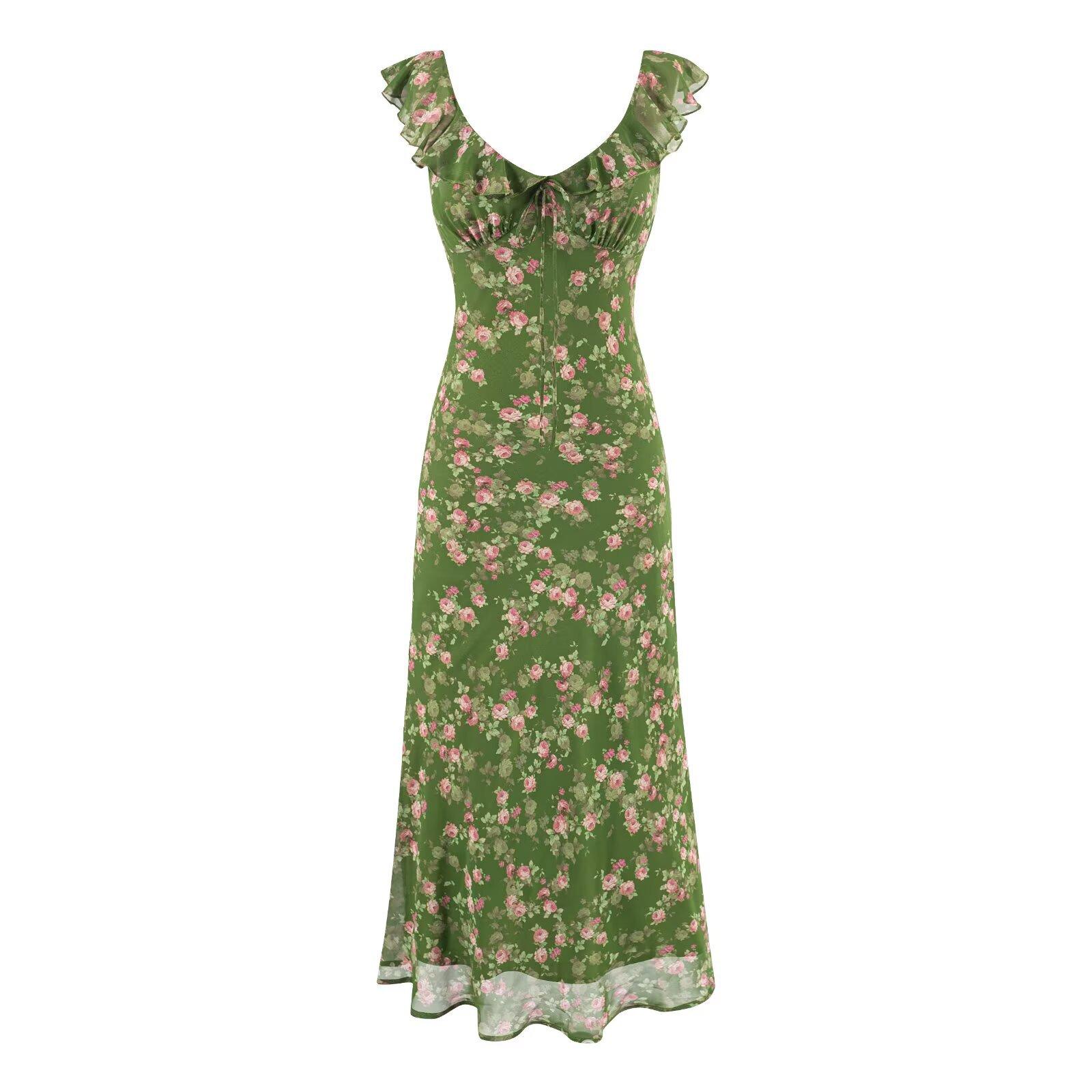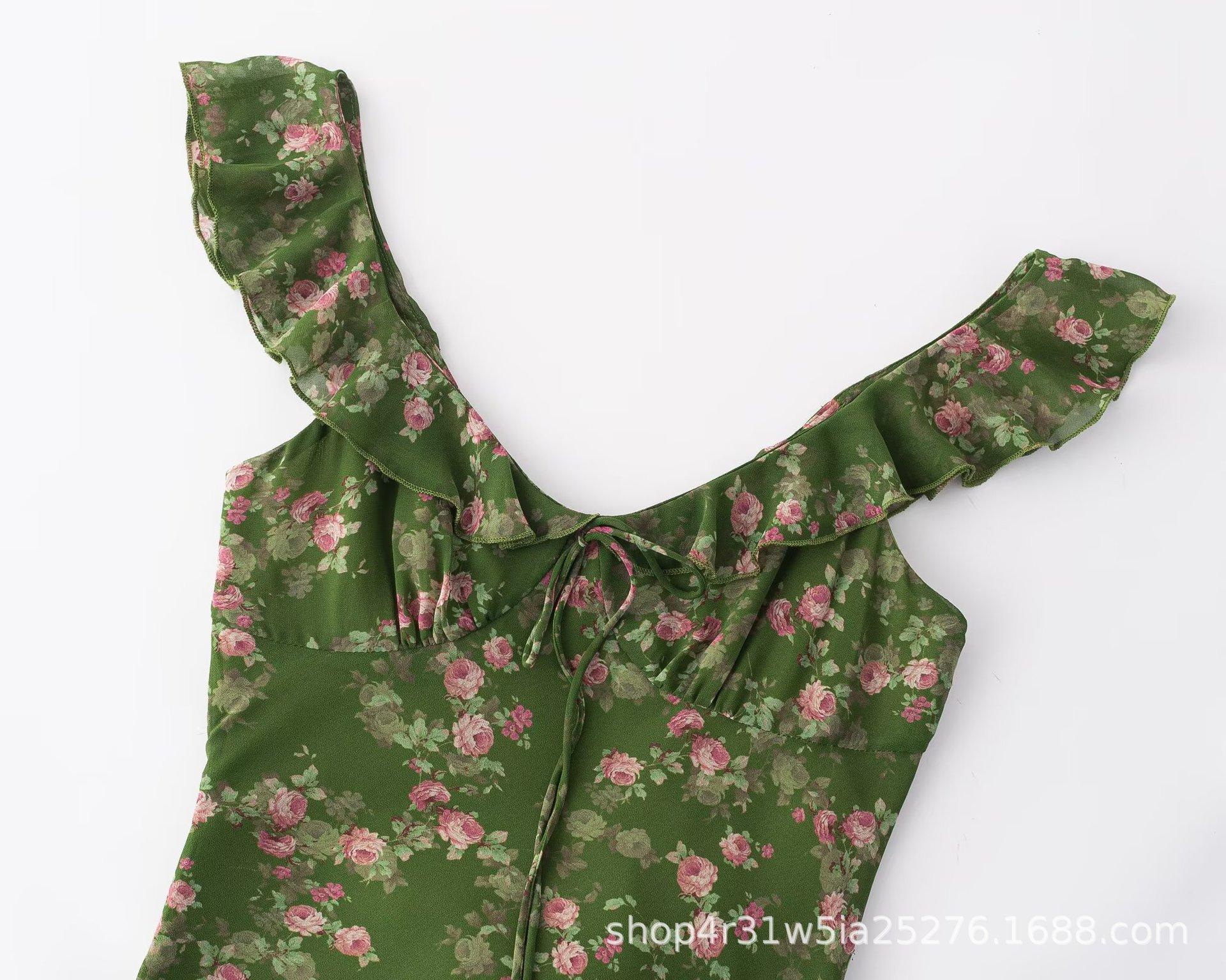 2025 Nuevo Vestido Chic Estilo Pastoral Estampado Espalda Descubierta Tirantes Cuello V Francés Sexy Slim Falda Midi