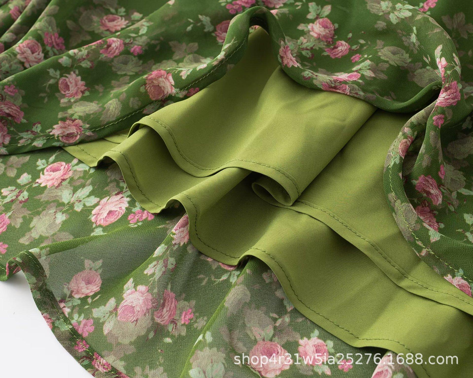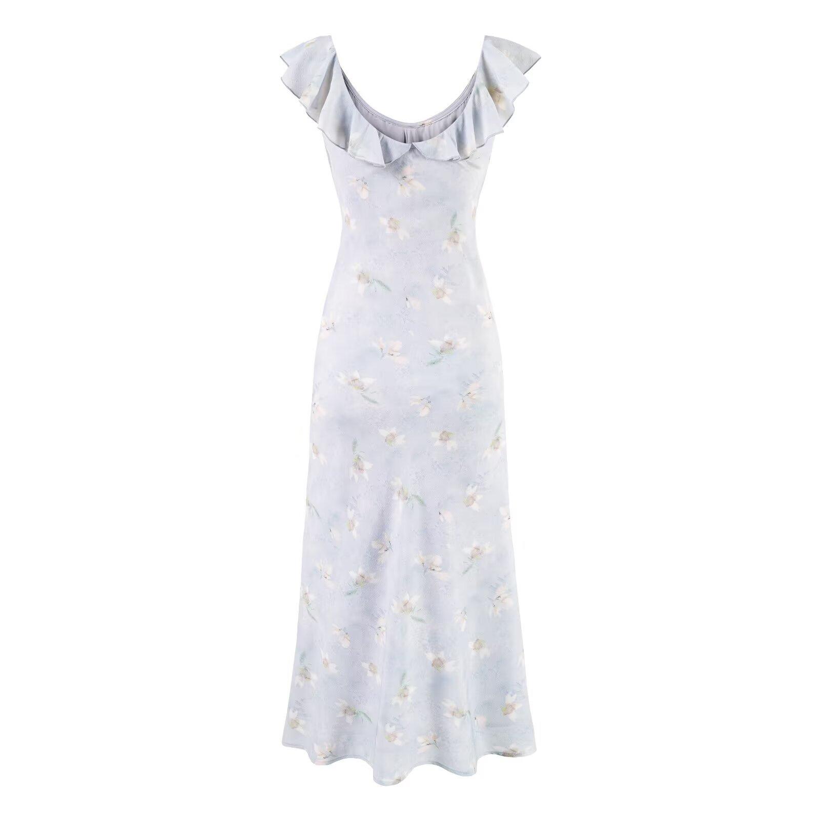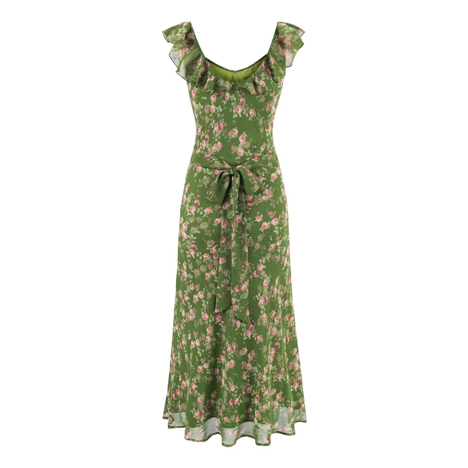 2025 Nuevo Vestido Chic Estilo Pastoral Estampado Espalda Descubierta Tirantes Cuello V Francés Sexy Slim Falda Midi