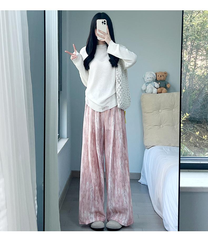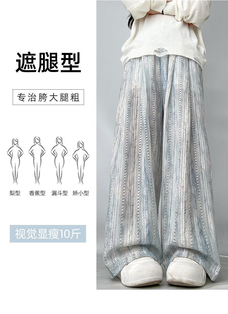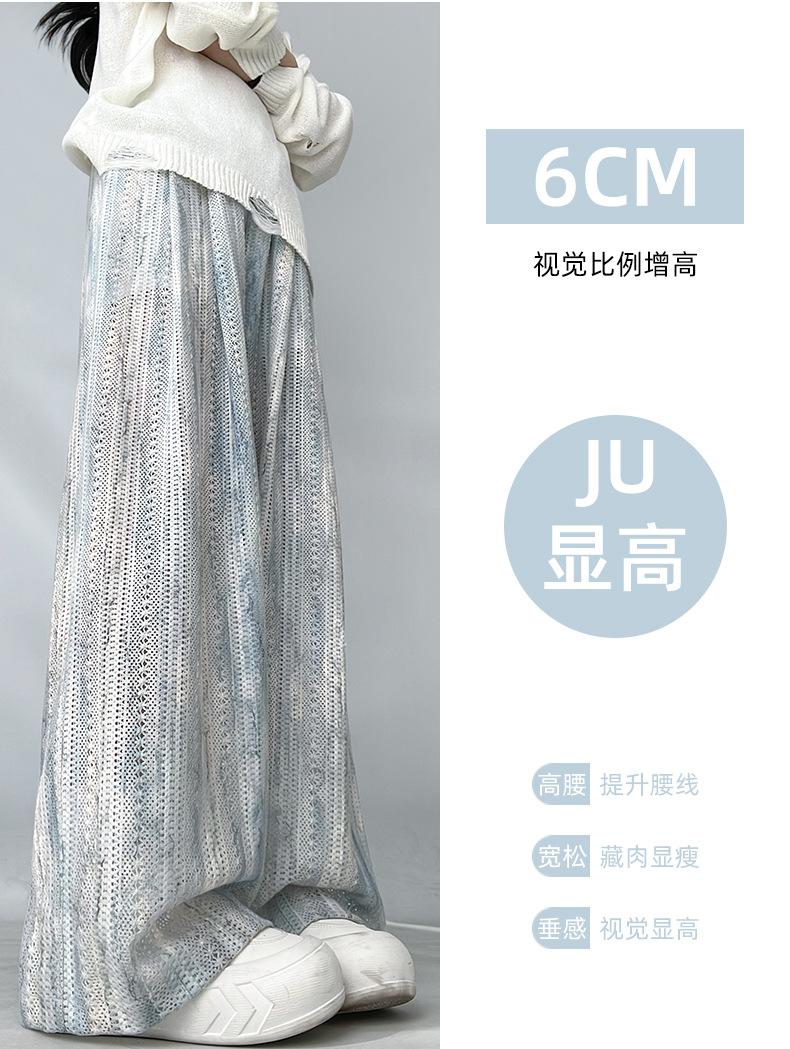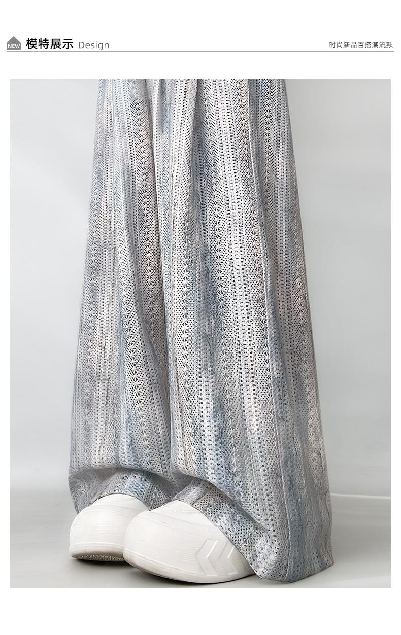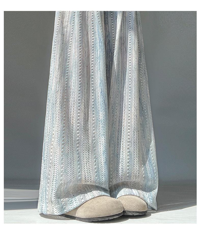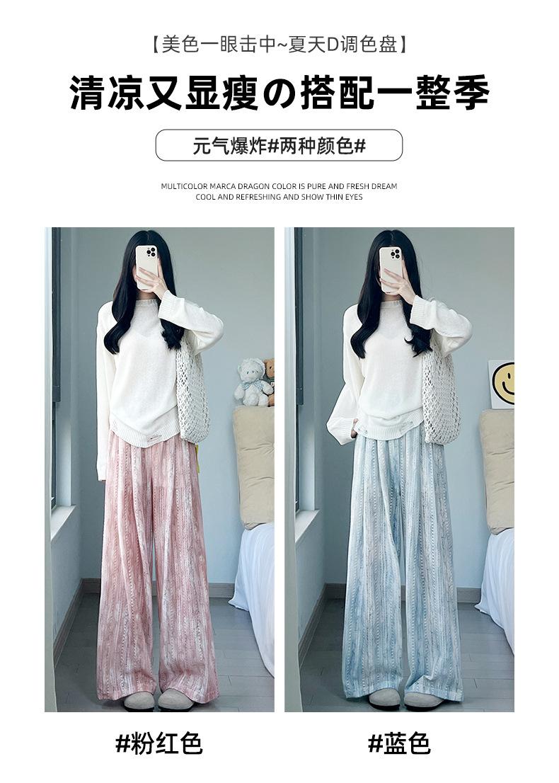 Pantalones Azules de Seda de Hielo de Pierna Ancha para Mujer Verano Nuevo Cintura Alta Sueltos Drapeados Casuales Frescos Pantalones Teñidos Anudados Huecos Rotos