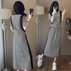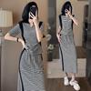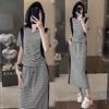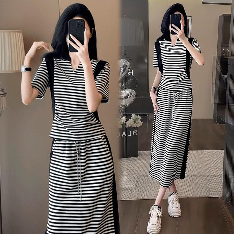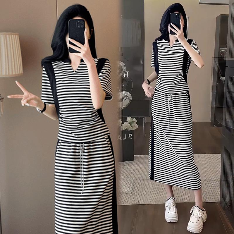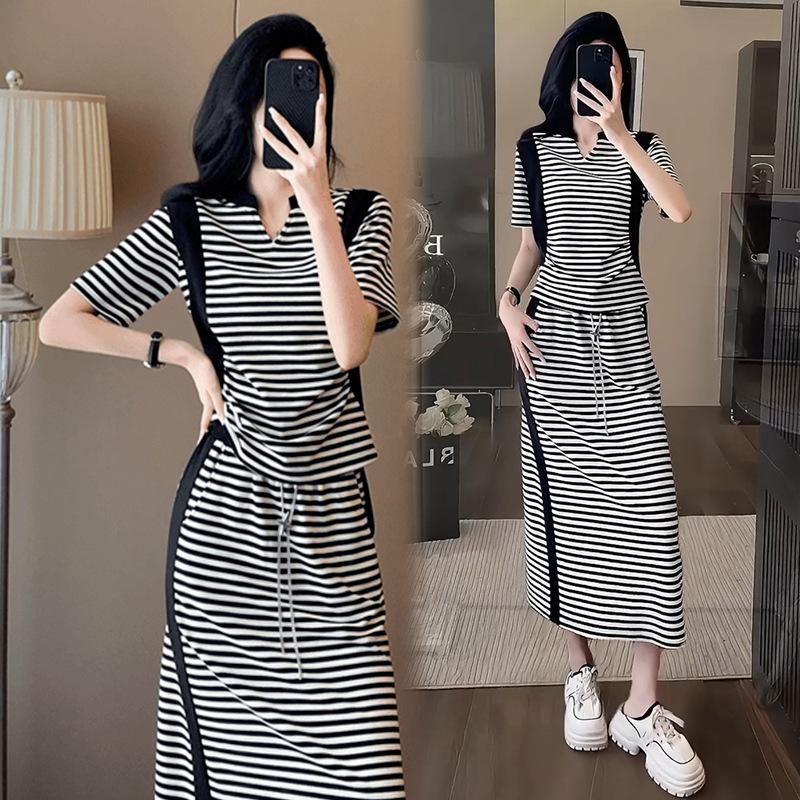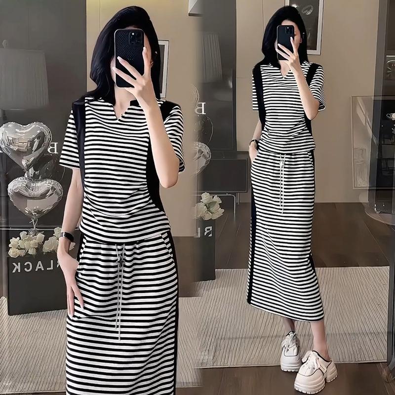 Vestido de moda para mujer 2025 Verano Nuevo Estilo Occidental Moderno Top Rayado Negro Falda Elegante Conjunto de Dos Piezas