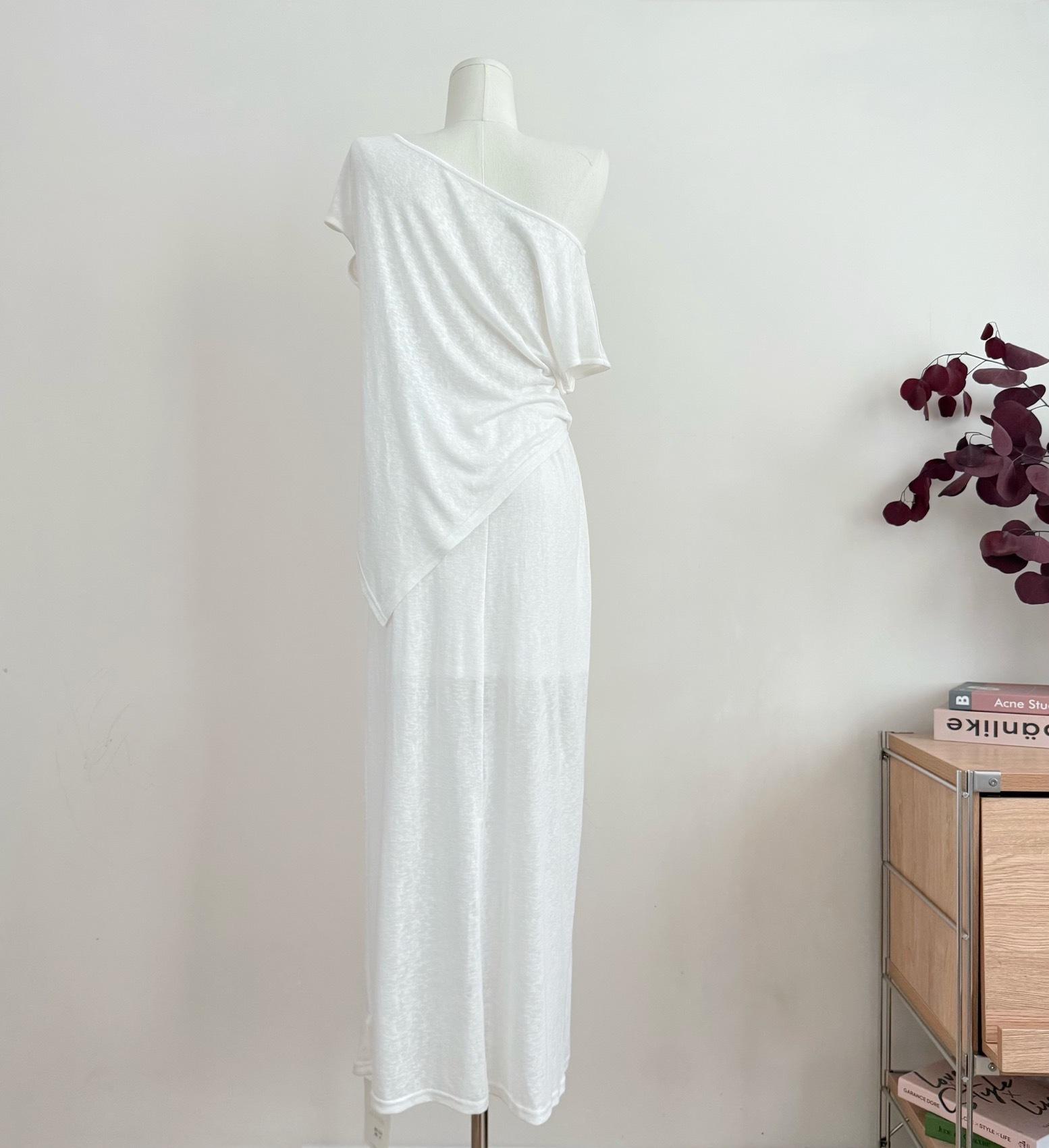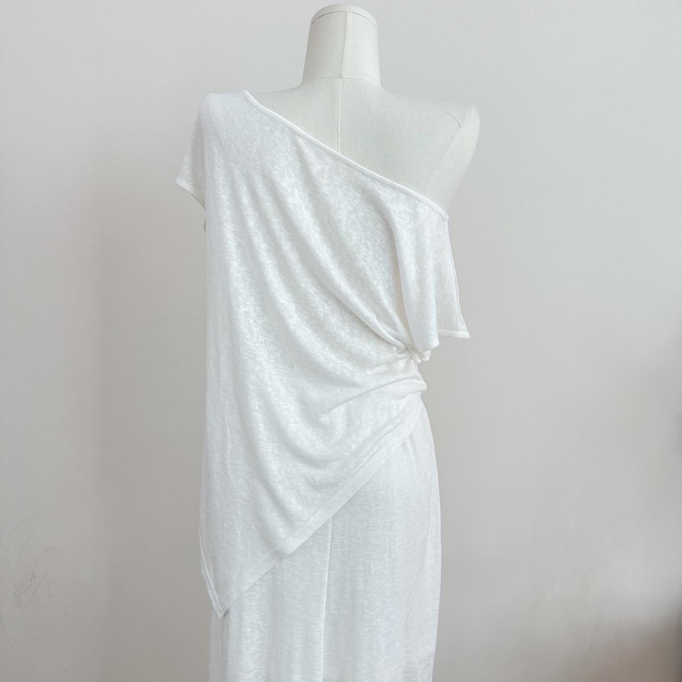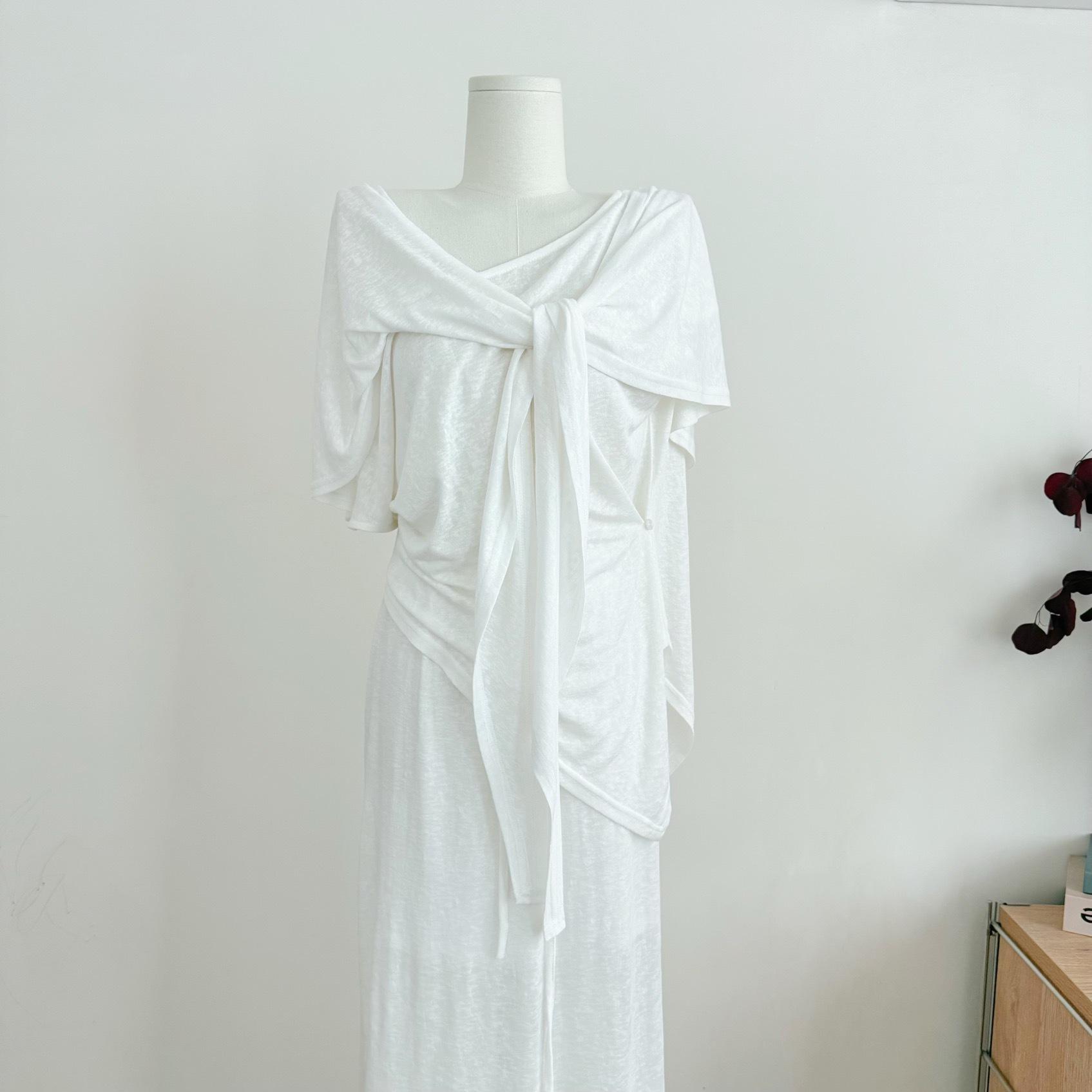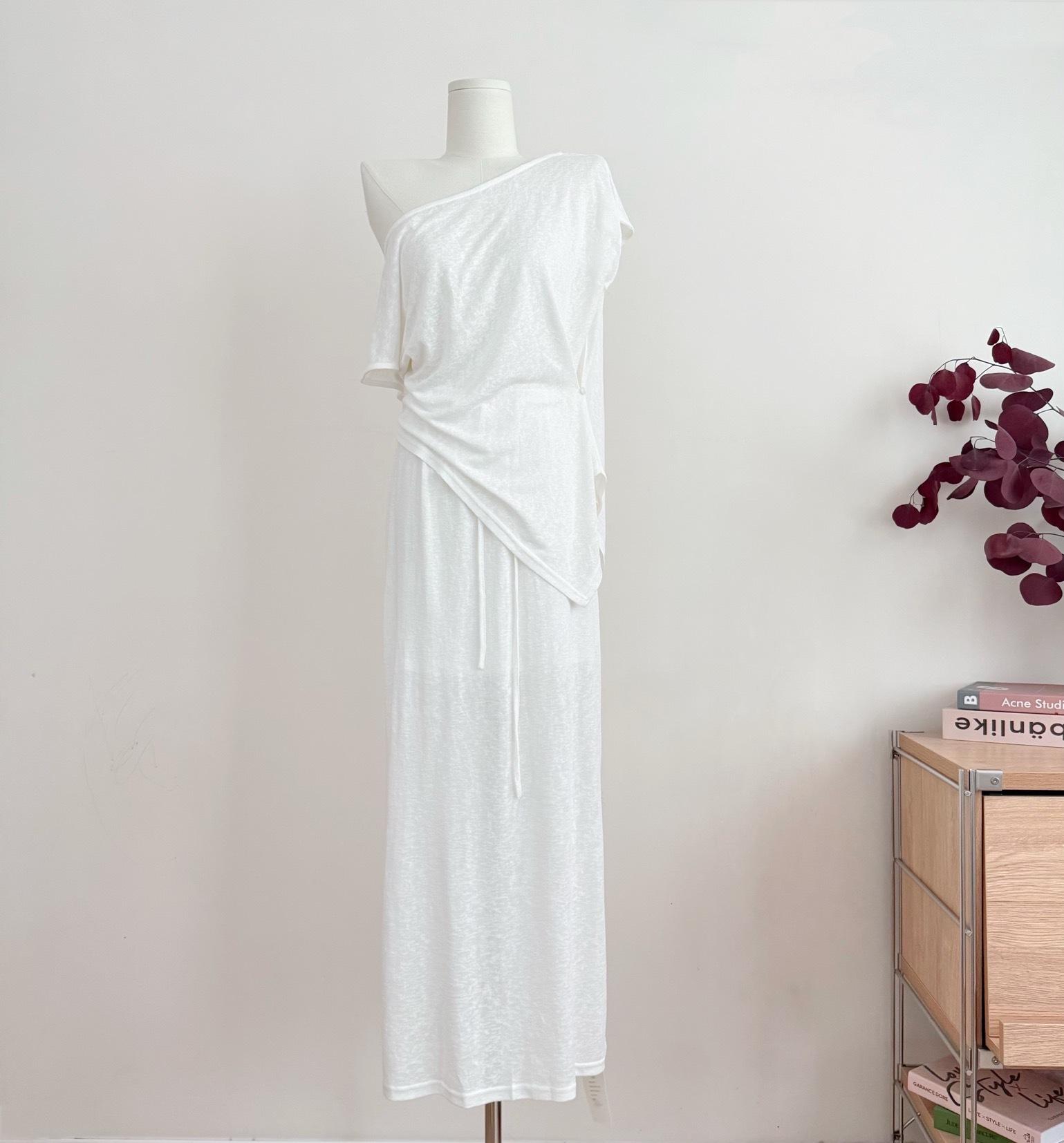 Camiseta Heroína de Alta Inteligencia Blanca Cuello de una Línea para Mujer Verano Falda Elegante Estilo Coreano Estilo Lazy Conjunto de Tres Piezas