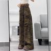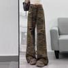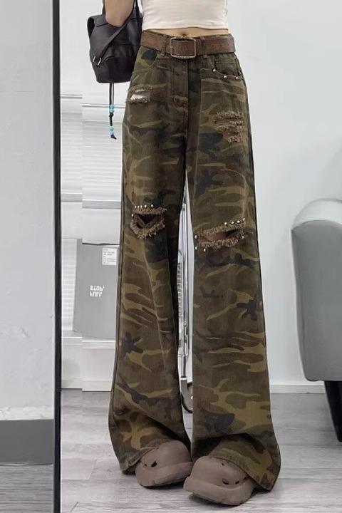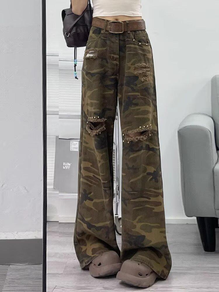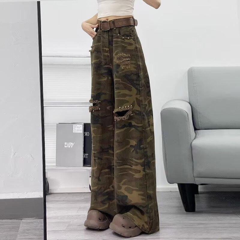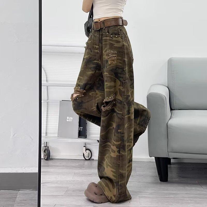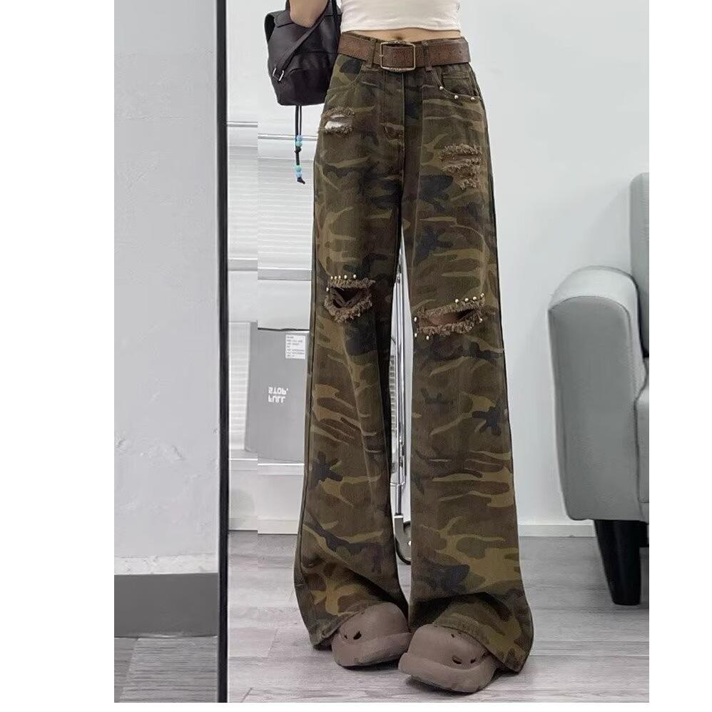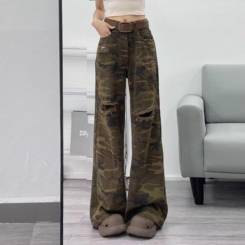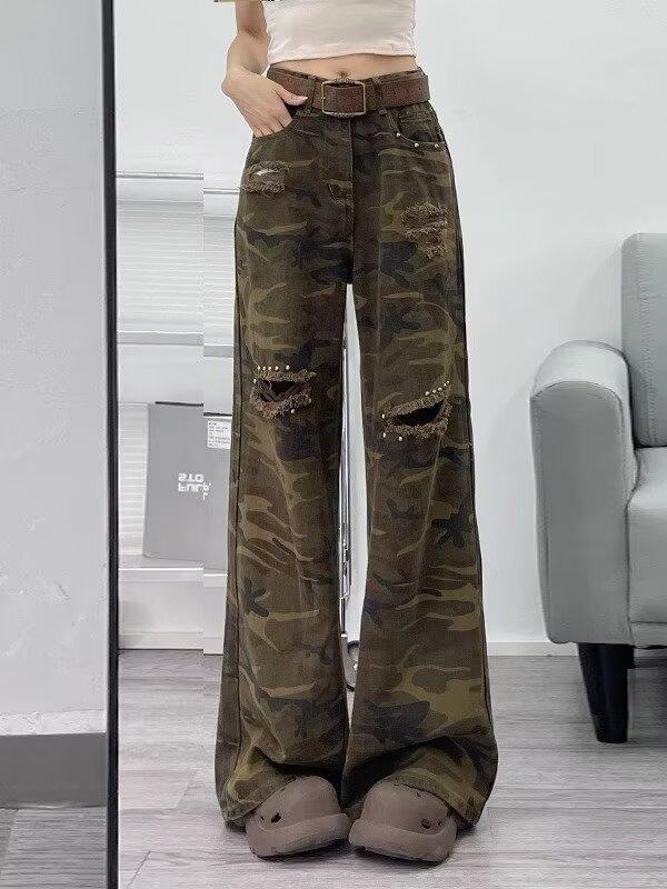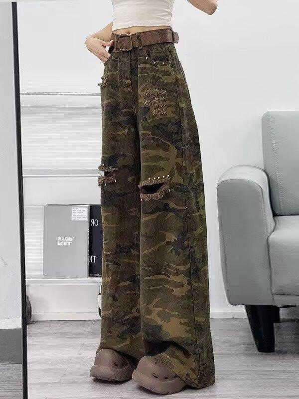 Retro High Street 2025 Verano Nuevo Jeans Camuflaje Deslavado de Cintura Alta Rotos Pantalones Rectos Sueltos hasta el Piso para Mujer