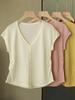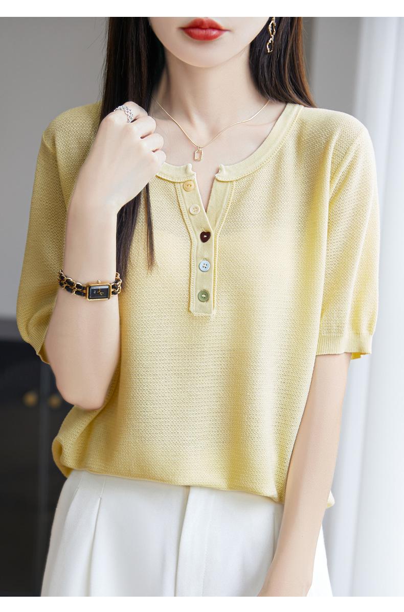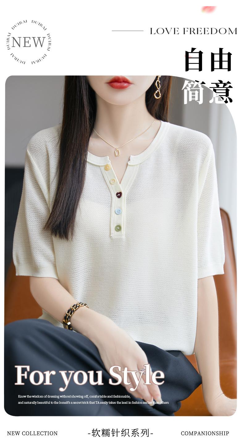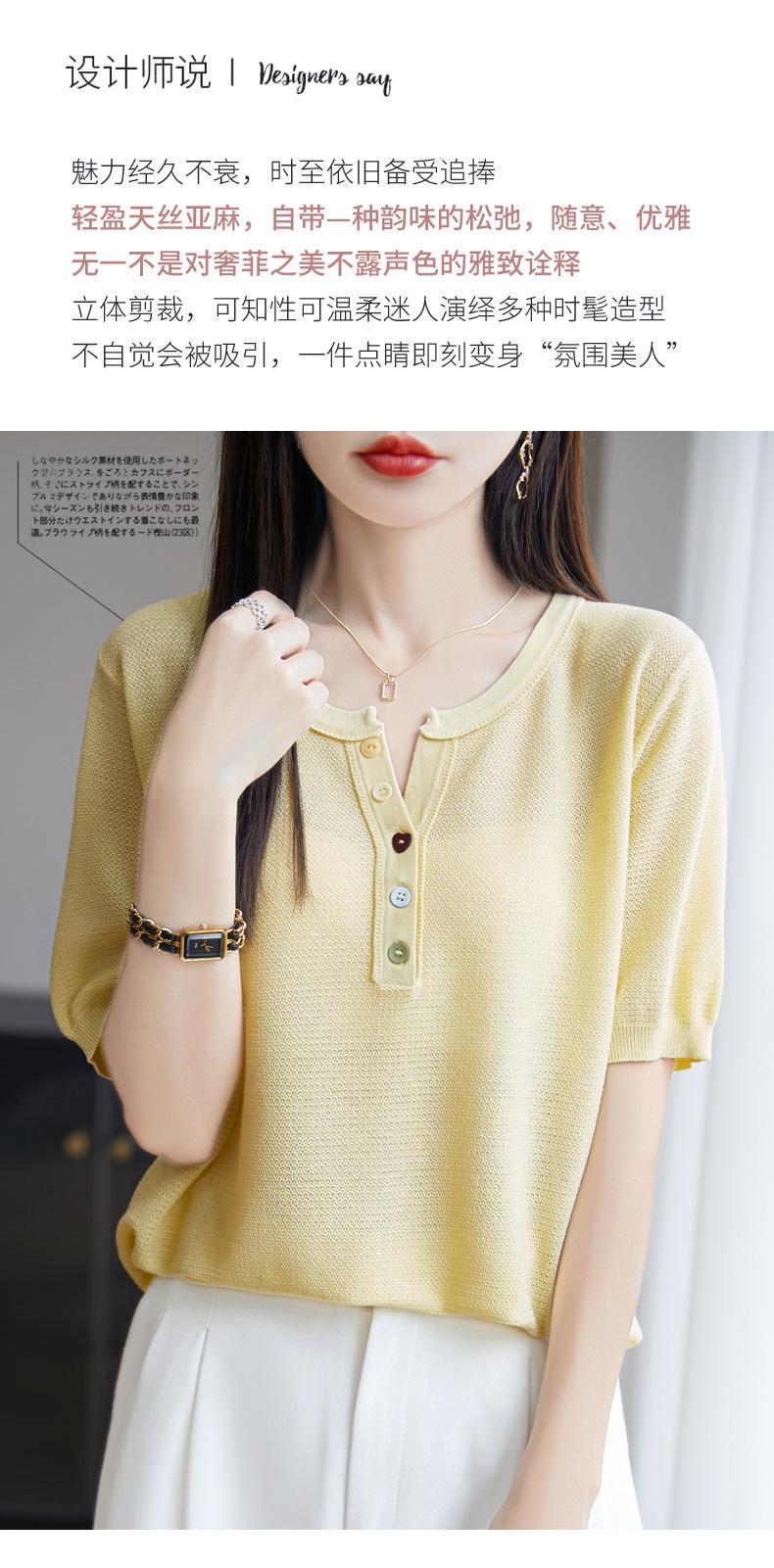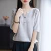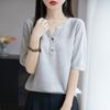 2025 Nuevo Verano Tencel Lino Cuello en V Punto Camiseta Manga Tres Cuartos para Mujer Color Puro Abotonadura Inferior Camisa Top