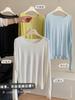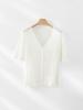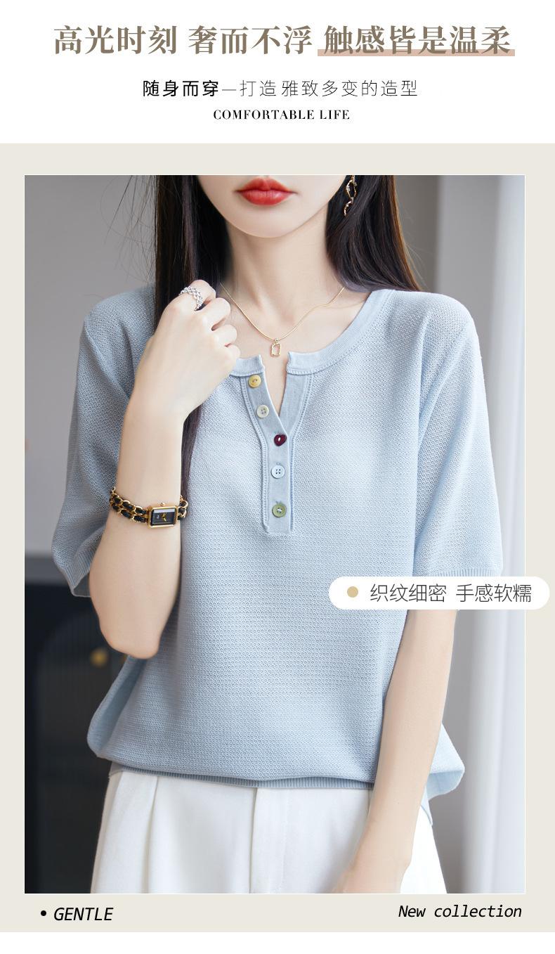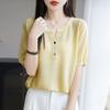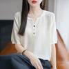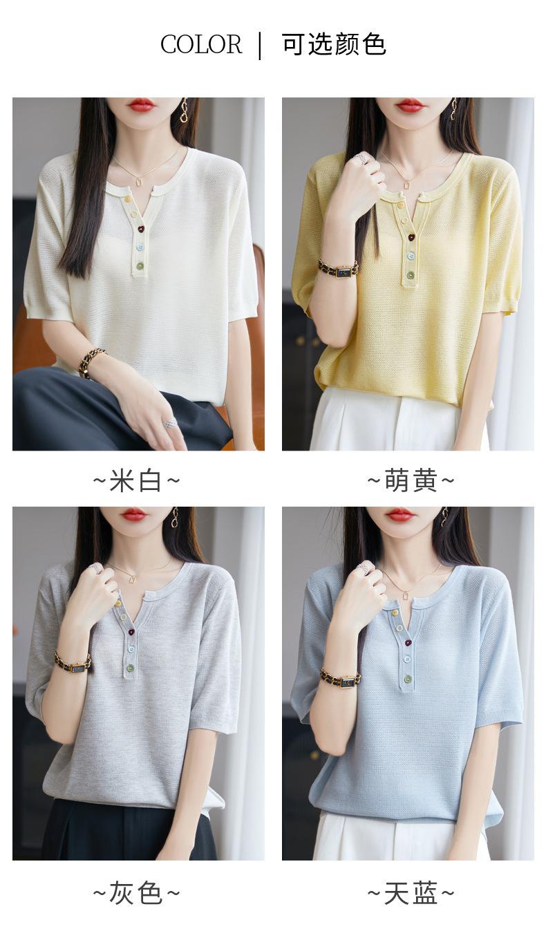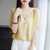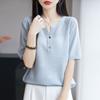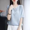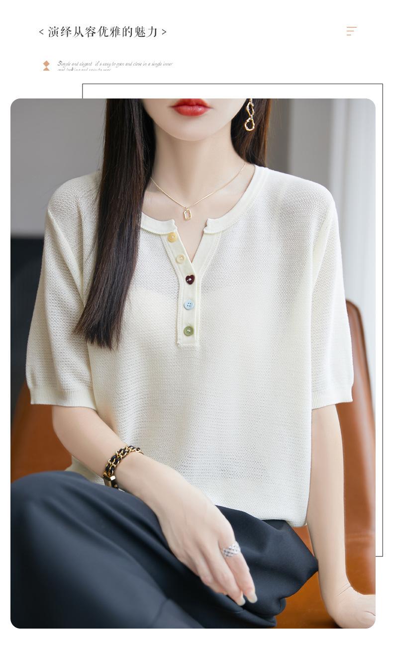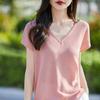 2025 Nuevo Verano Tencel Lino Cuello en V Punto Camiseta Manga Tres Cuartos para Mujer Color Puro Abotonadura Inferior Camisa Top