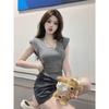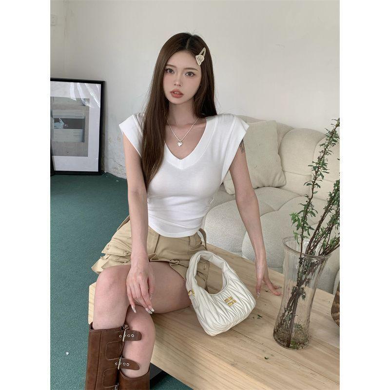 Estilo Deseo Puro Estilo Hong Kong Color Puro para Mujer Nuevo Cuello en V Mangas Cortas con Volantes Pequeños Plisado Slim Ajustado Camiseta Top