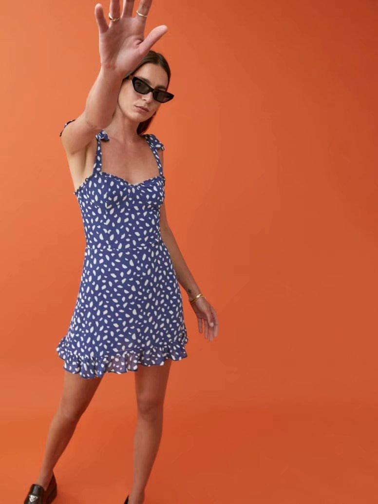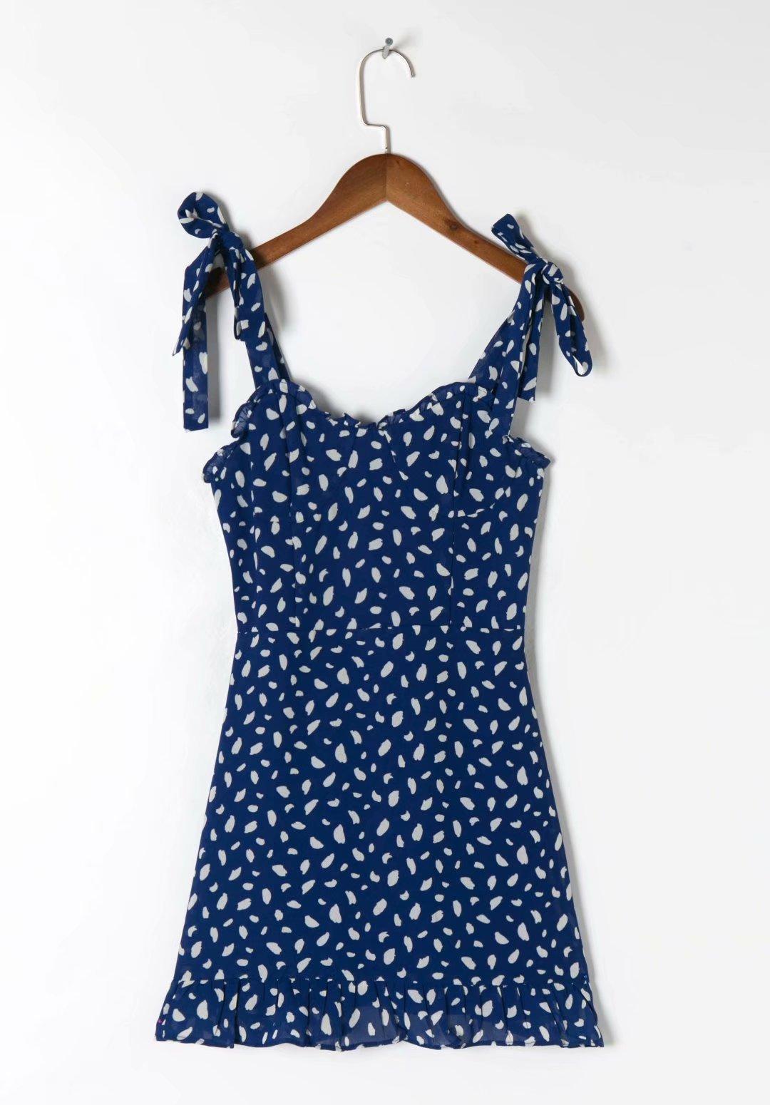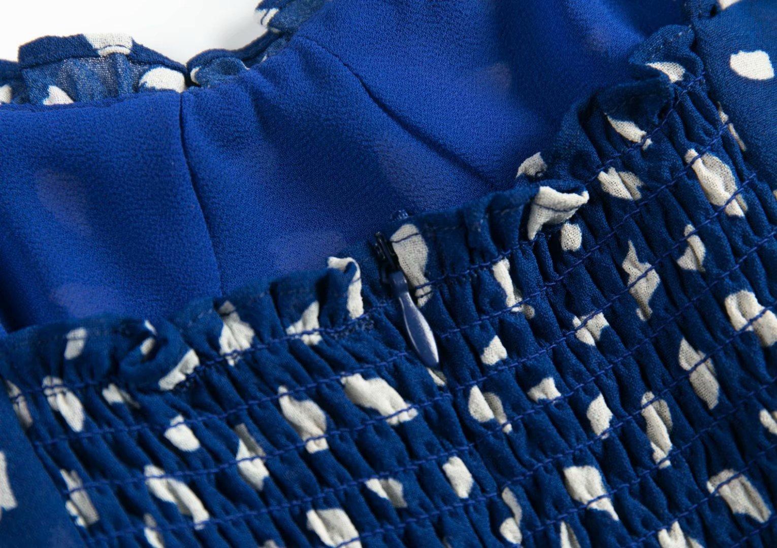 El Vestido de Verano con Estampado de Lunares, Temperamento para Ir al Trabajo, Azul, Cintura Alta, Tirantes Tipo Peto, con Volantes, es Elegante y Fresco.