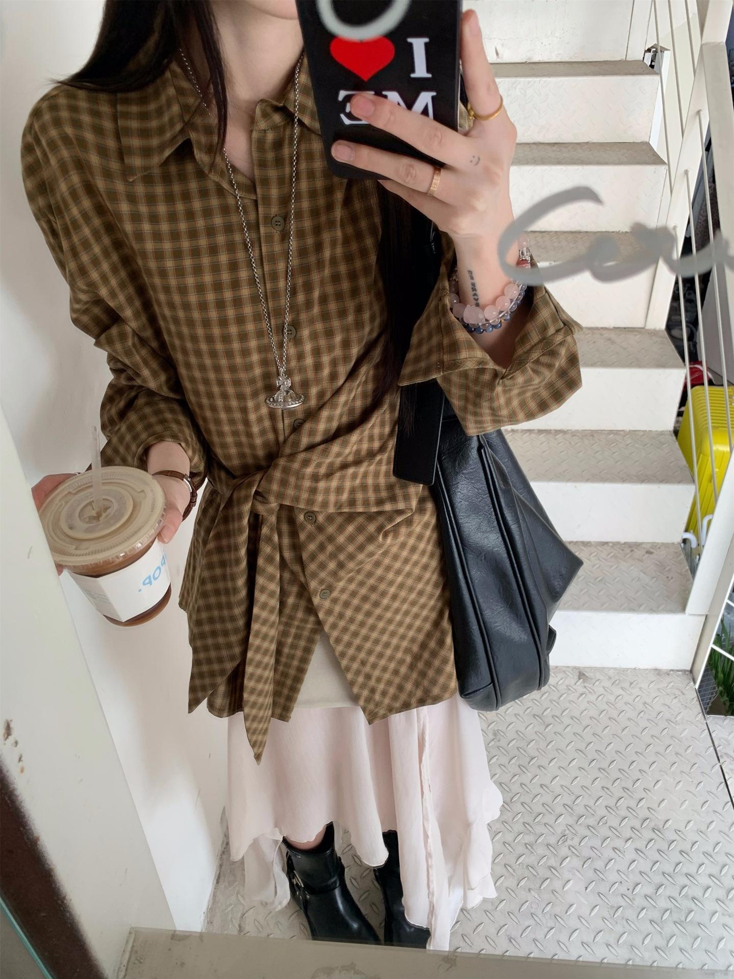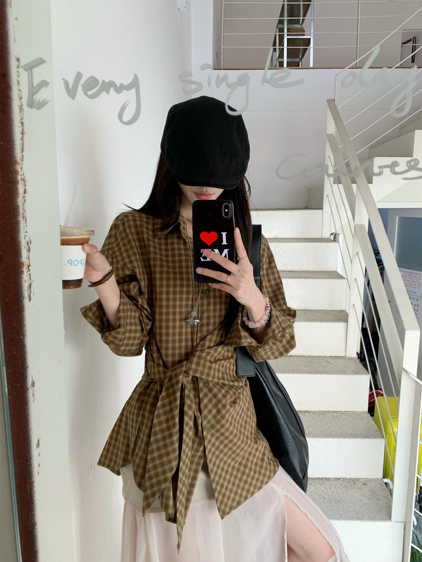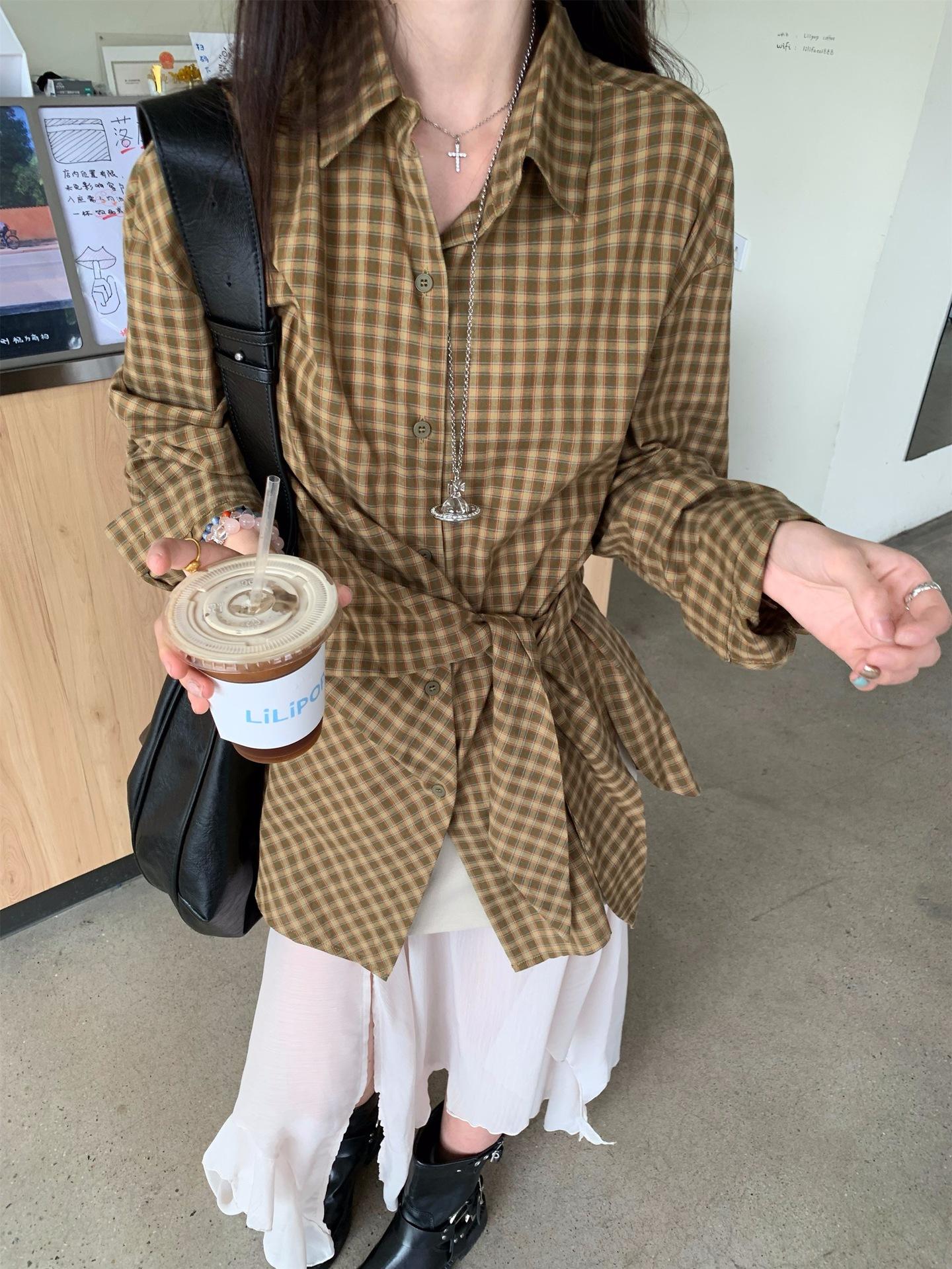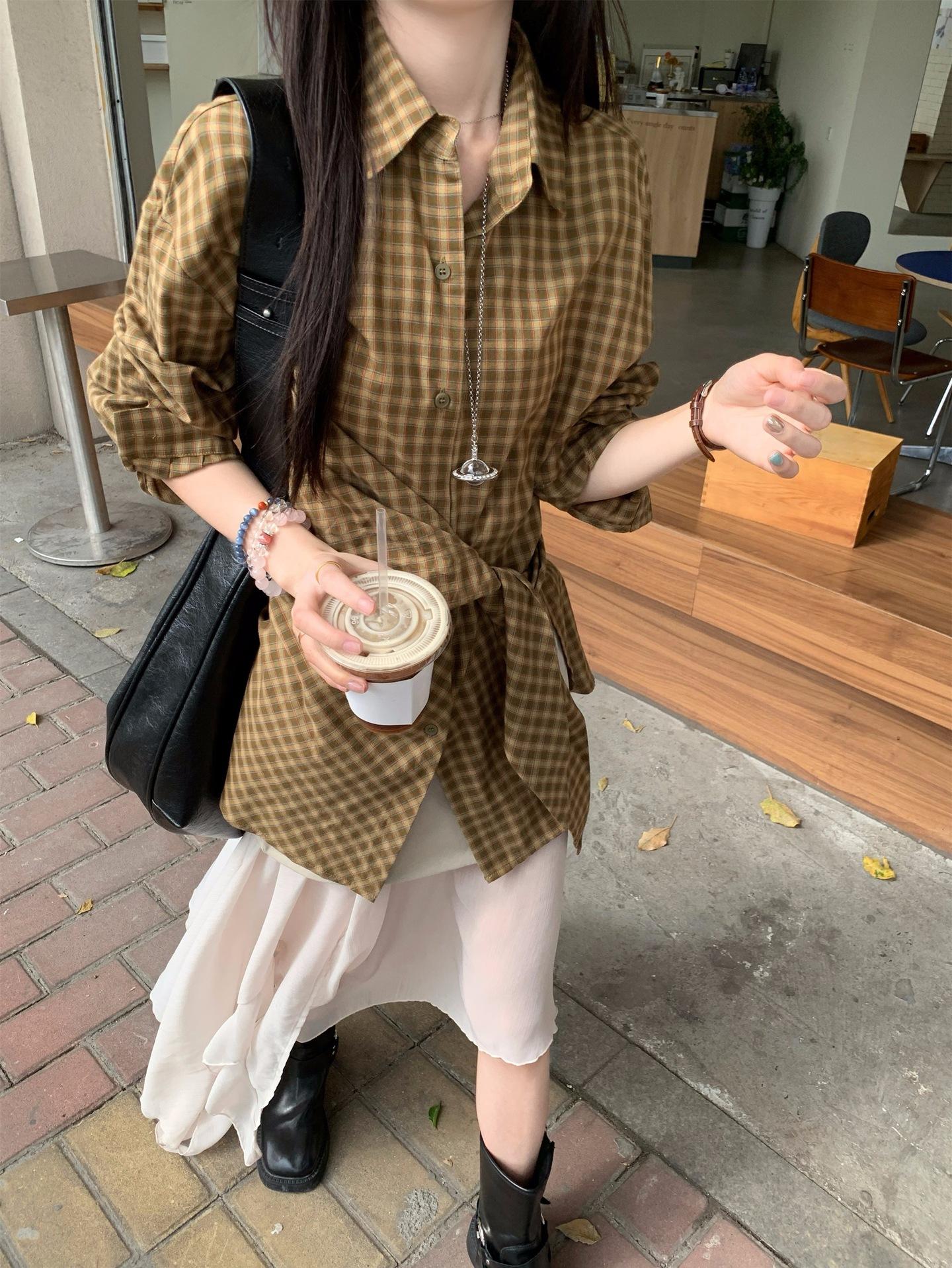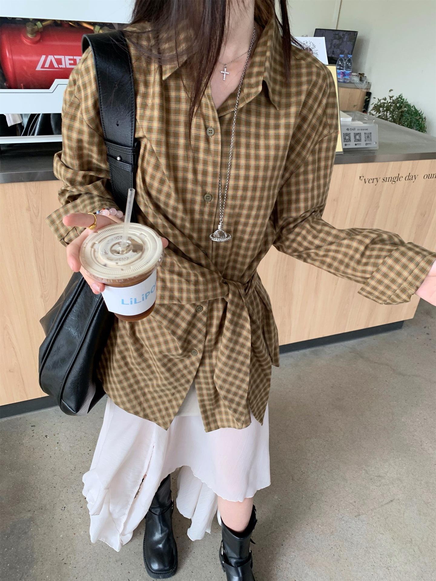 Camisa de Cuadros de Estilo Coreano de Manga Larga para Mujer Verano 2025 Nueva Suelta Media Longitud con Cordones Combinable Camisa Protector Solar Top