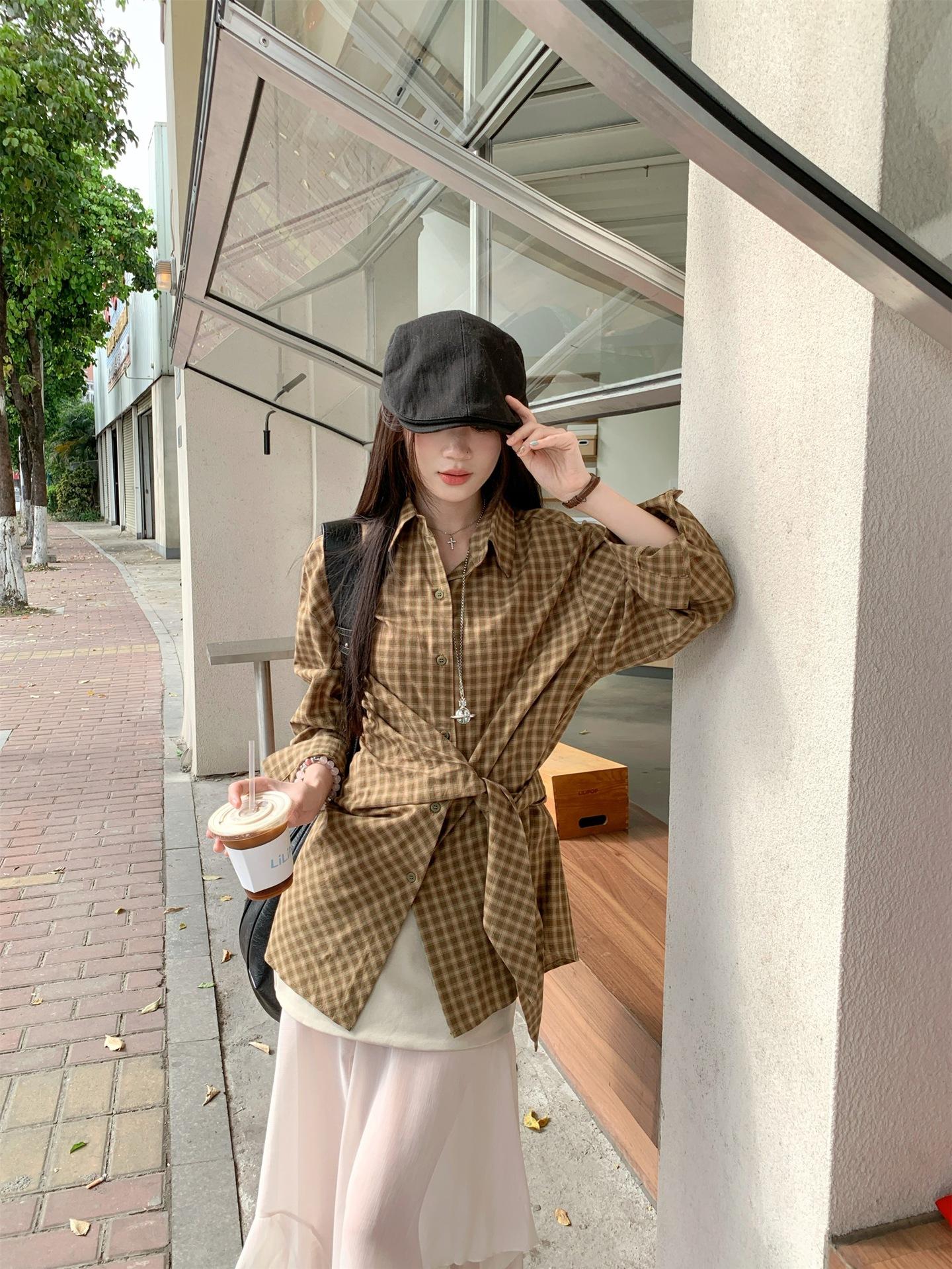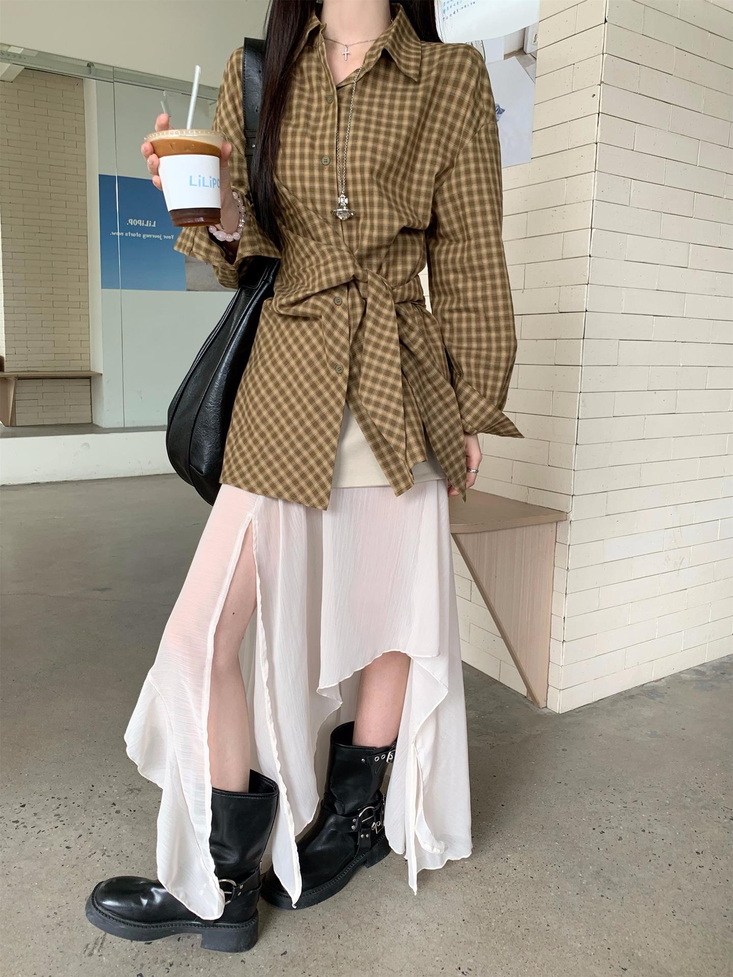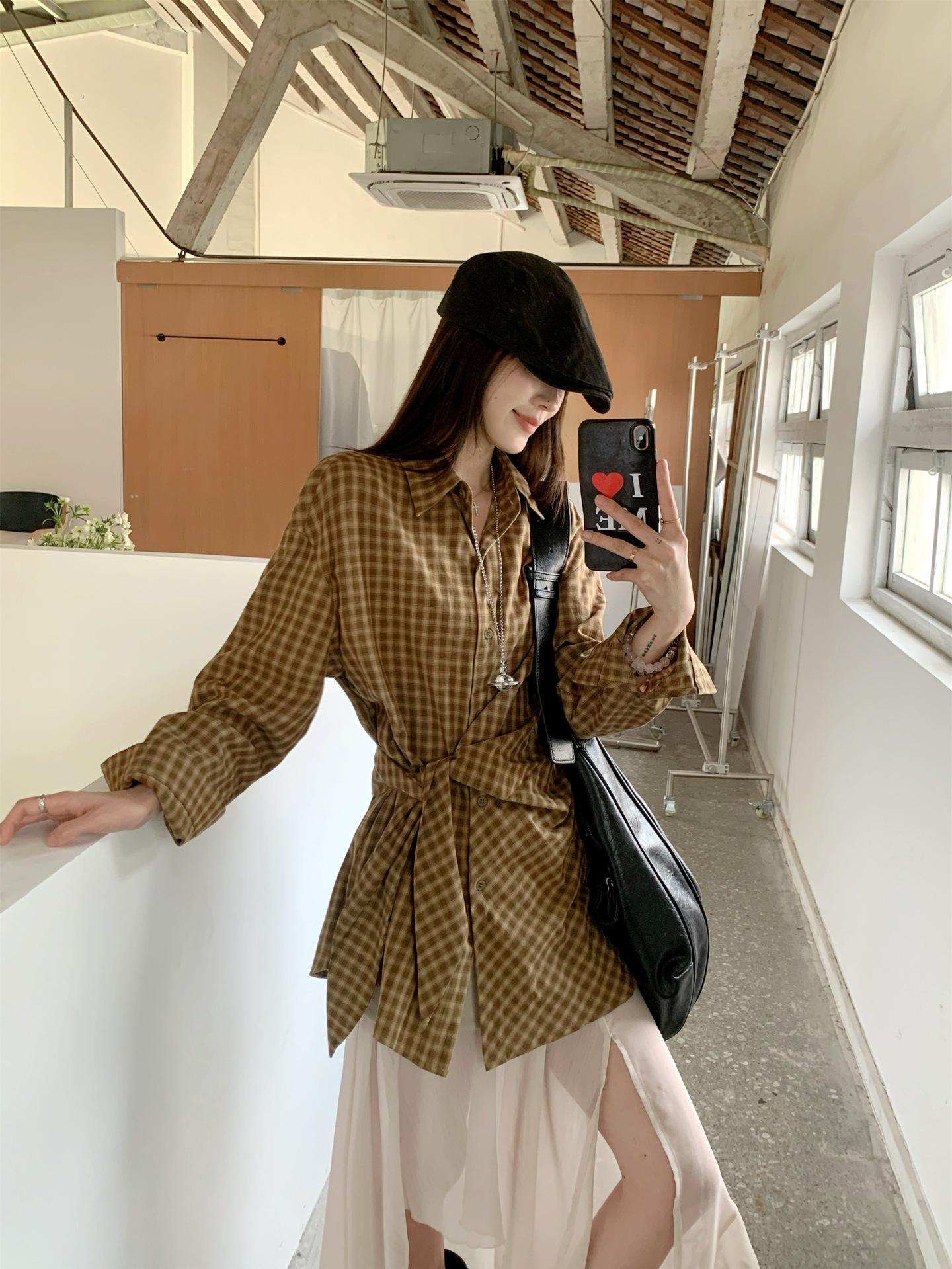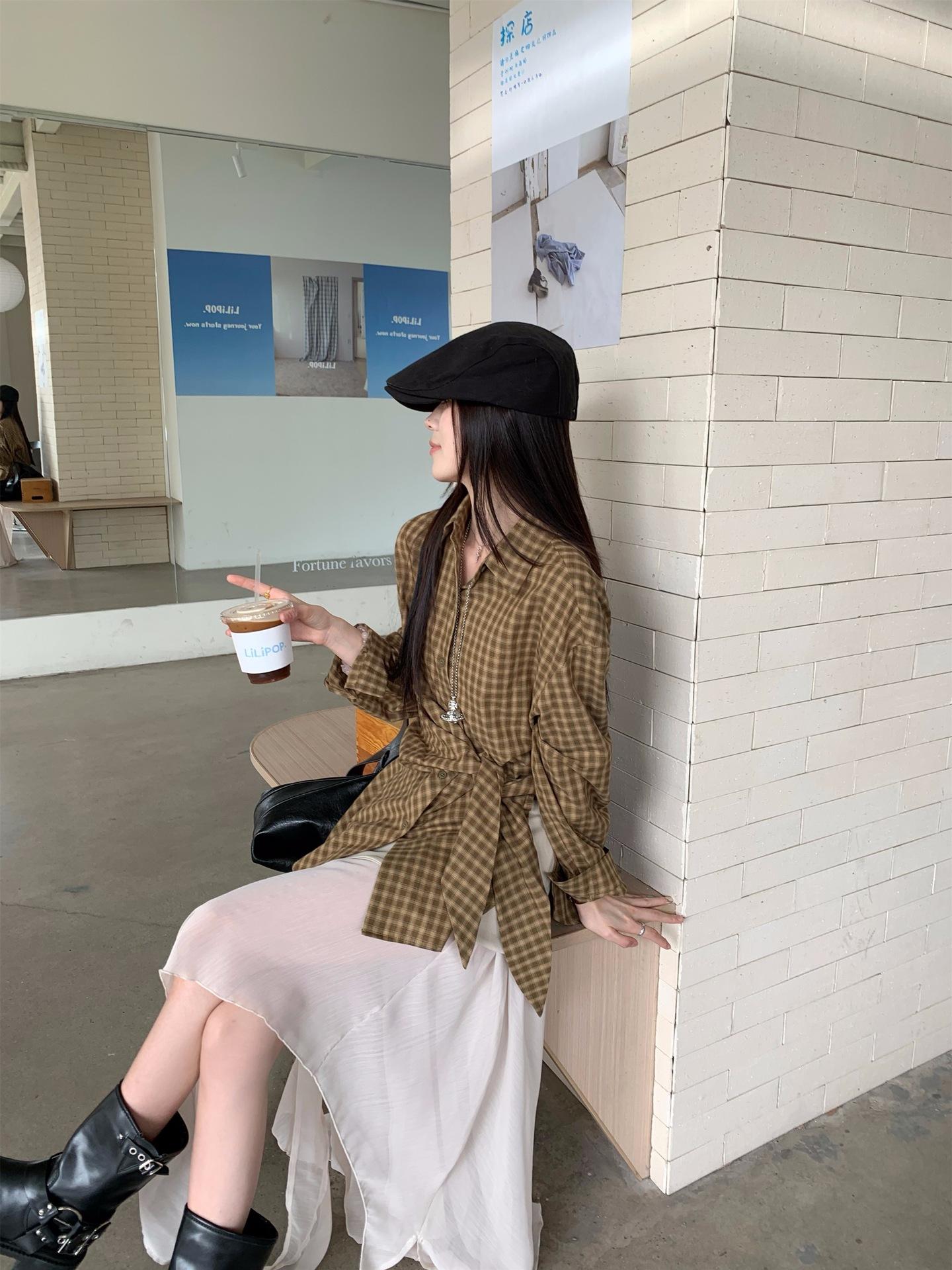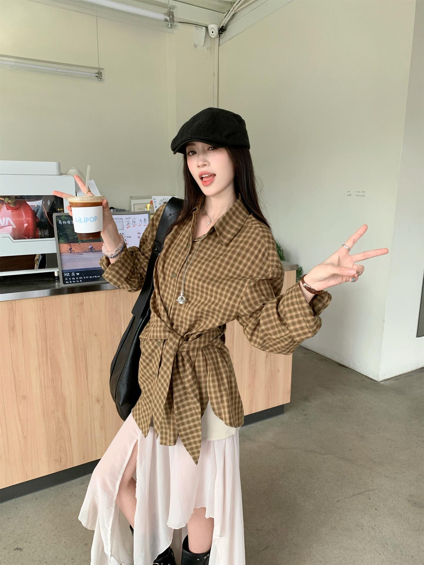 Camisa de Cuadros de Estilo Coreano de Manga Larga para Mujer Verano 2025 Nueva Suelta Media Longitud con Cordones Combinable Camisa Protector Solar Top