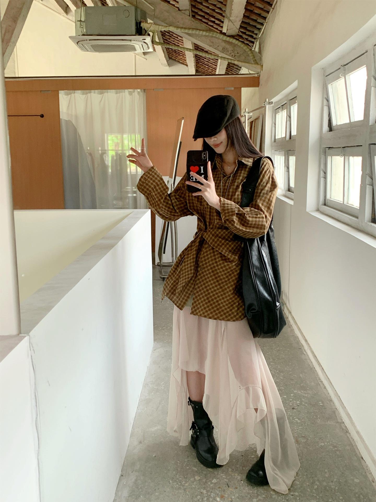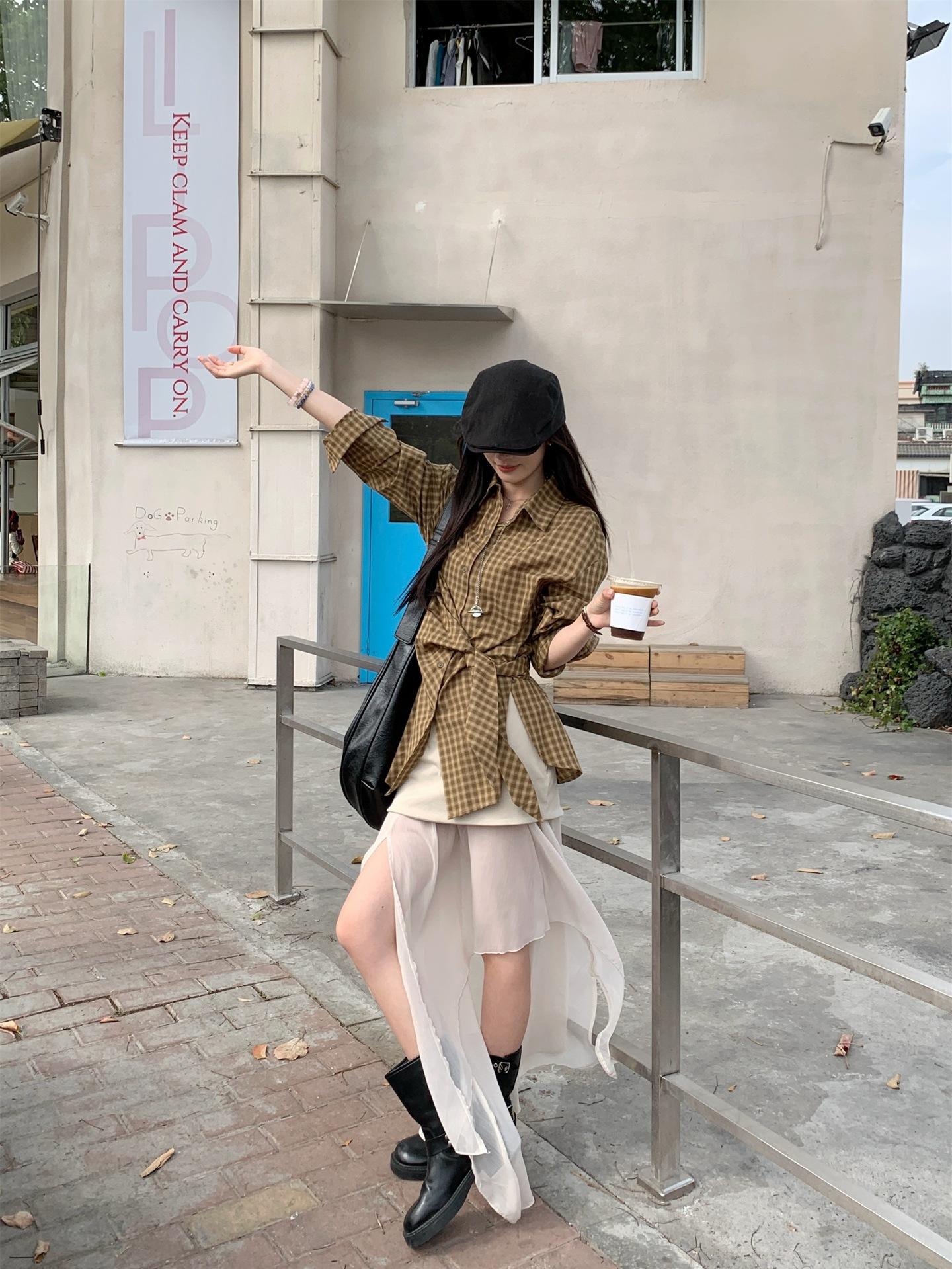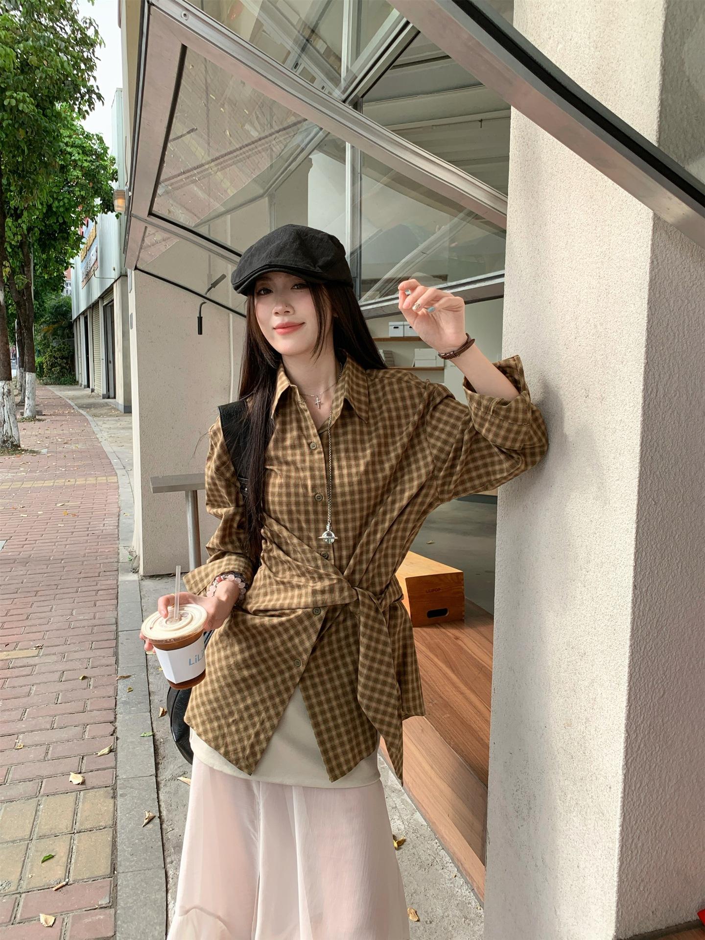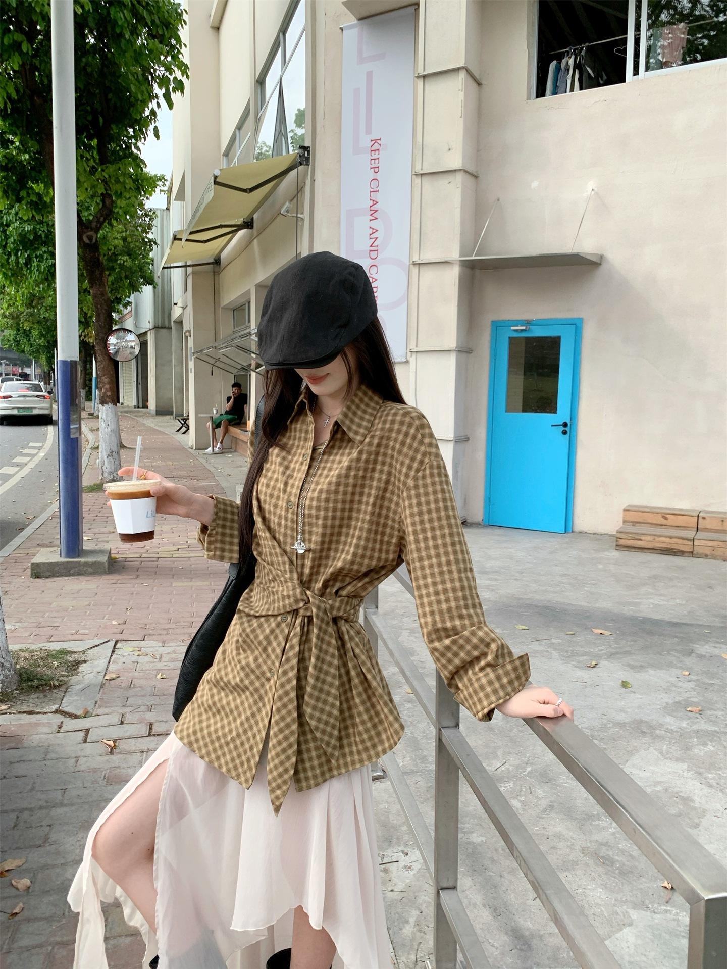 Camisa de Cuadros de Estilo Coreano de Manga Larga para Mujer Verano 2025 Nueva Suelta Media Longitud con Cordones Combinable Camisa Protector Solar Top