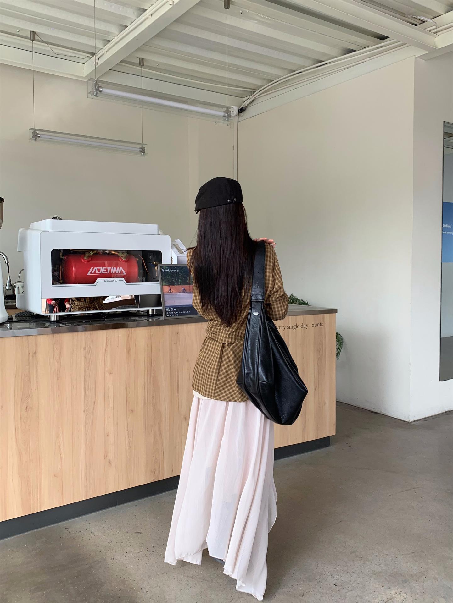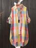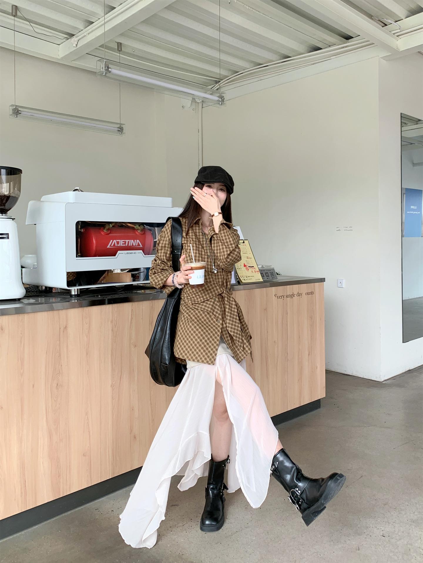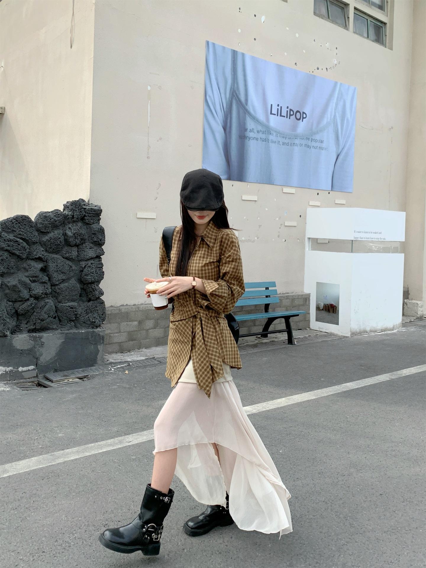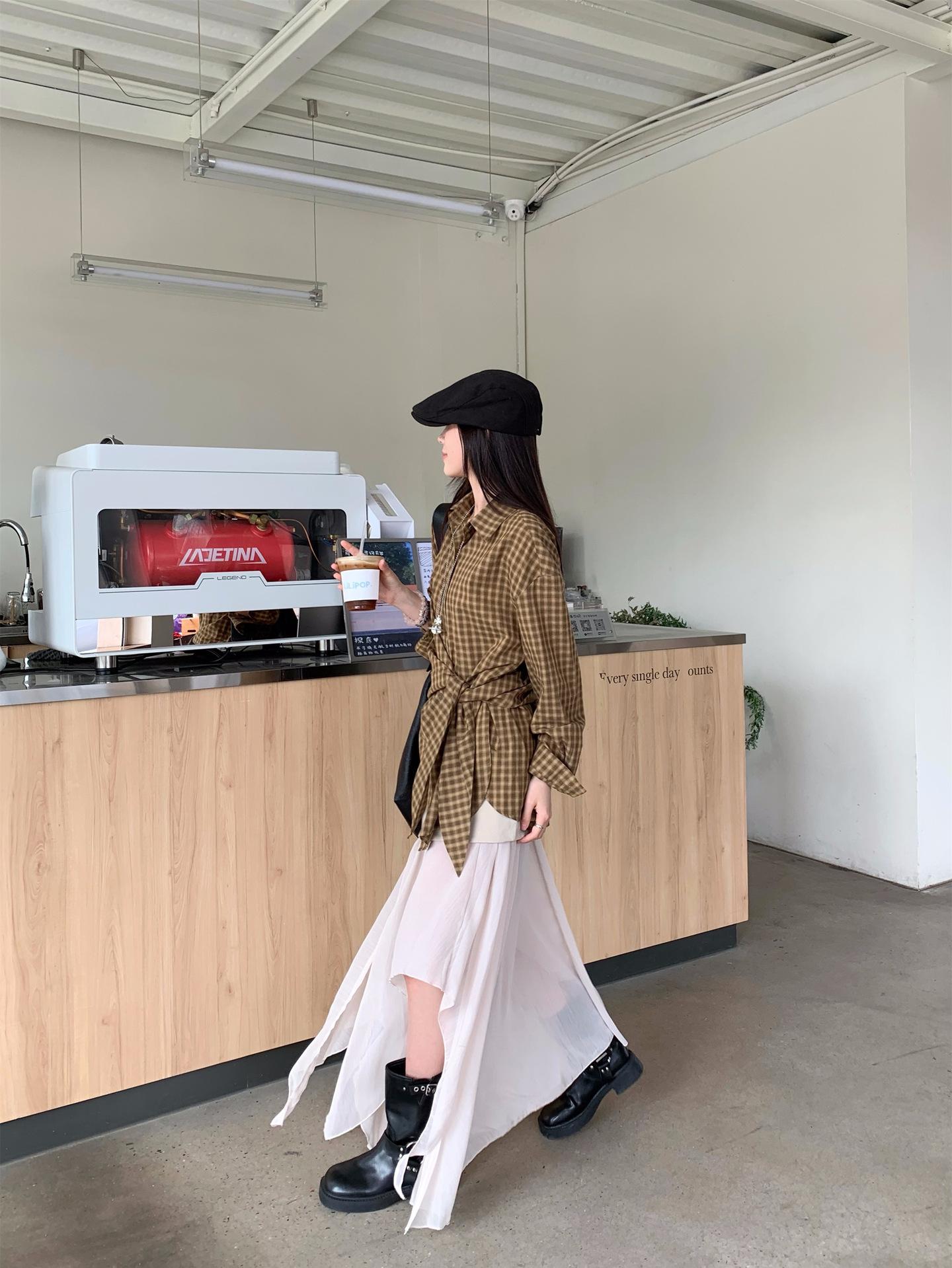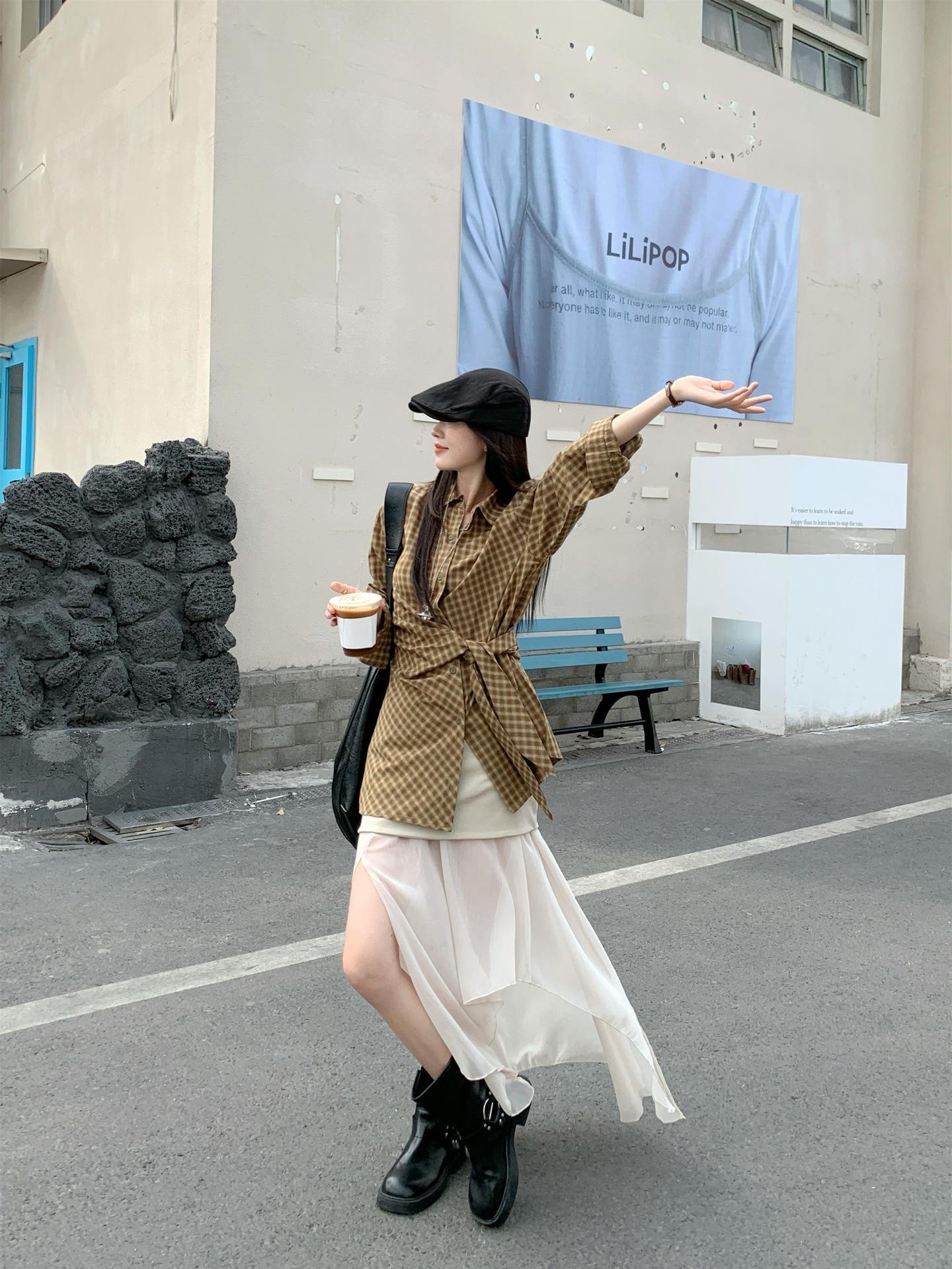 Camisa de Cuadros de Estilo Coreano de Manga Larga para Mujer Verano 2025 Nueva Suelta Media Longitud con Cordones Combinable Camisa Protector Solar Top