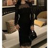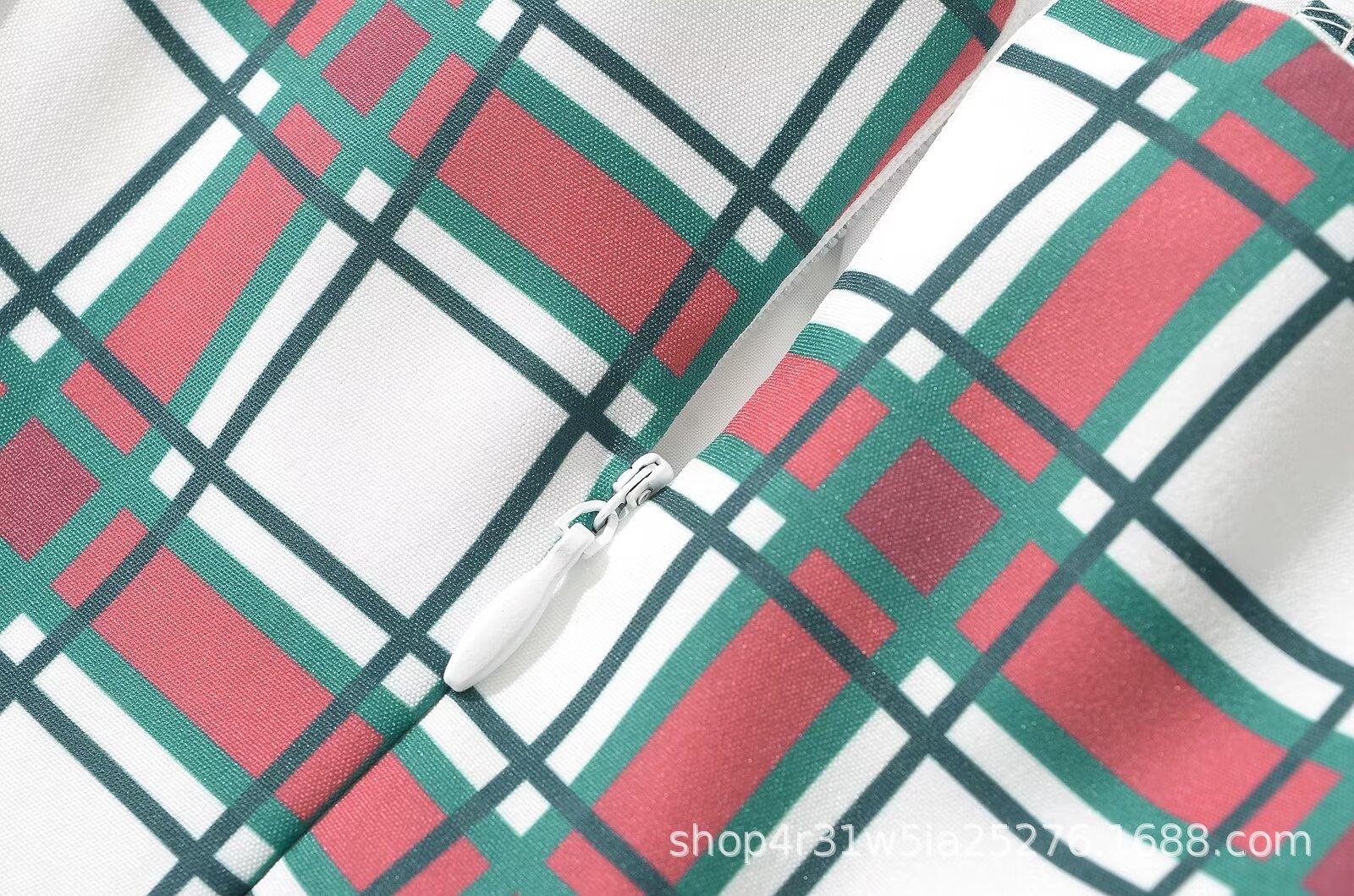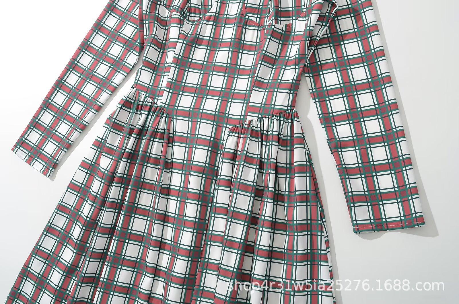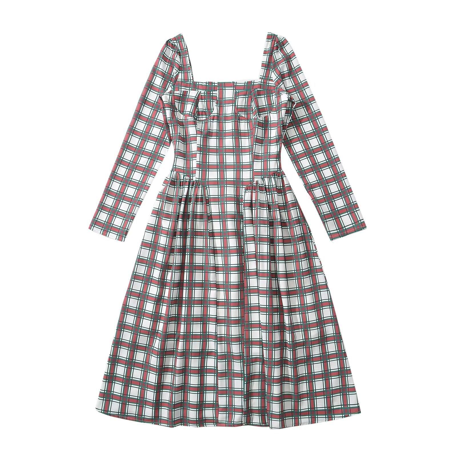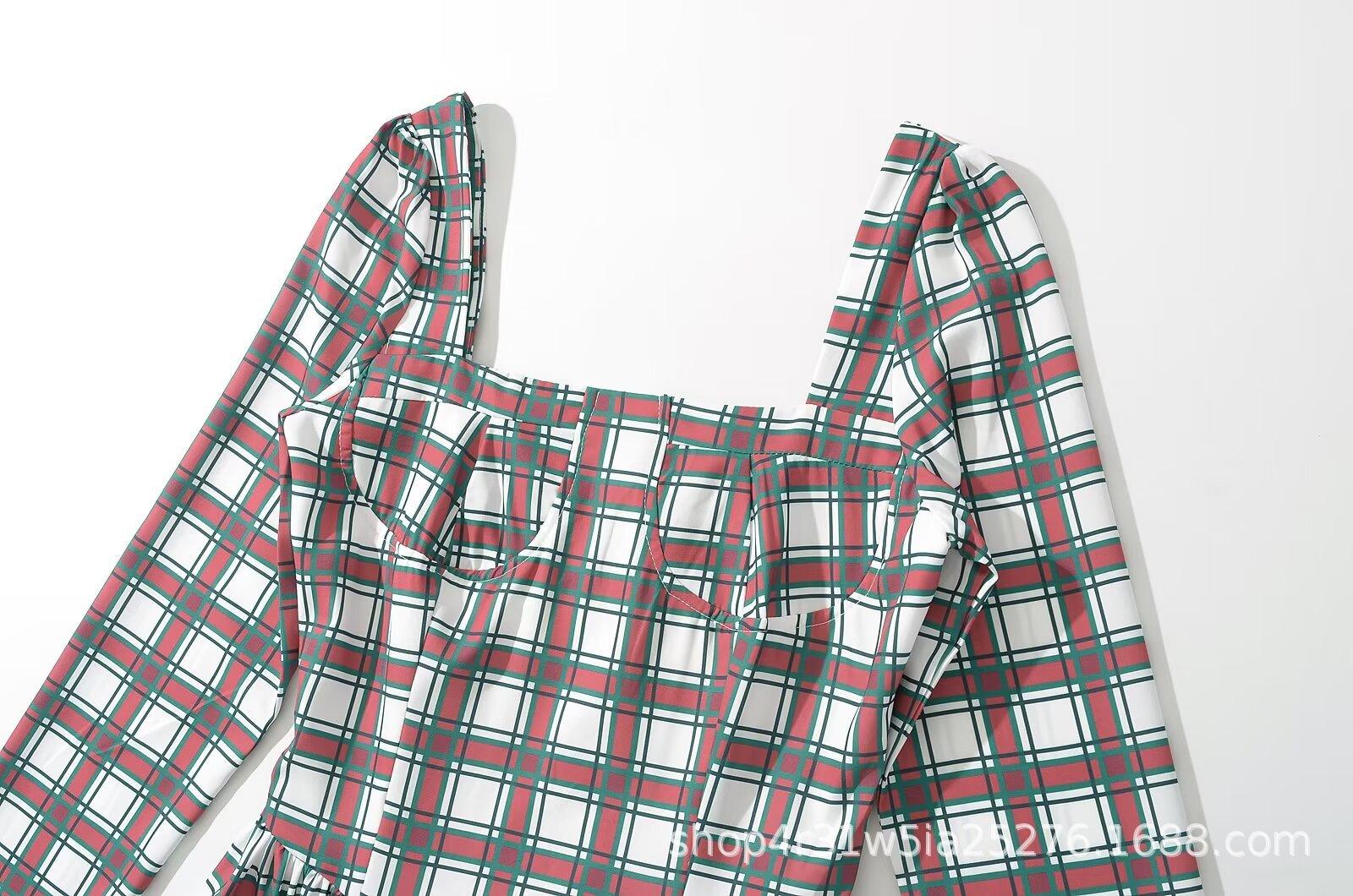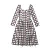 Estilo europeo y americano 2024 principios de primavera nueva ropa de mujer vestido francés retro de corte bajo con cuello cuadrado manga larga cintura a juego de color a cuadros