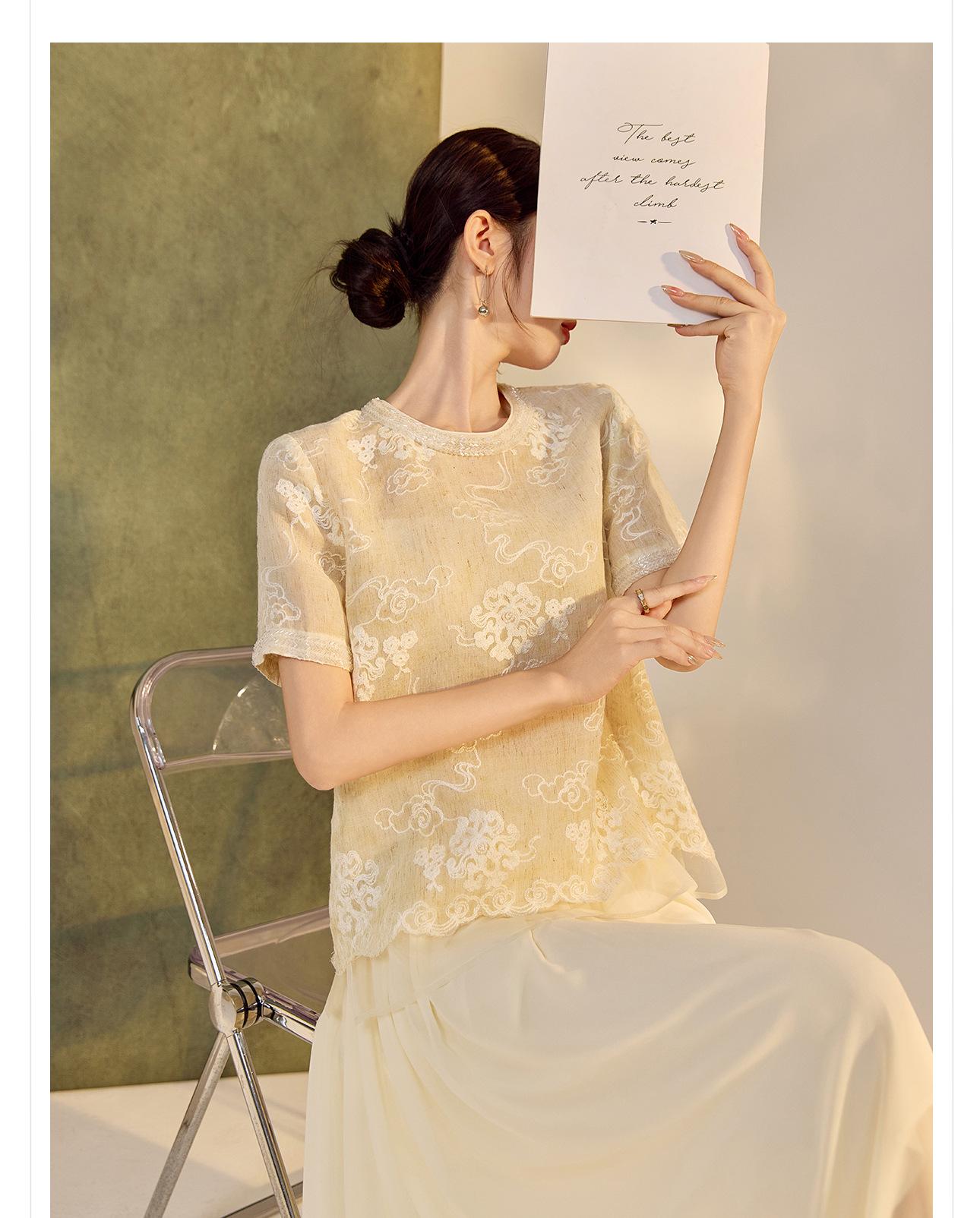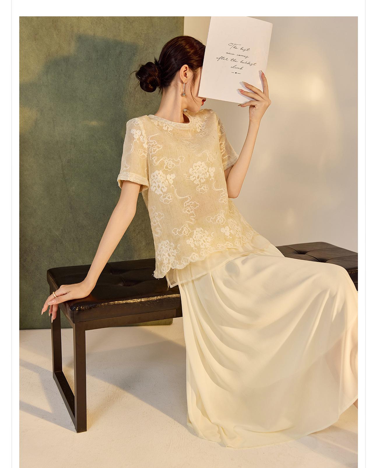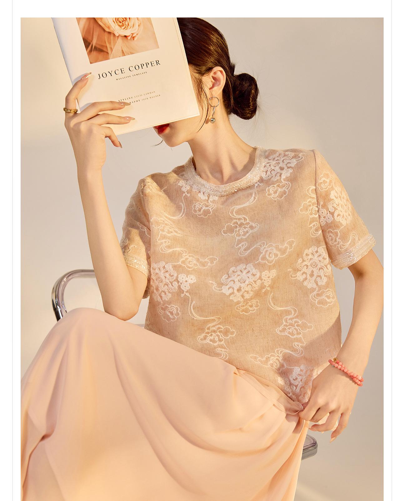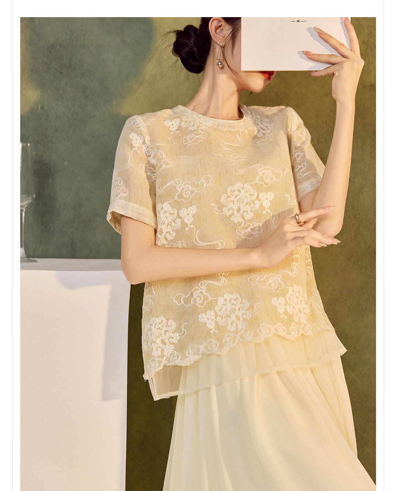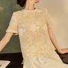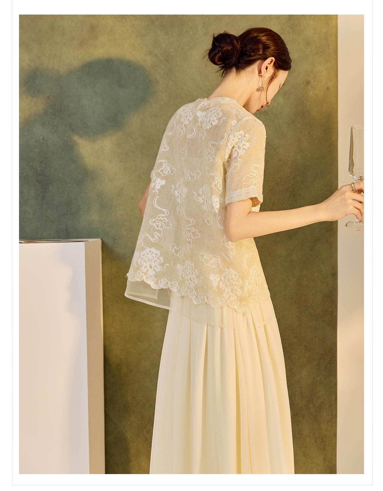 Nuevos Tops Elegantes con Cuentas Pesadas de Estilo Chino para Mujer Verano Camisas de Moda de Estilo Nacional Trajes de Falda de Color Puro N5065