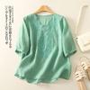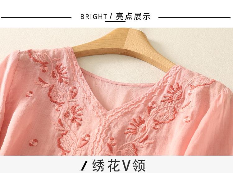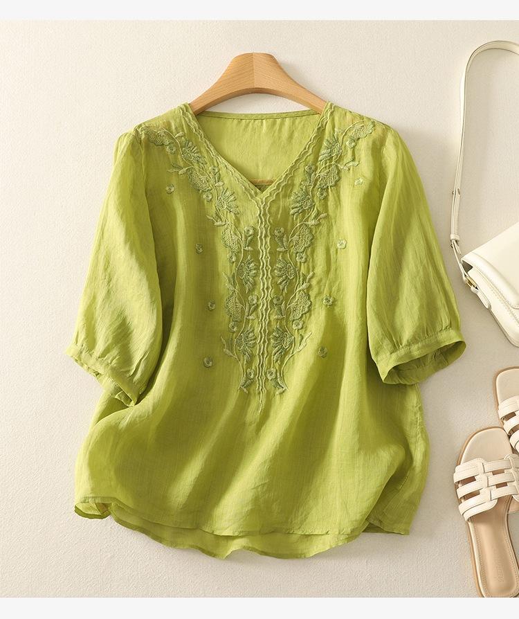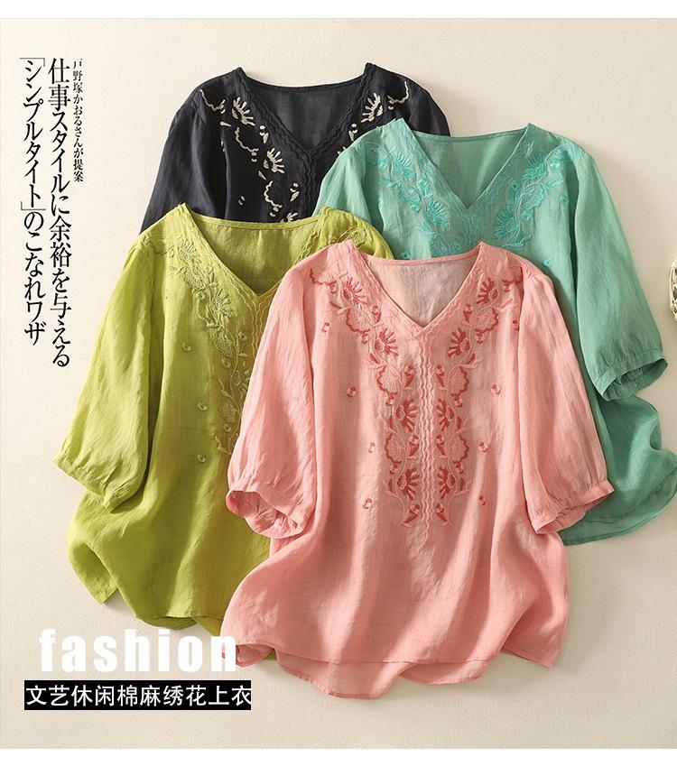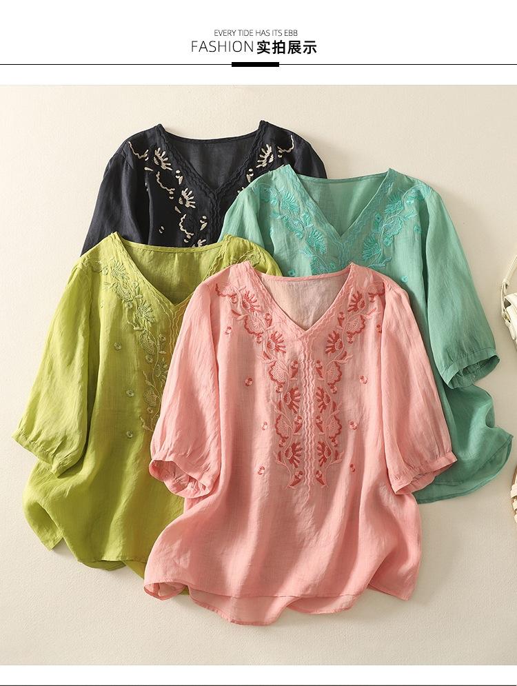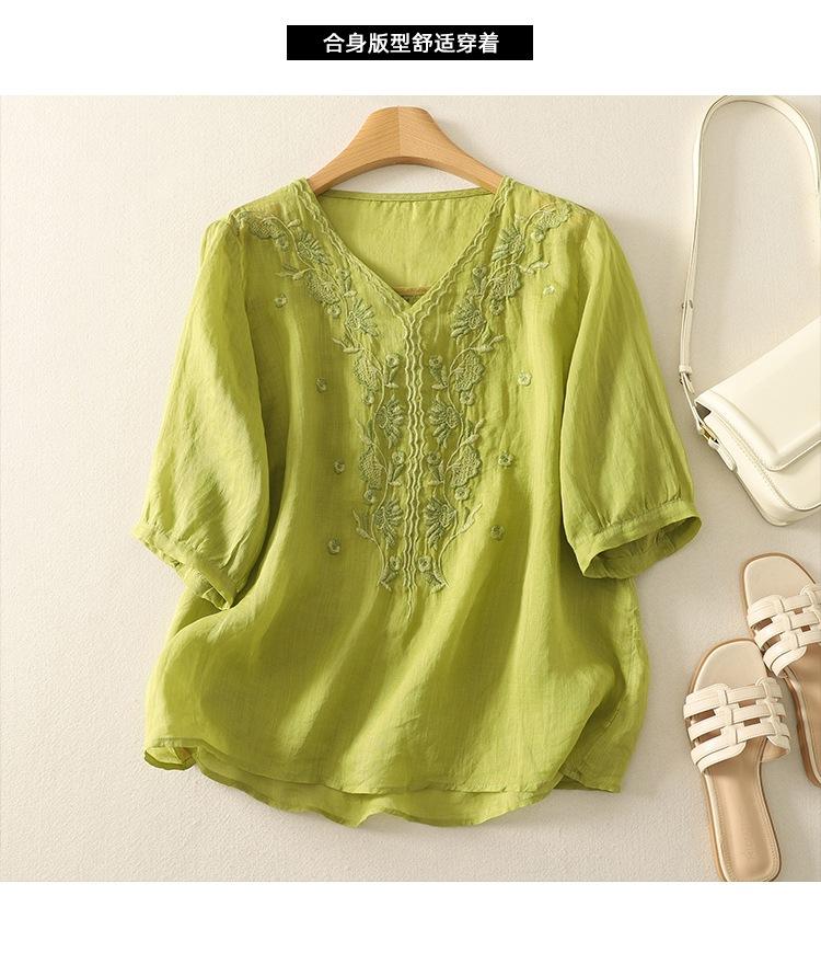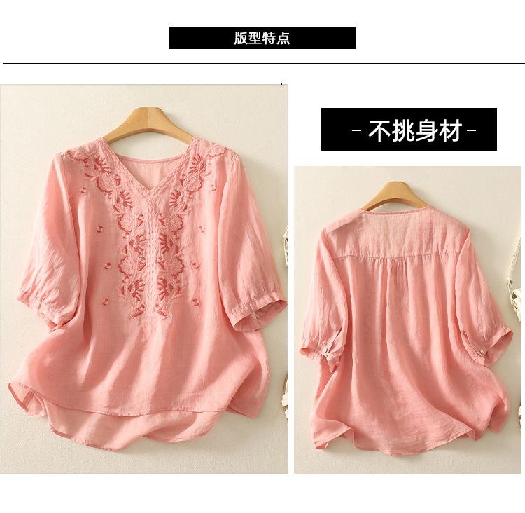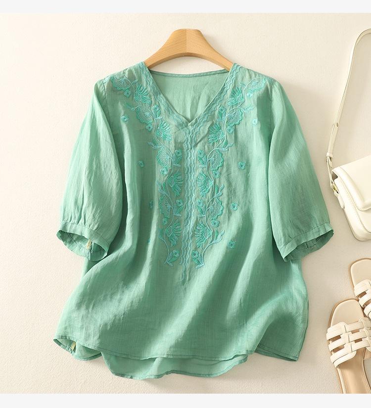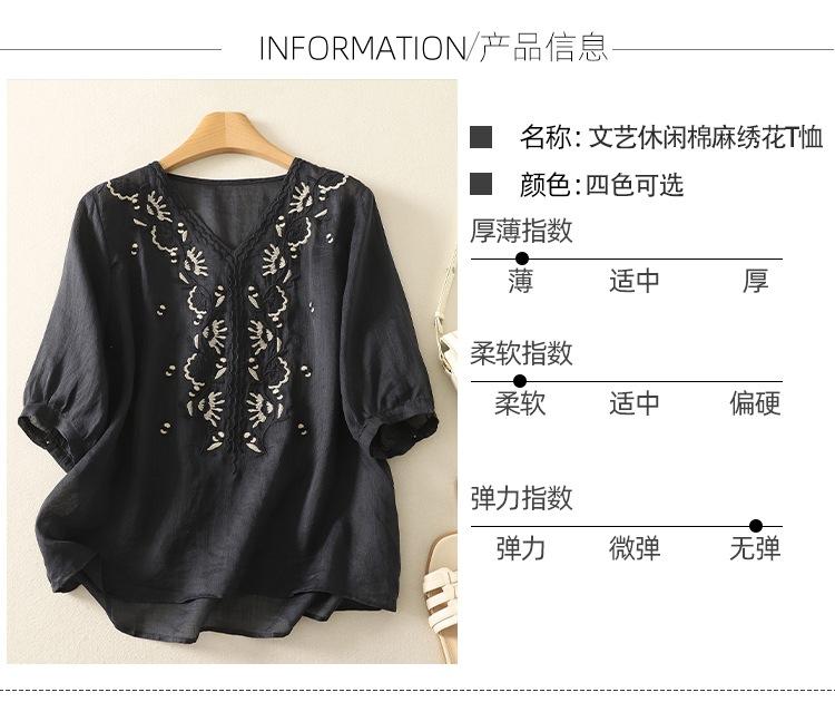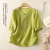 Verano 2025 Nuevo Estilo Literario Color Puro Algodón y Lino Bordado Cuello en V Jersey Nuevo Top Holgado y Versátil para Mujer