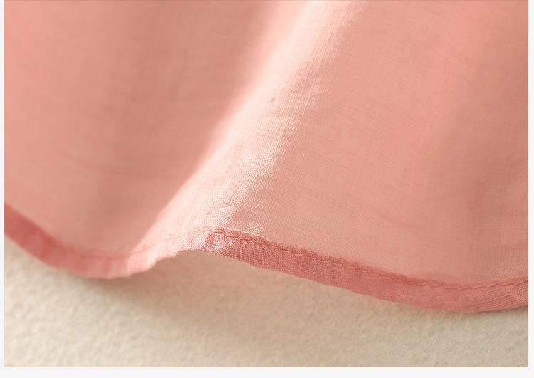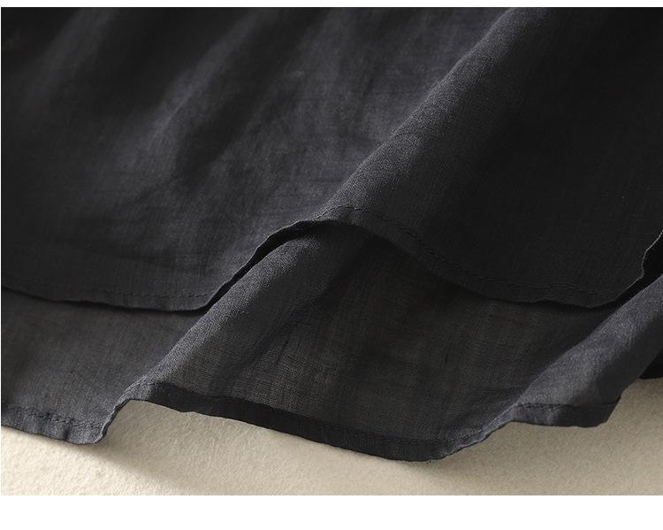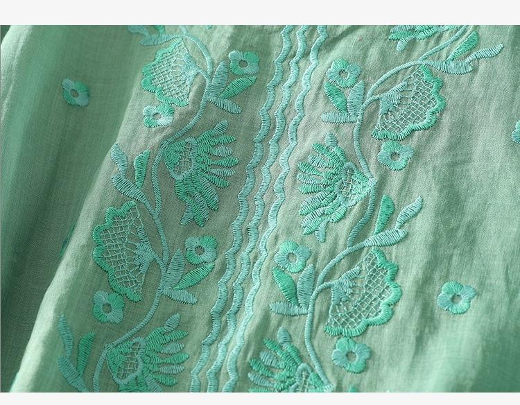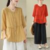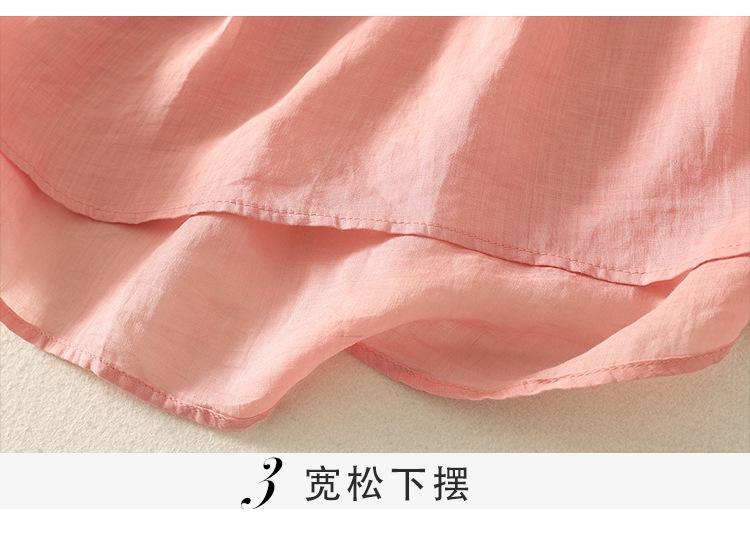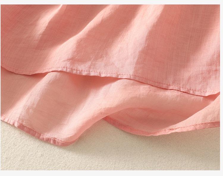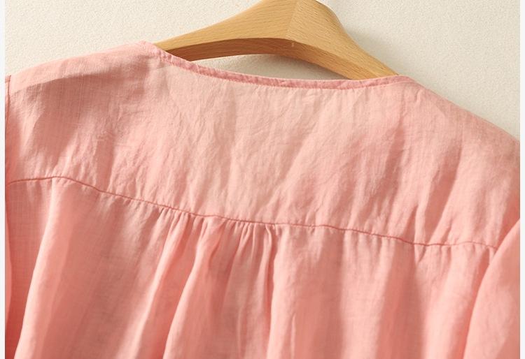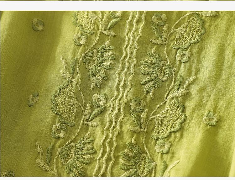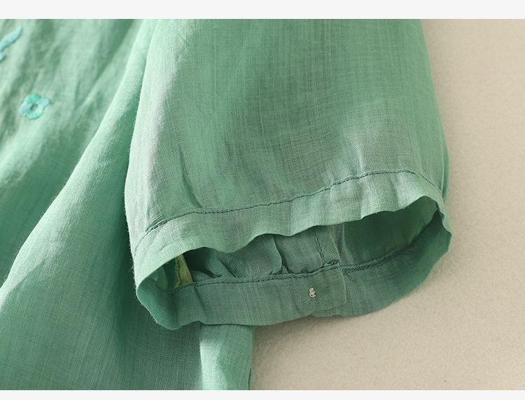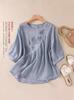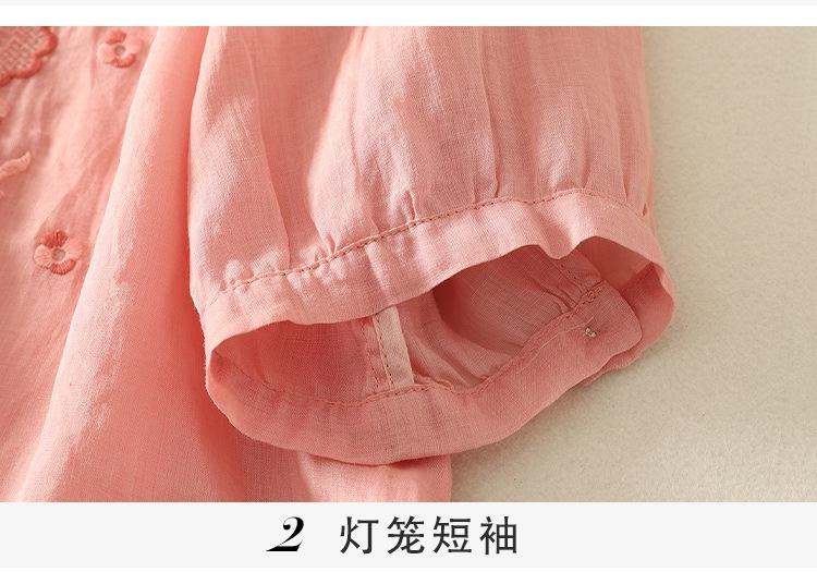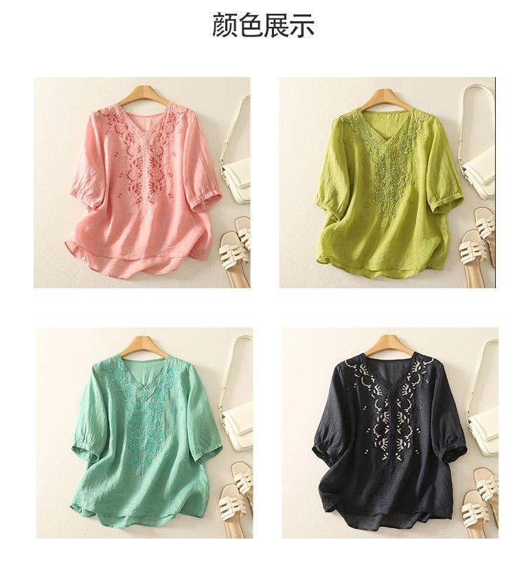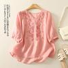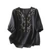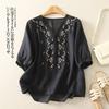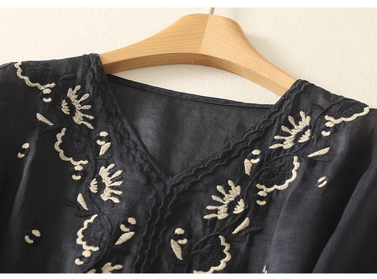 Verano 2025 Nuevo Estilo Literario Color Puro Algodón y Lino Bordado Cuello en V Jersey Nuevo Top Holgado y Versátil para Mujer
