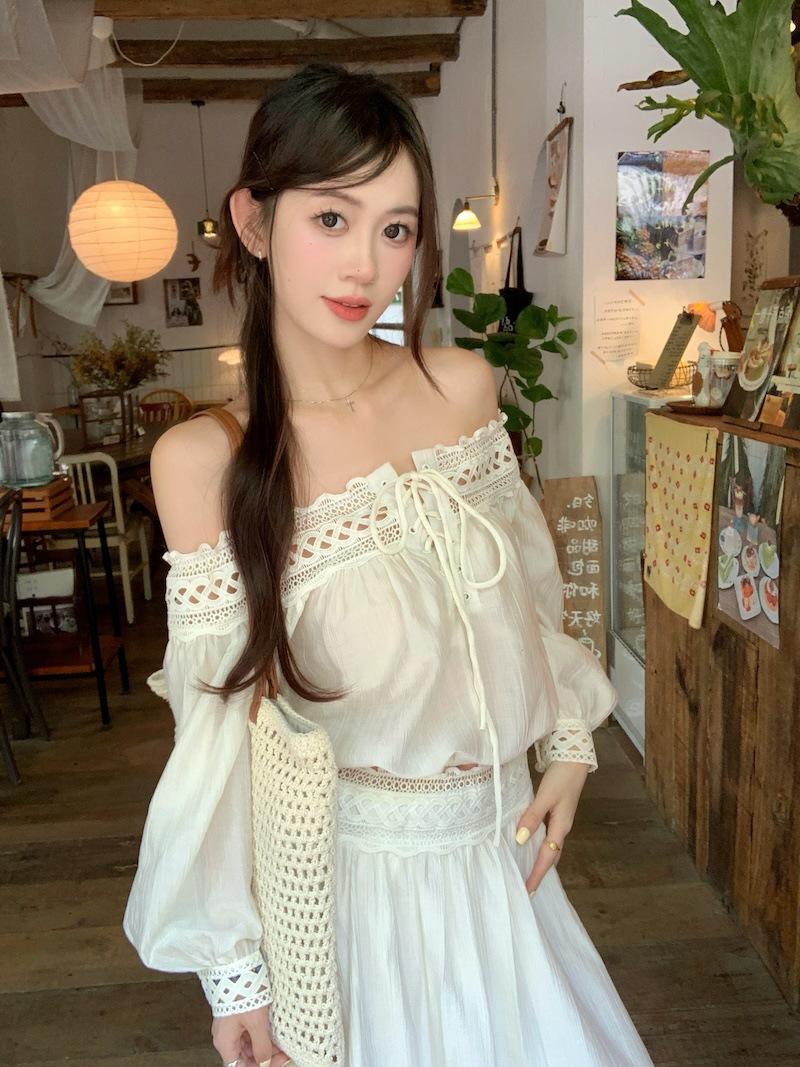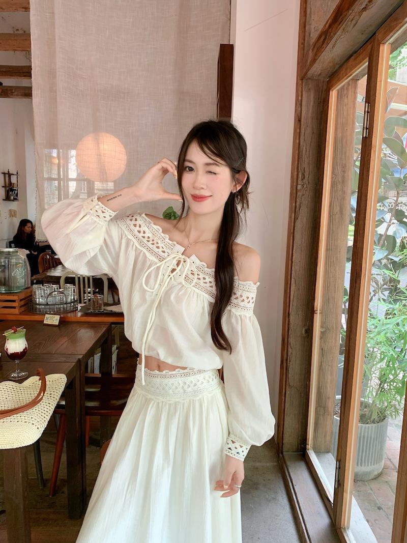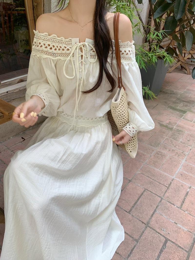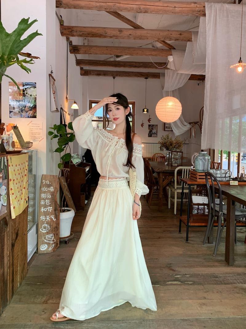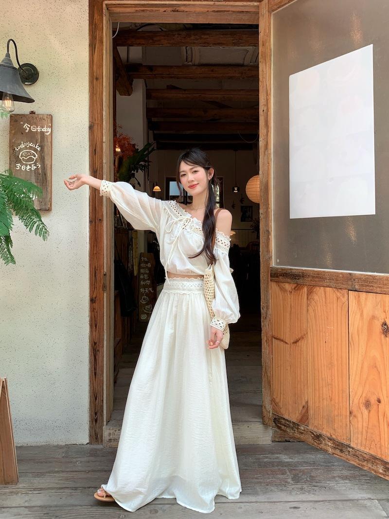 Conjunto de dos piezas de estilo informal para vacaciones en la playa, estilo coreano, elegante, con encaje, blusa y media falda.