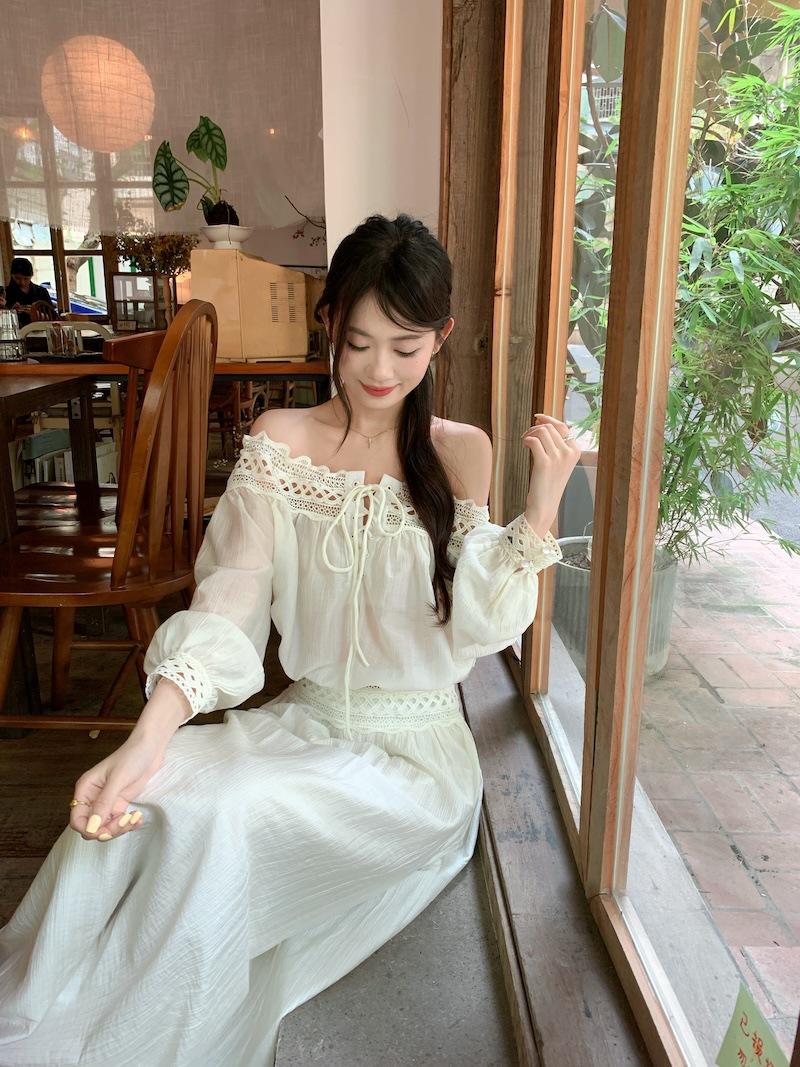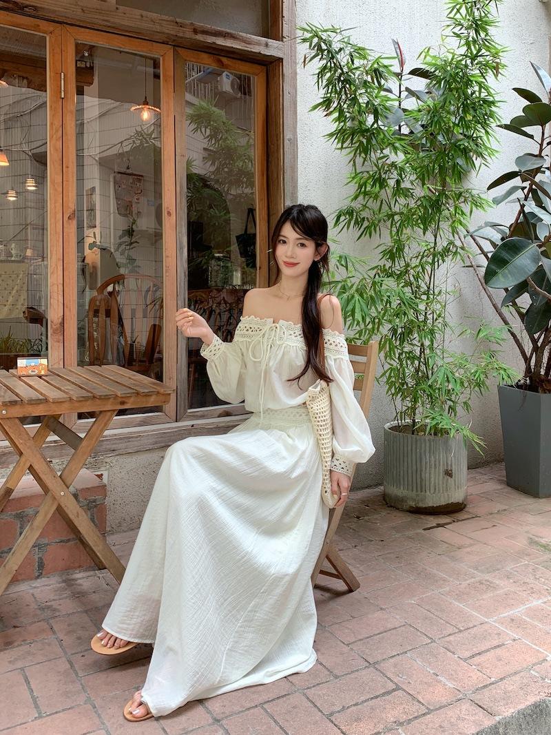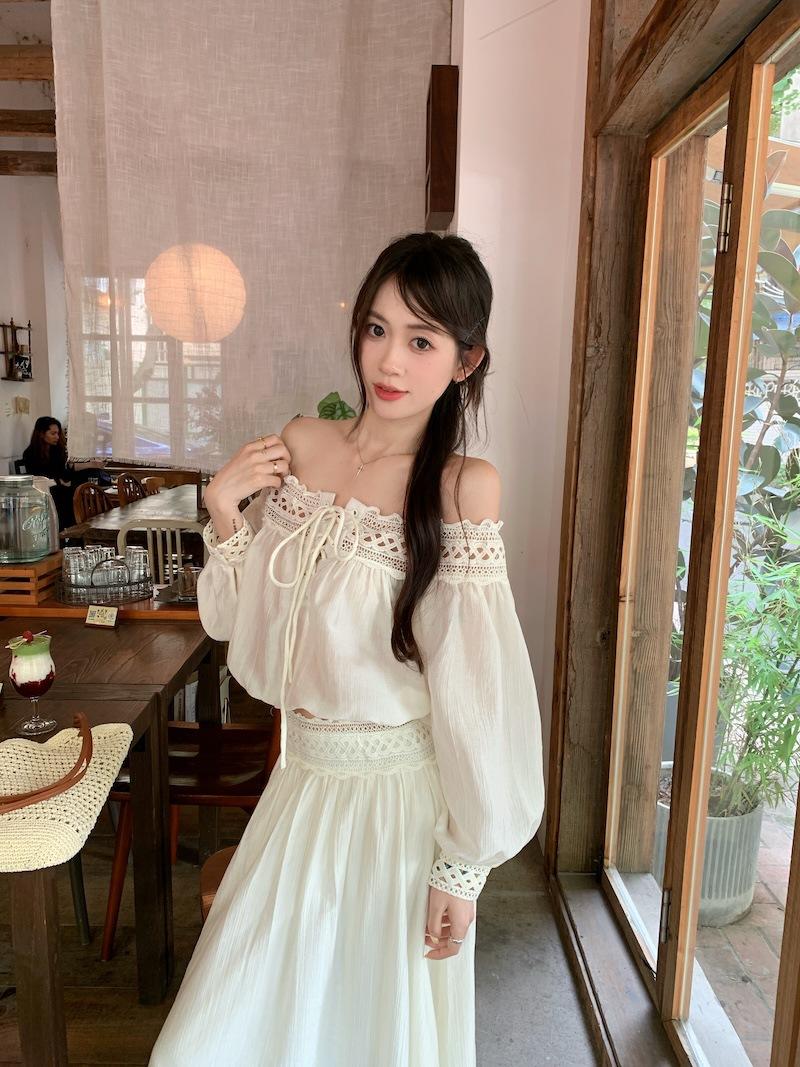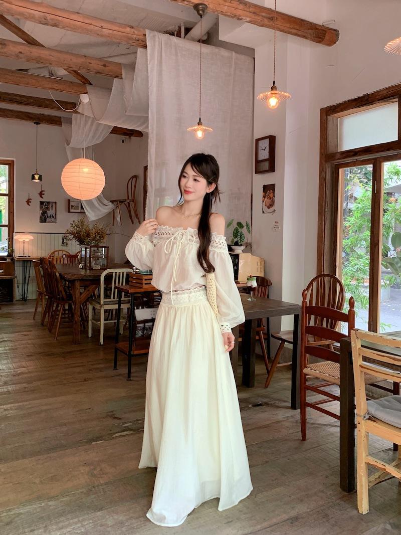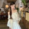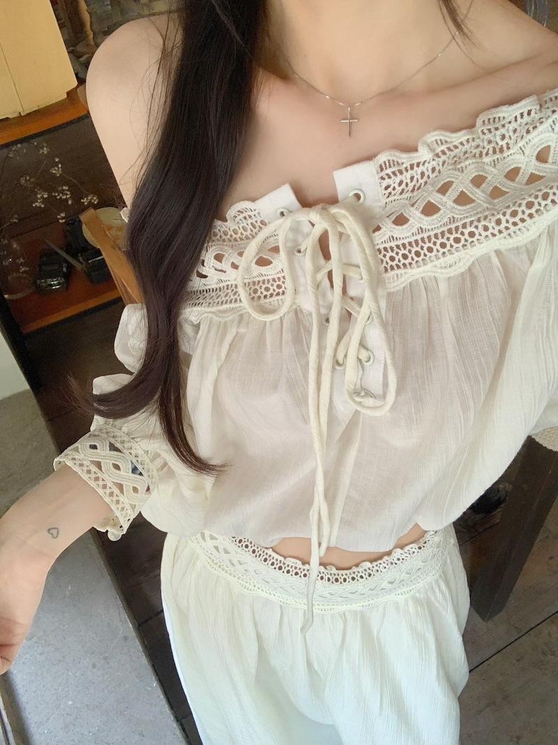 Conjunto de dos piezas de estilo informal para vacaciones en la playa, estilo coreano, elegante, con encaje, blusa y media falda.