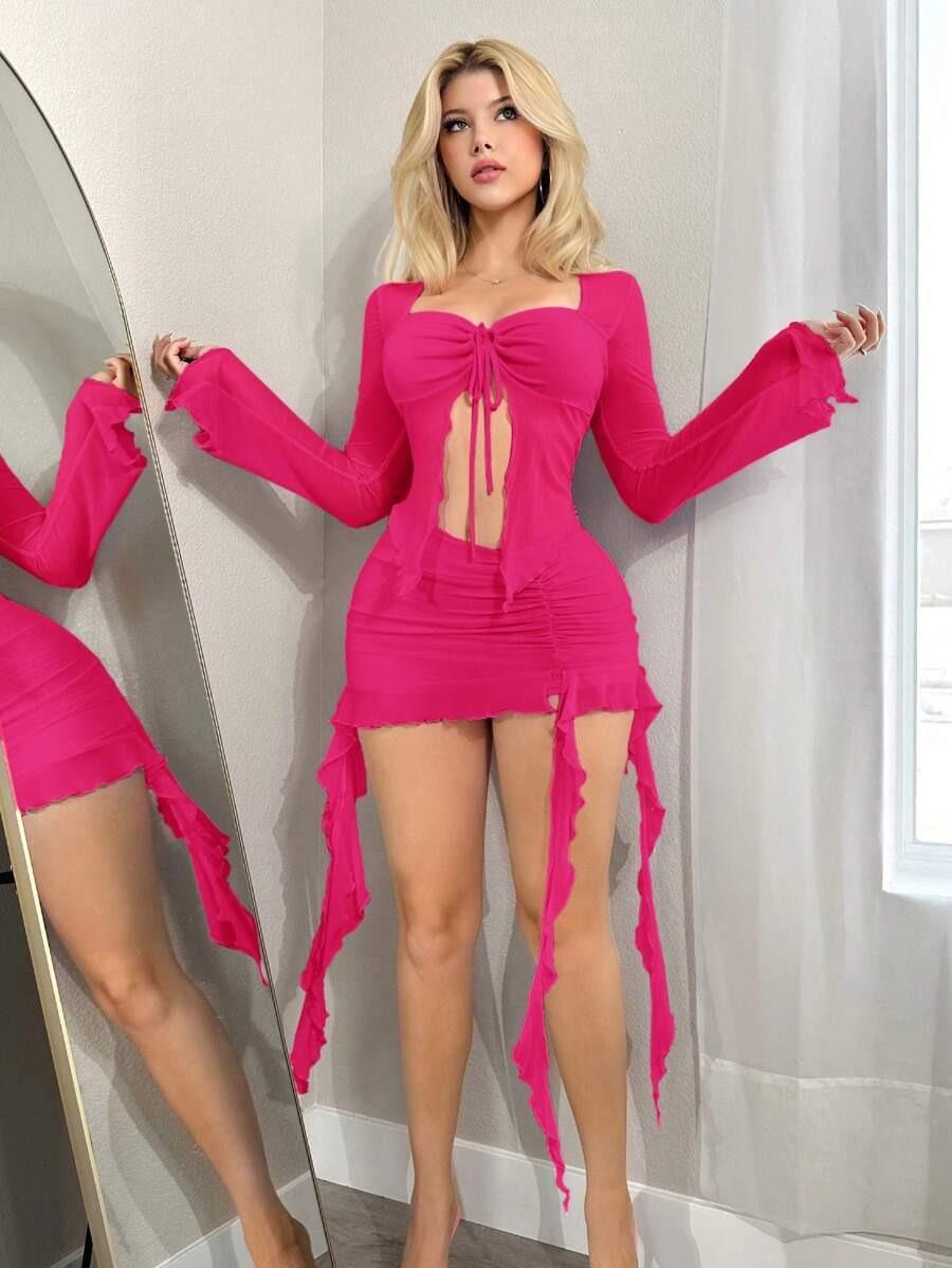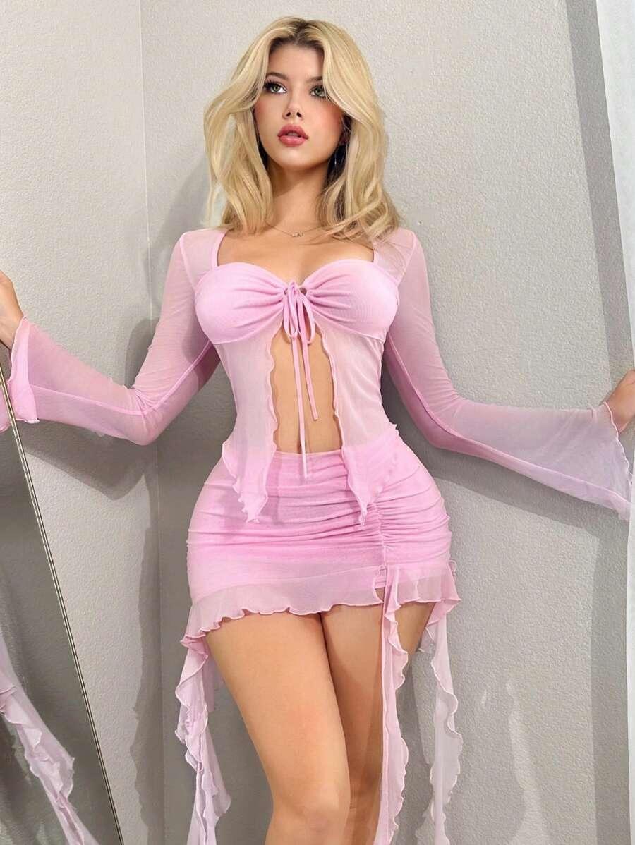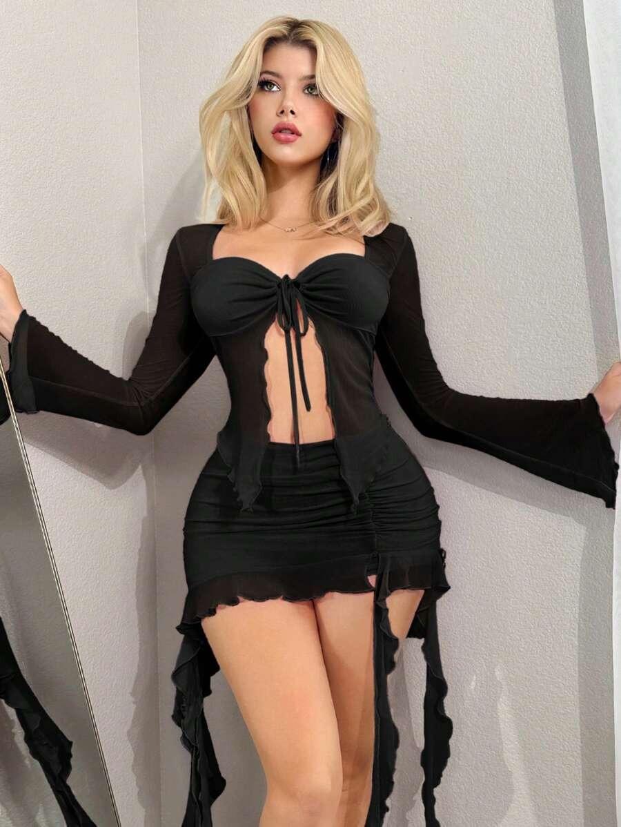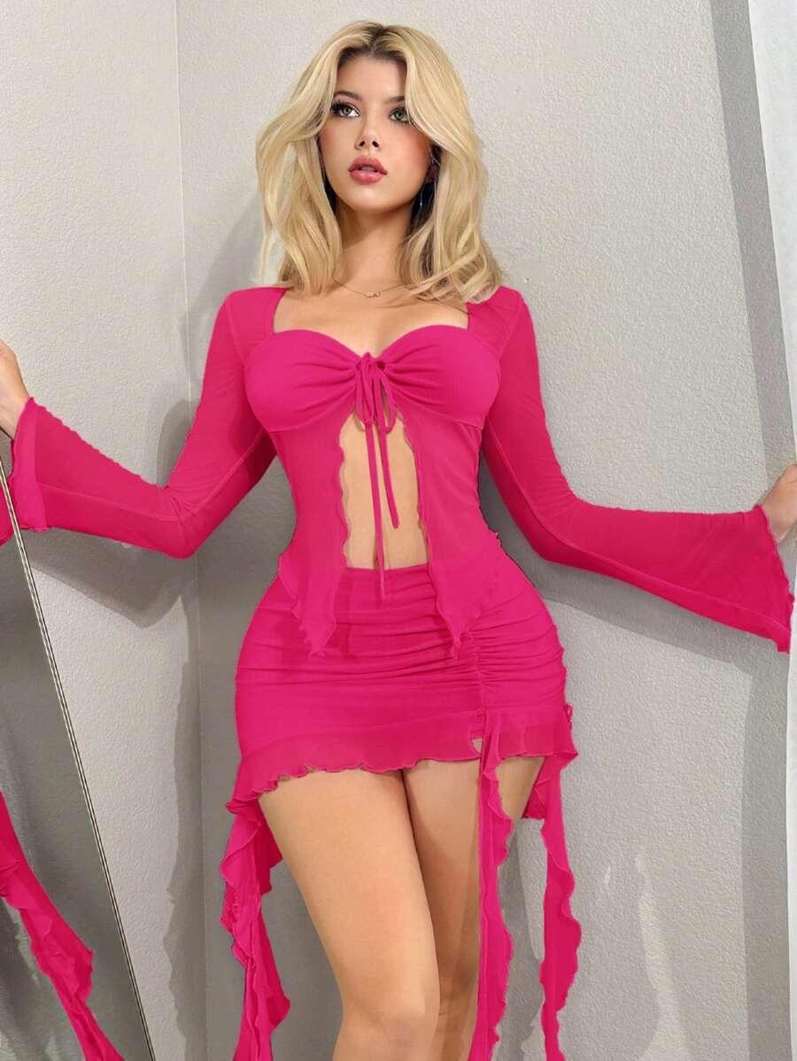 Traje de Chica Sexy Europea y Americana Cárdigan con Cordones Malla Transparente Recorte Falda de Verano de Manga Larga Conjunto de Dos Piezas con Cinta