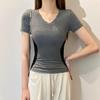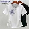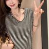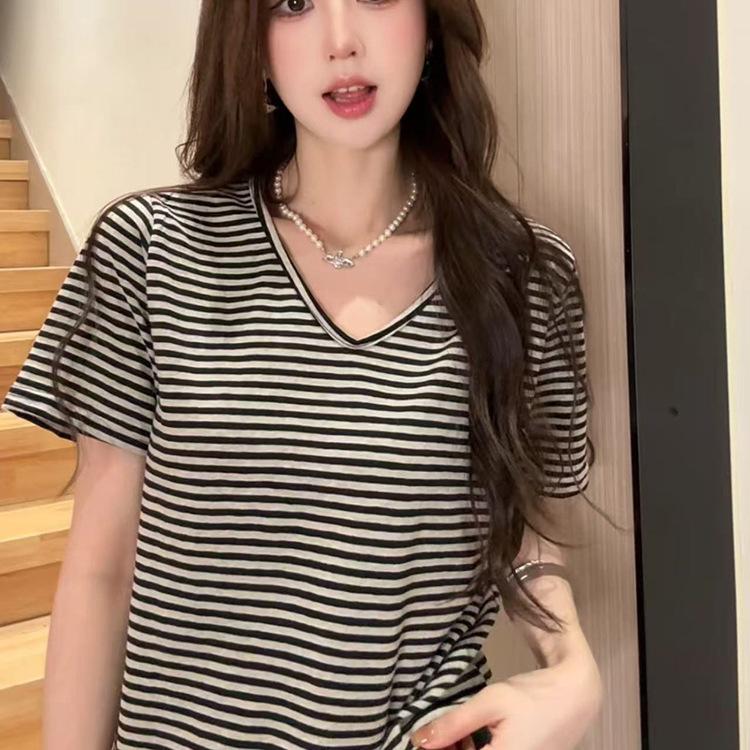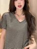 Camiseta de Manga Corta a Rayas para Mujer 2025 Verano Nuevo Estilo Ropa de Trabajo Versátil Holgada Look Adelgazante Casual Hombro Derecho Cuello en V Top