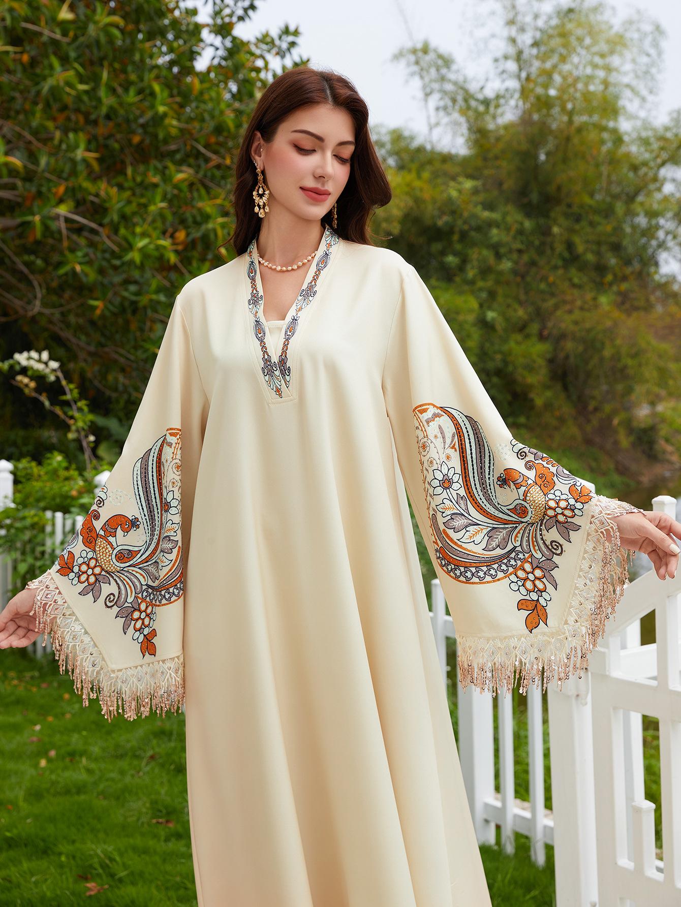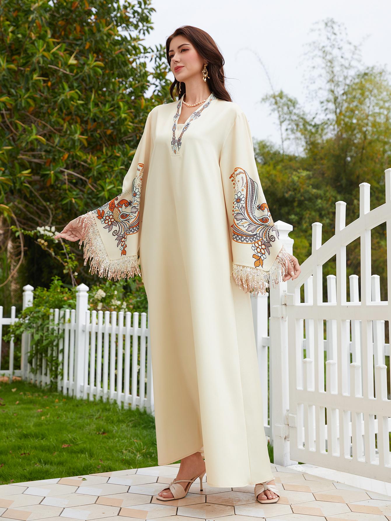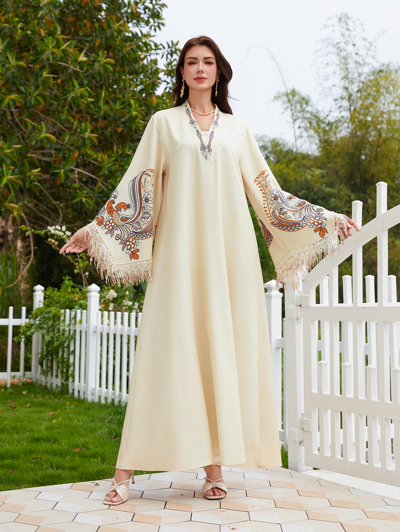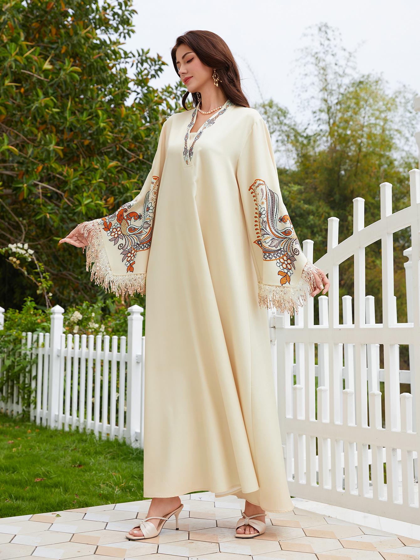 NC44 Medio Oriente Transfronterizo Bata Musulmana para Damas Cuello en V Estampado Borla Temperamento Vestido Árabe Abaya