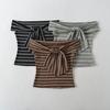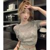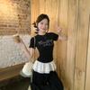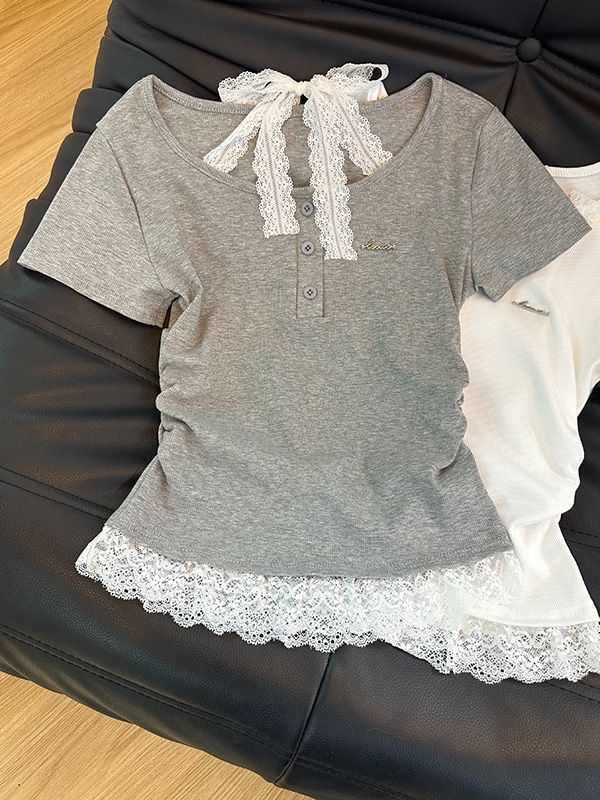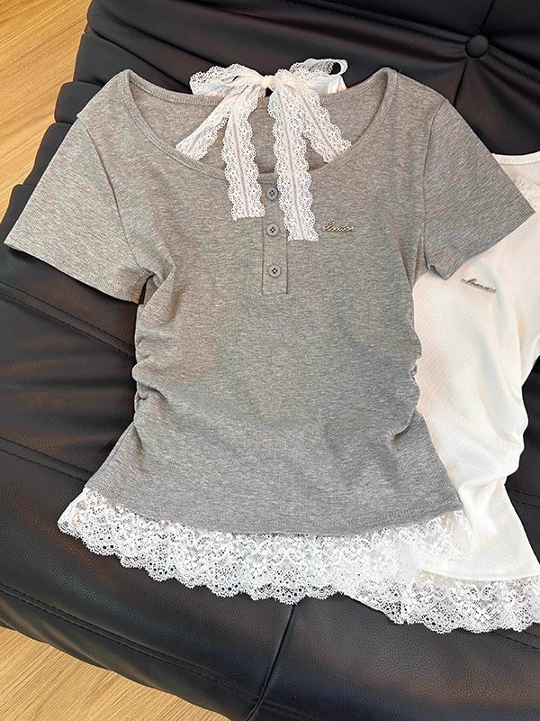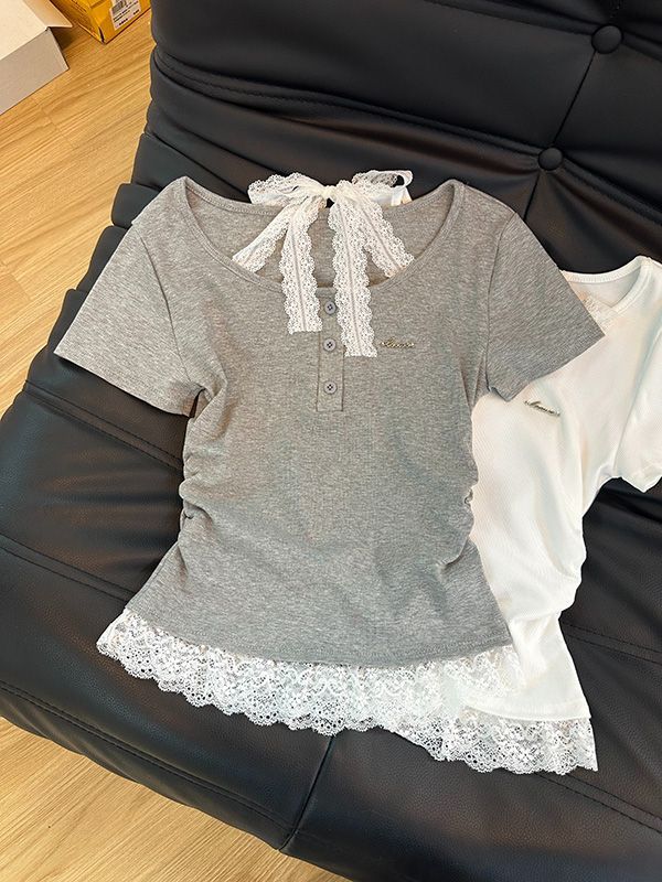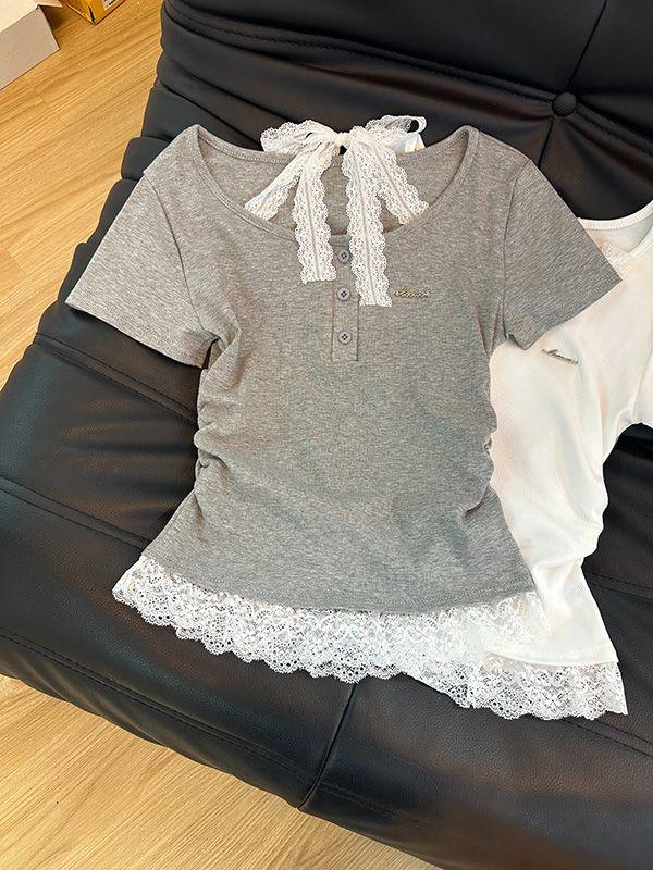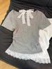 Camiseta de Verano para Mujer con Cuello Cuadrado Dulce Halter Encaje Hombro Derecho Manga Corta Ajustada a la Cintura Top Corto Asimétrico