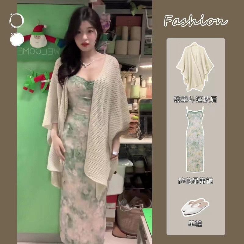 ◎▽Knitted cardigan + floral lace cami dress◎▽