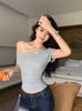 Playera Gris de Hombro con Cuello Inclinado de Manga Corta para Mujer Verano Ajustada Adelgazante Diseño Interno Top Corto Básico para Chica Hot