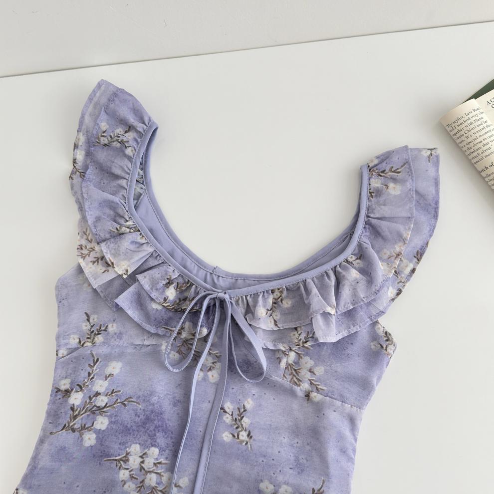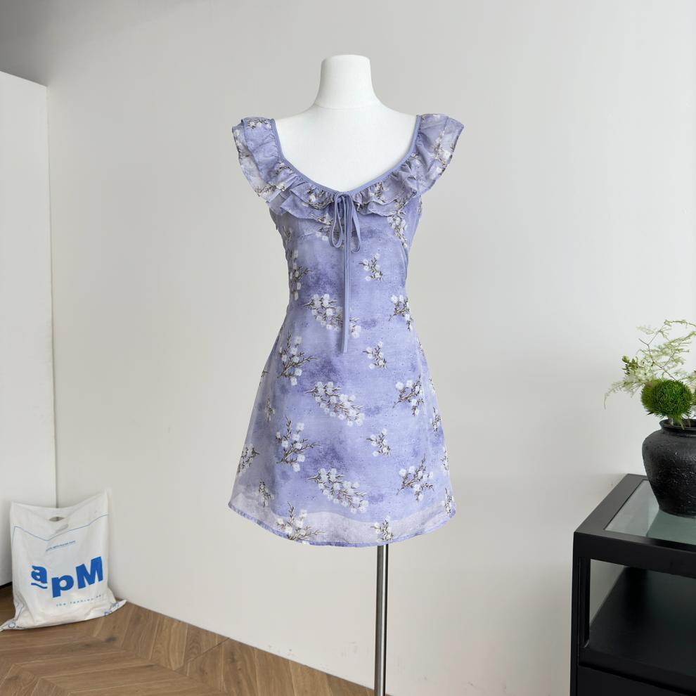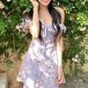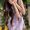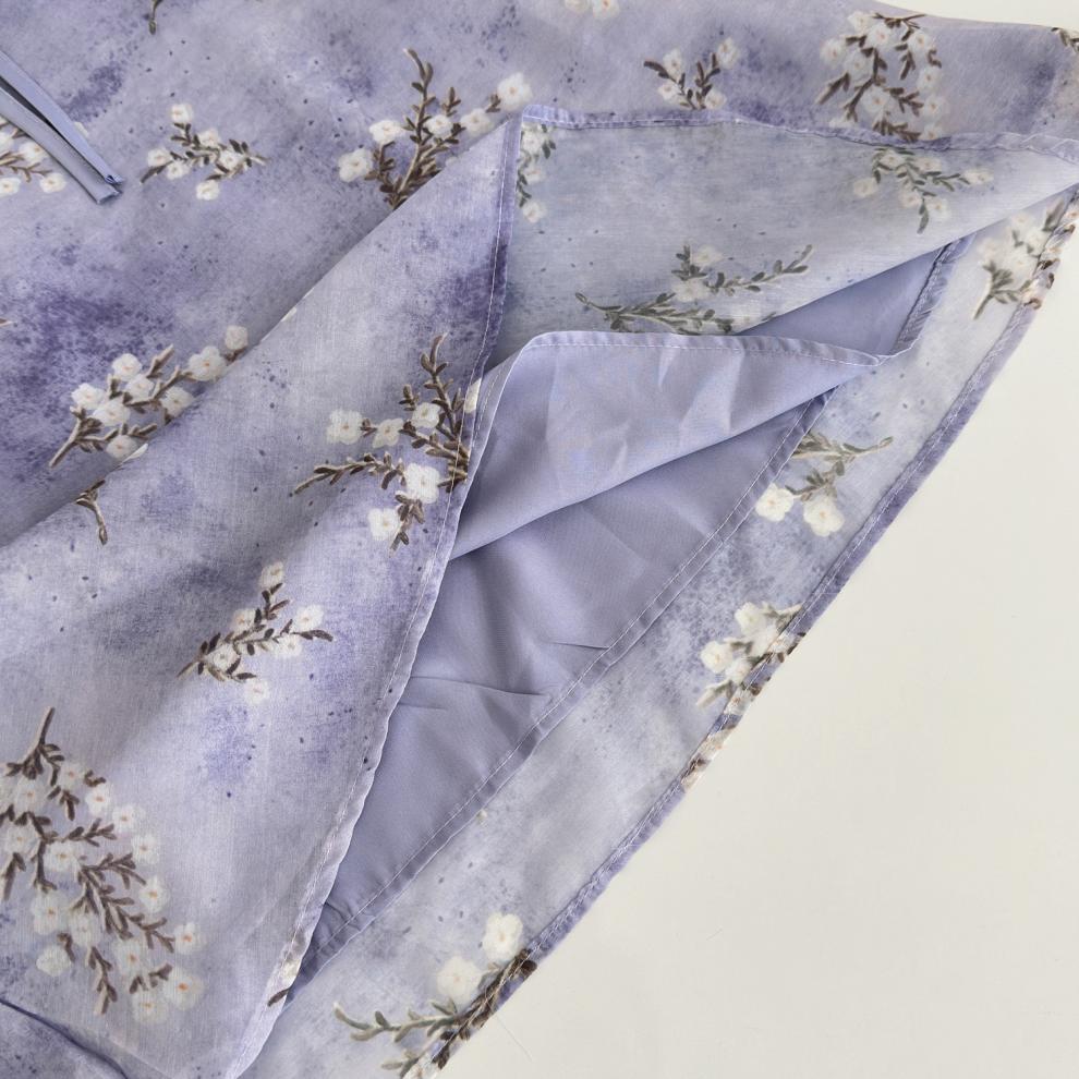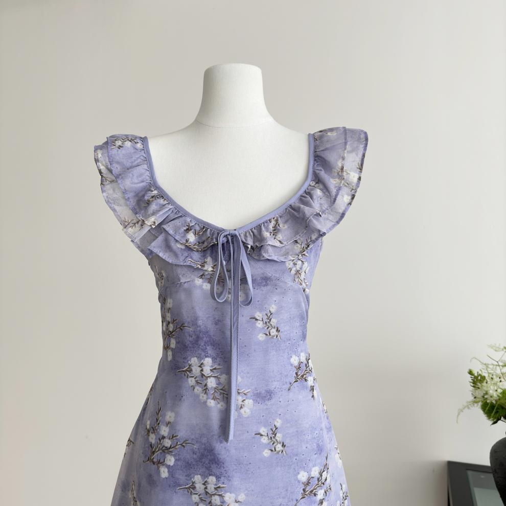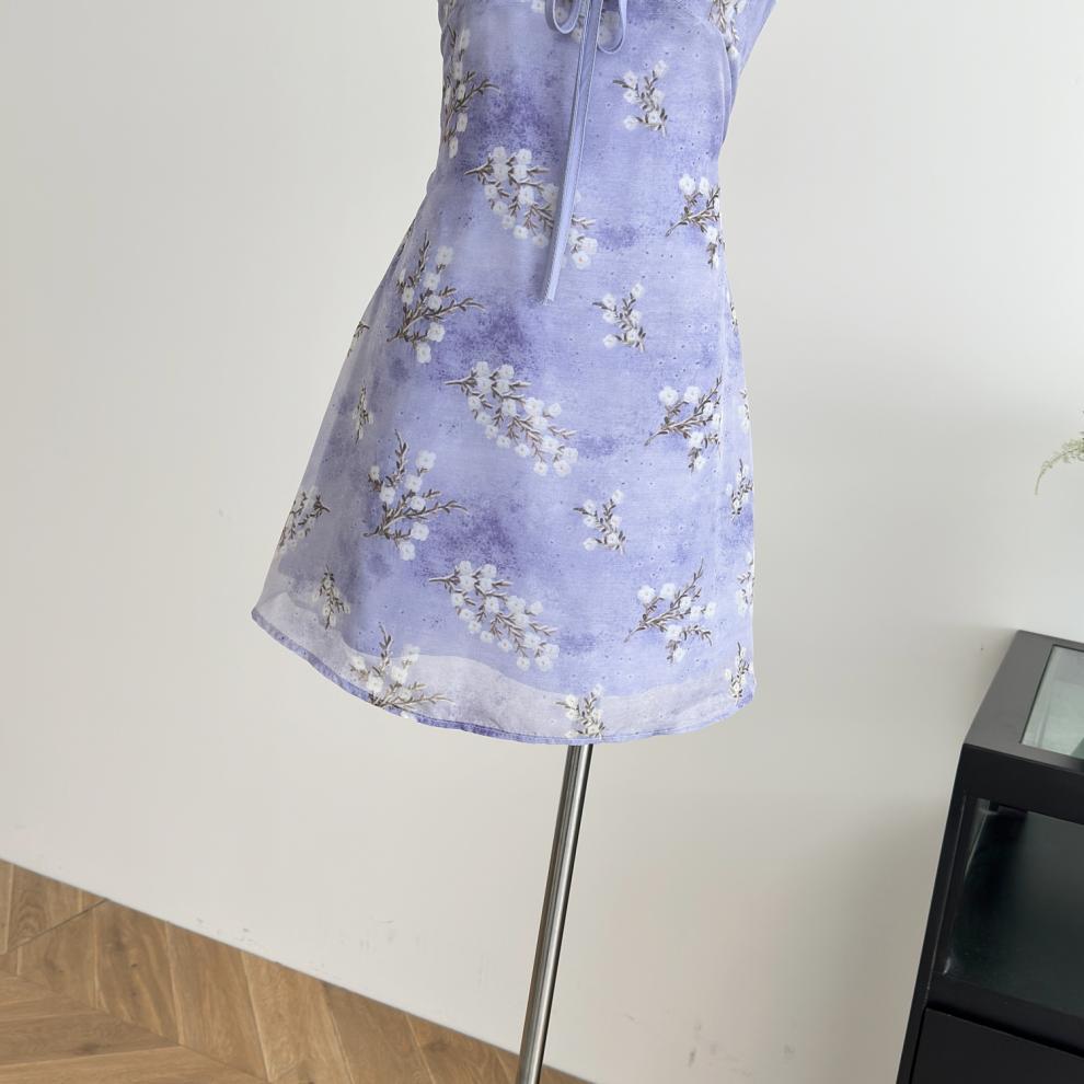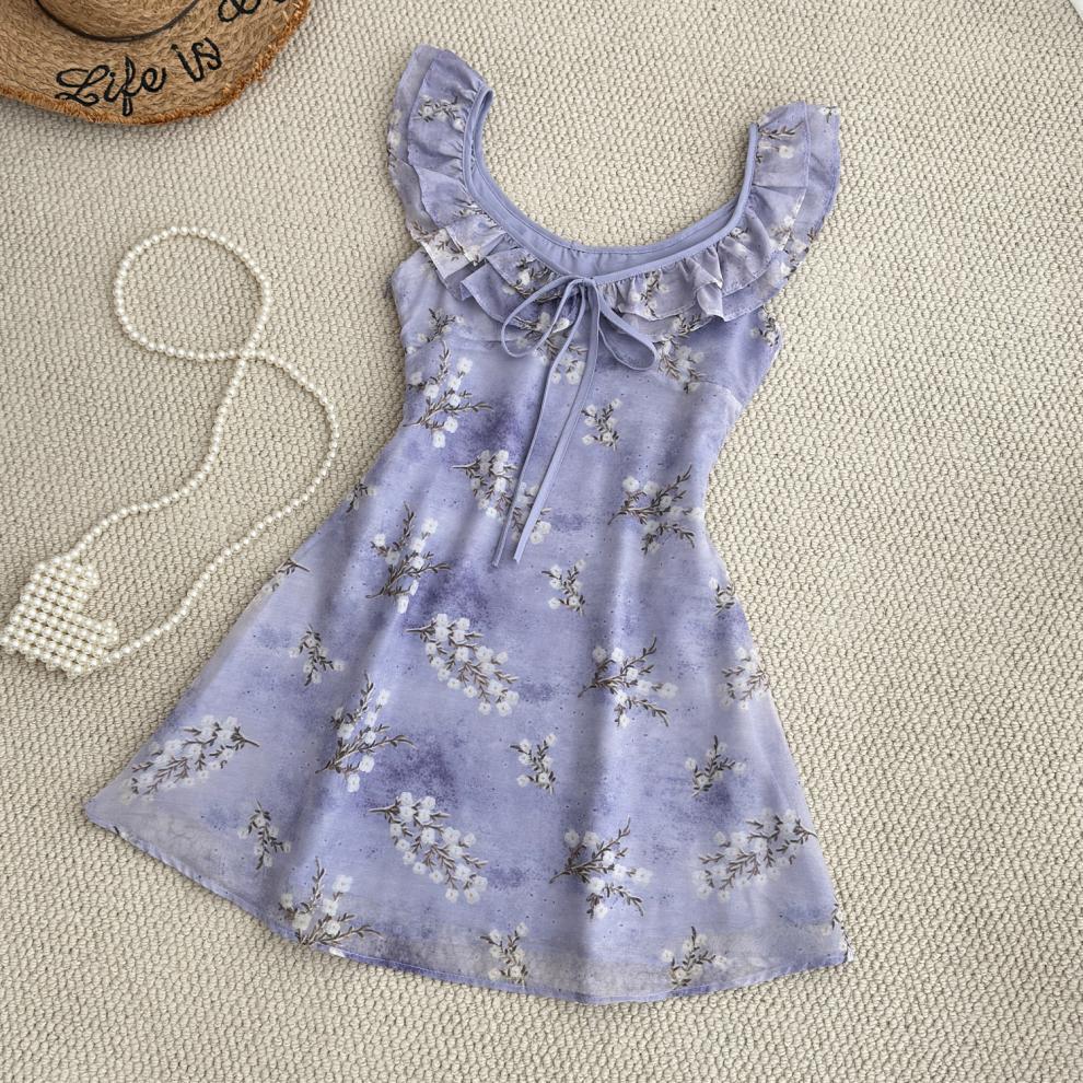 Vestido de Verano de Gasa Floral Francés 2025 Vestido de Verano para Mujer 2025 Nuevo Ajustado Morado Línea A Falda Corta