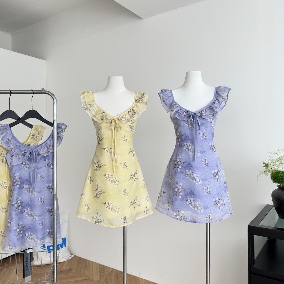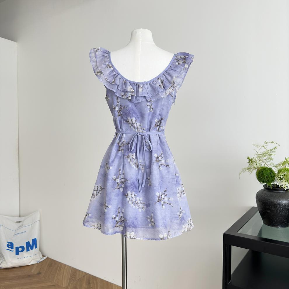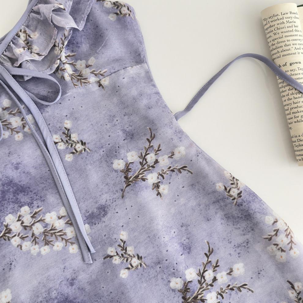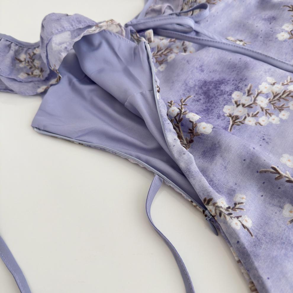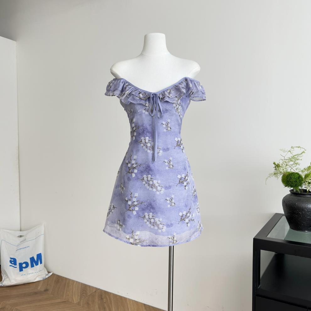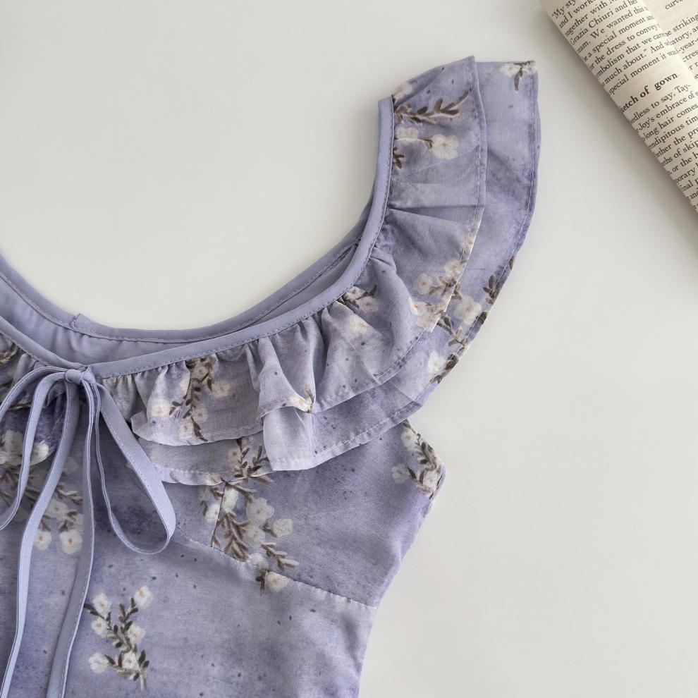 Vestido de Verano de Gasa Floral Francés 2025 Vestido de Verano para Mujer 2025 Nuevo Ajustado Morado Línea A Falda Corta