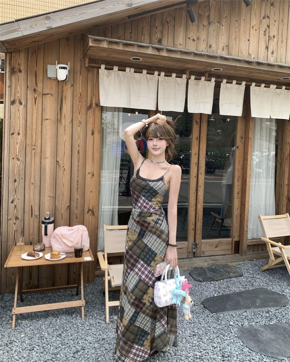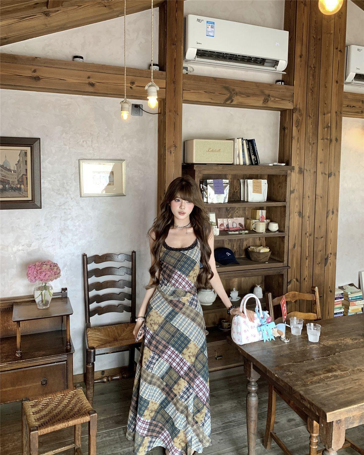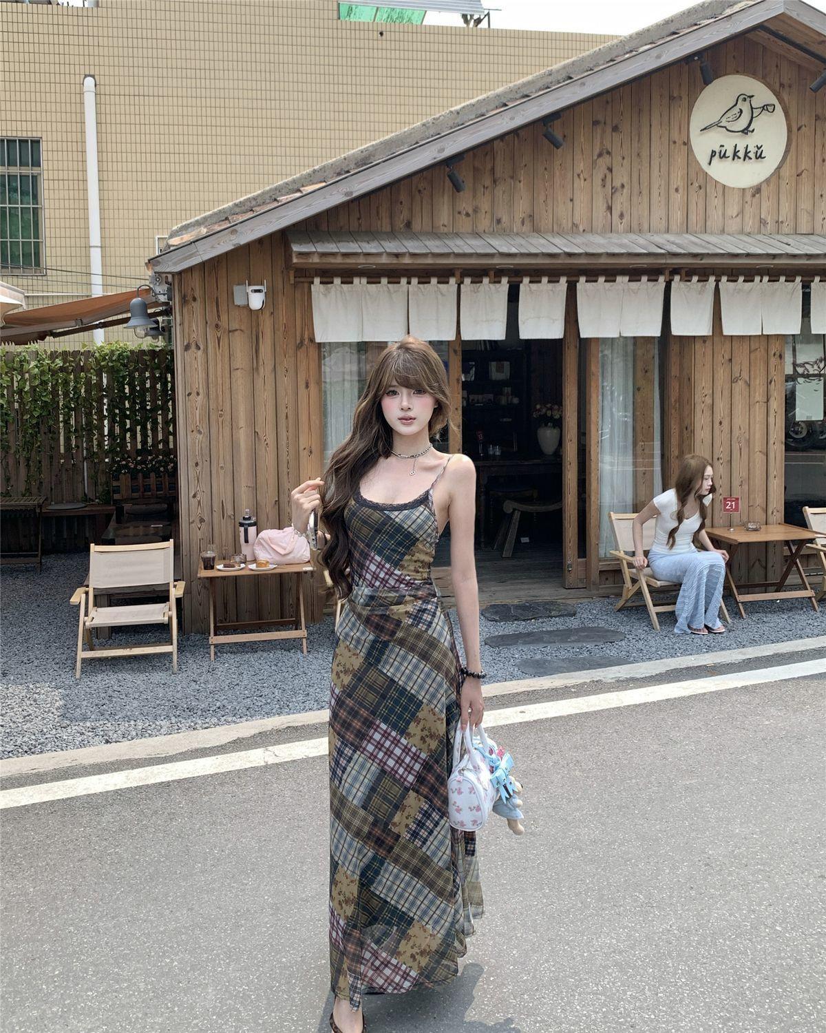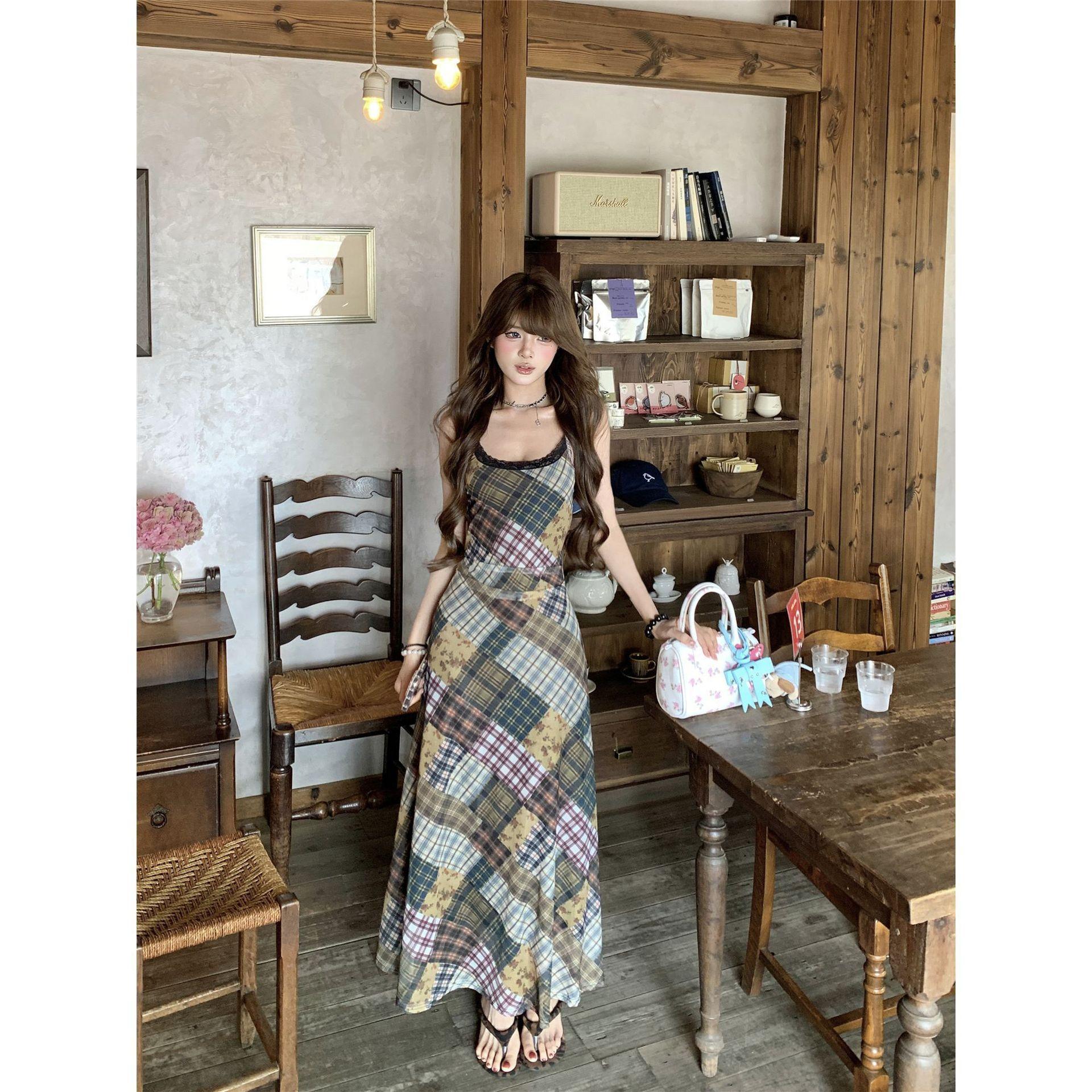Vestido de Malla a Cuadros Color Block Retro Estilo Francés Deseo Puro Verano Encaje Empalmado Adelgazante Ins Chica Caliente Tirantes Espagueti Vestido Largo