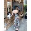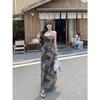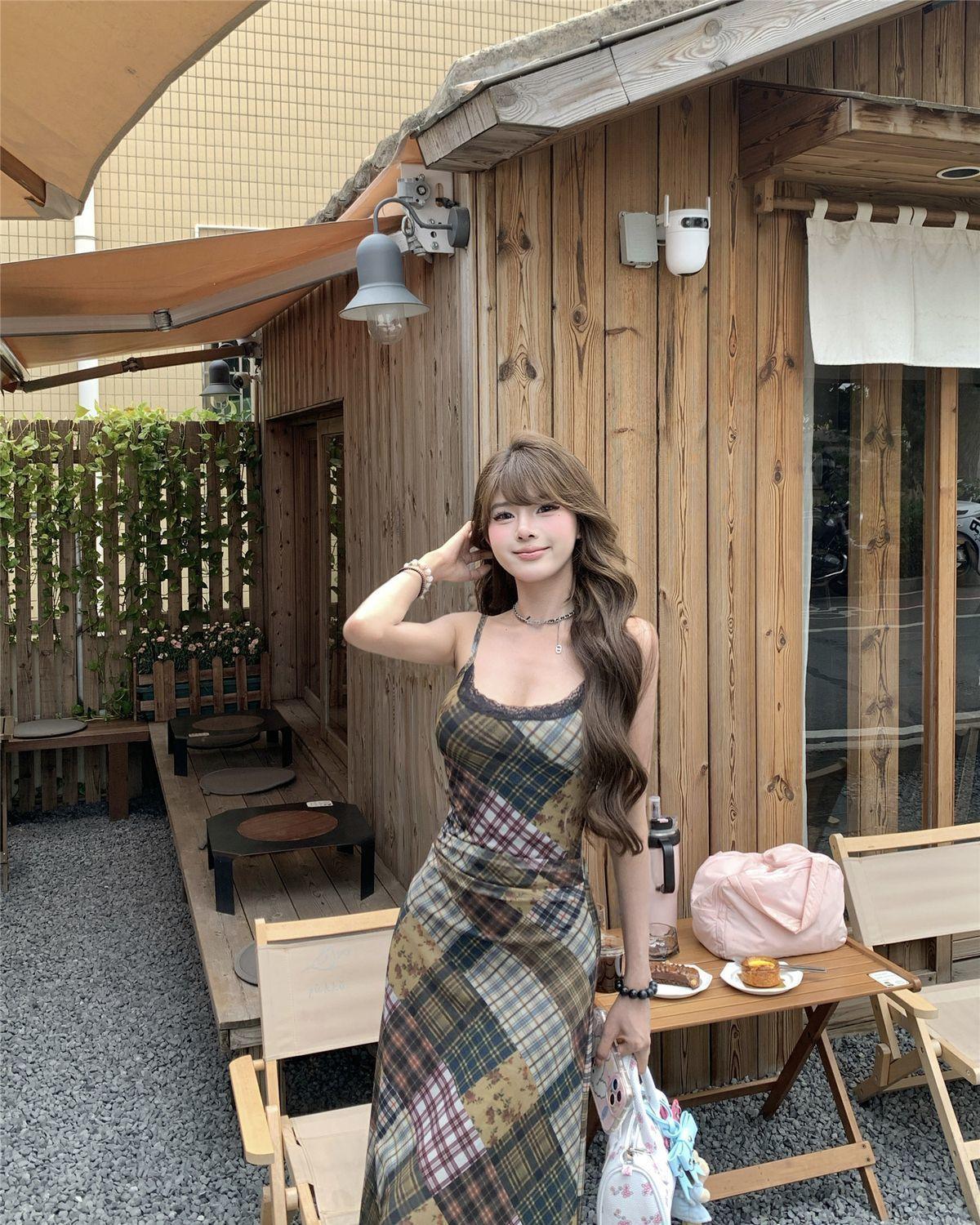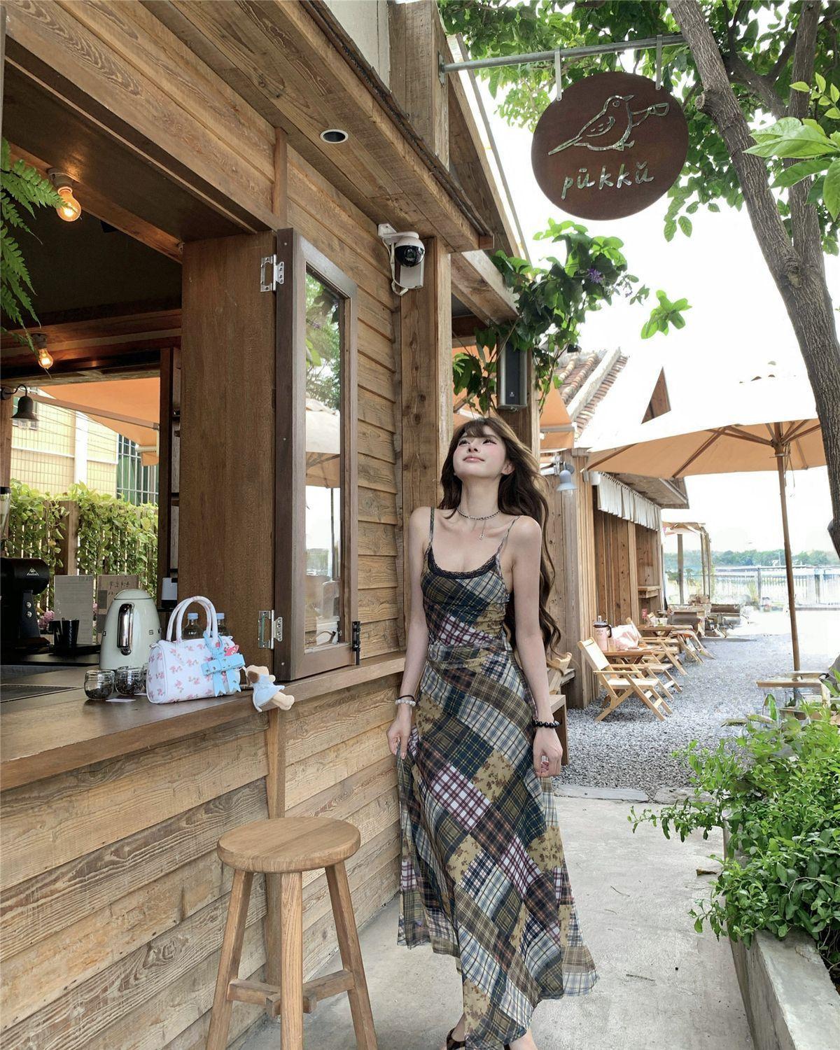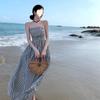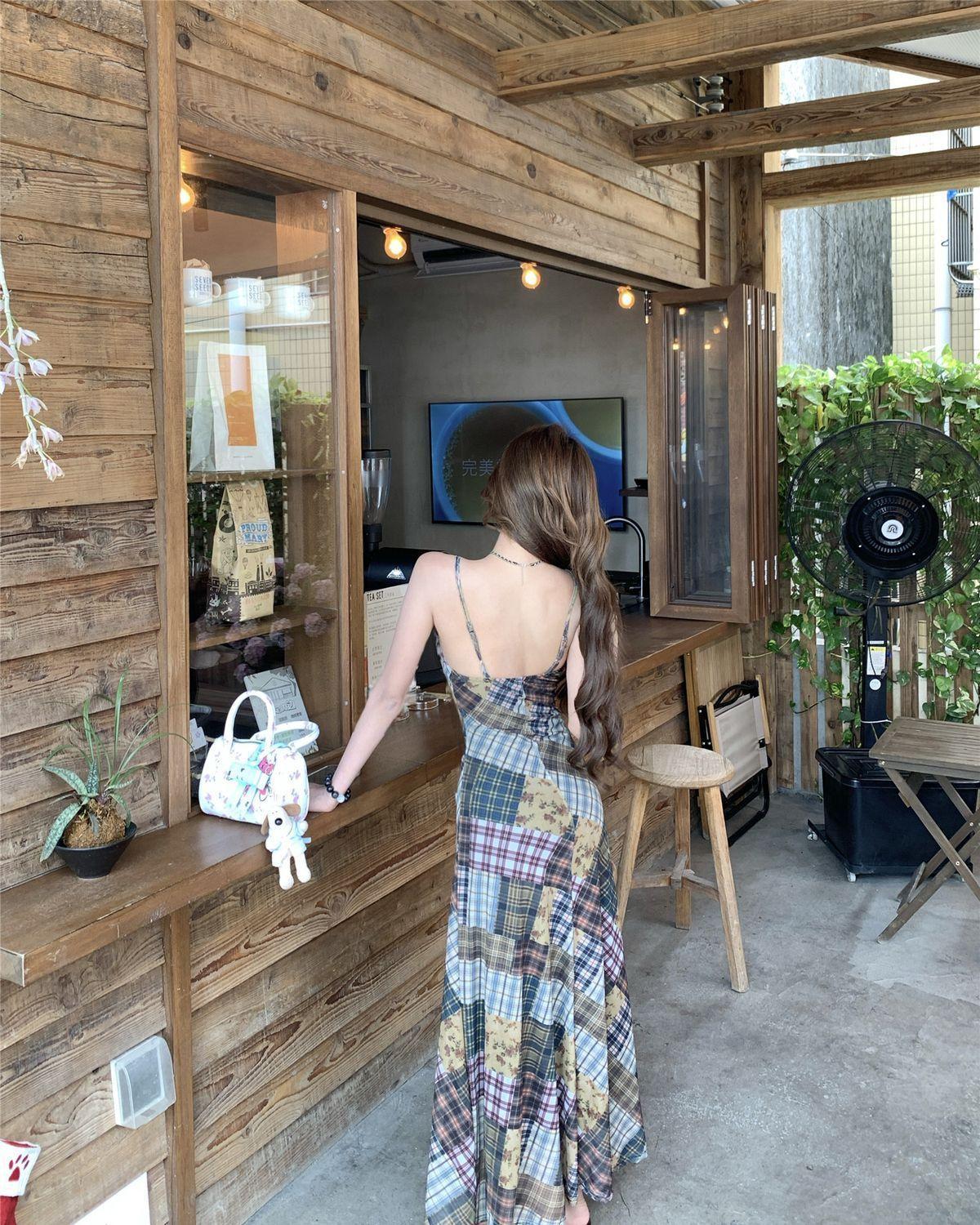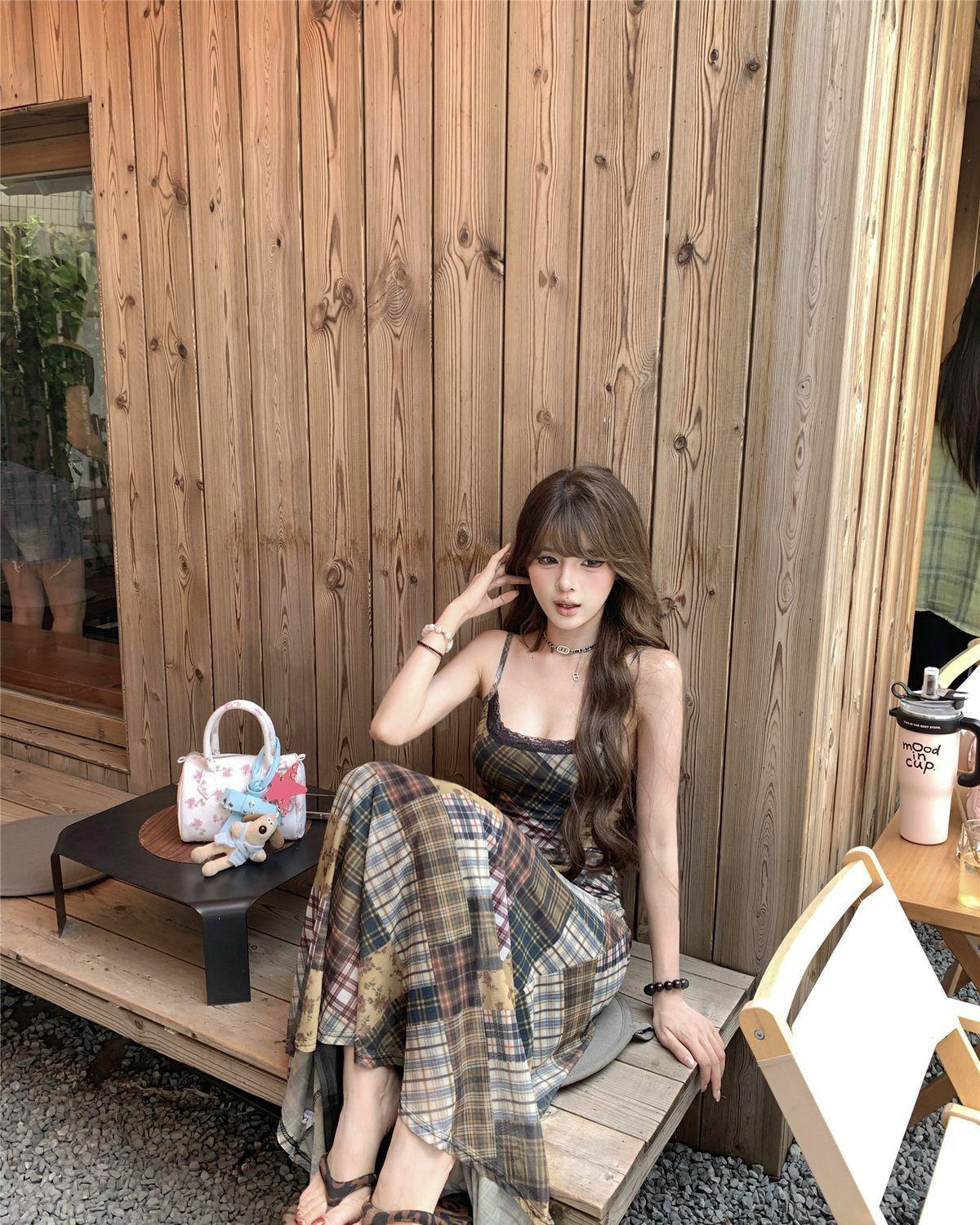 Vestido de Malla a Cuadros Color Block Retro Estilo Francés Deseo Puro Verano Encaje Empalmado Adelgazante Ins Chica Caliente Tirantes Espagueti Vestido Largo