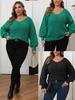Suéter de Talla Grande para Mujer Transfronterizo Europeo y Americano para Mujer Manga Piña Empalmado Cuello V Profundo Tejido Camiseta Básica Casual Jersey